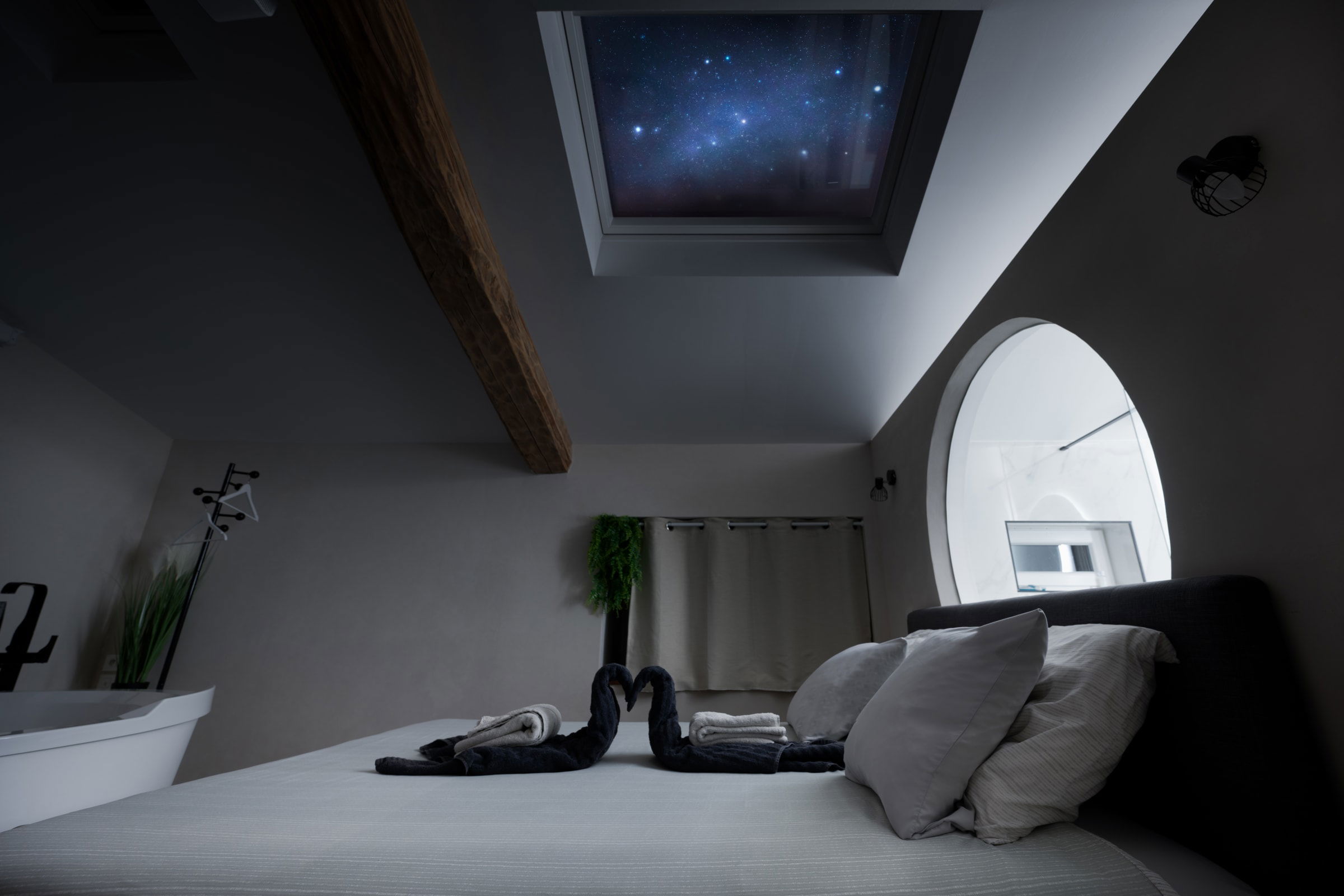 Under the exposed beams, natural light diffuses through the large window and the skylight, allowing you to admire the starry sky from the bed.