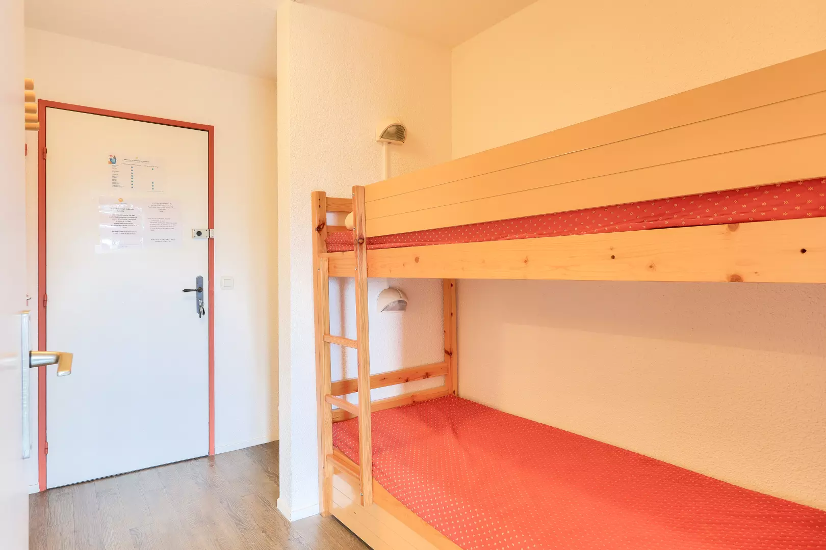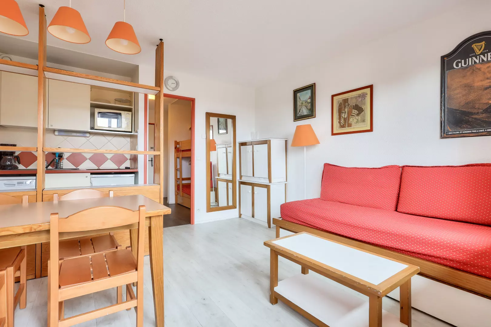 Living room composition: 1 sofa bed and 1 pull-out bed. 1 cabin area (with door): 2 single bunk beds.