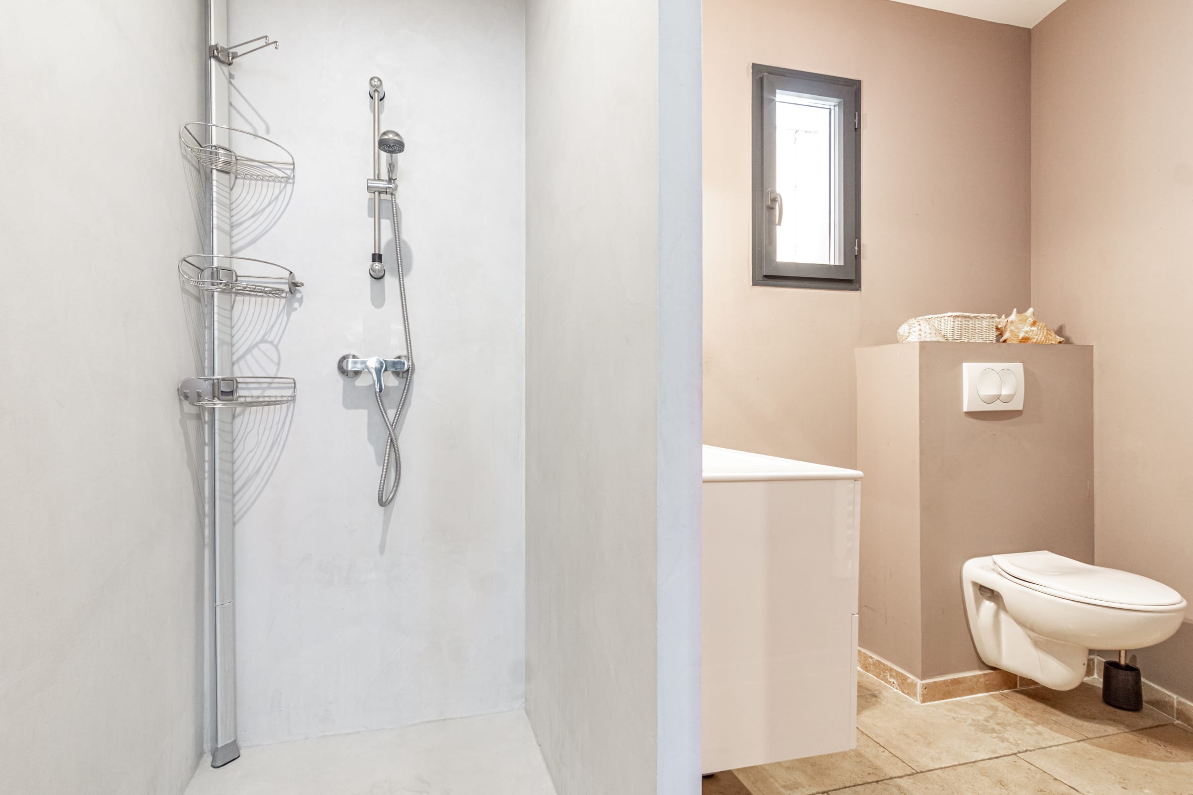 Large living room with open kitchen giving access to a shaded terrace, two bedrooms each with their own bathroom with walk-in shower.