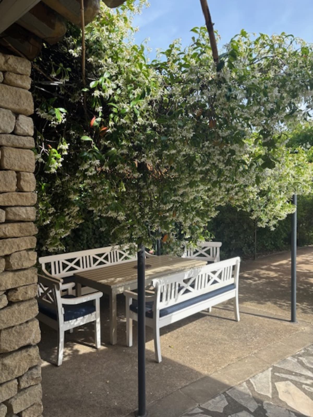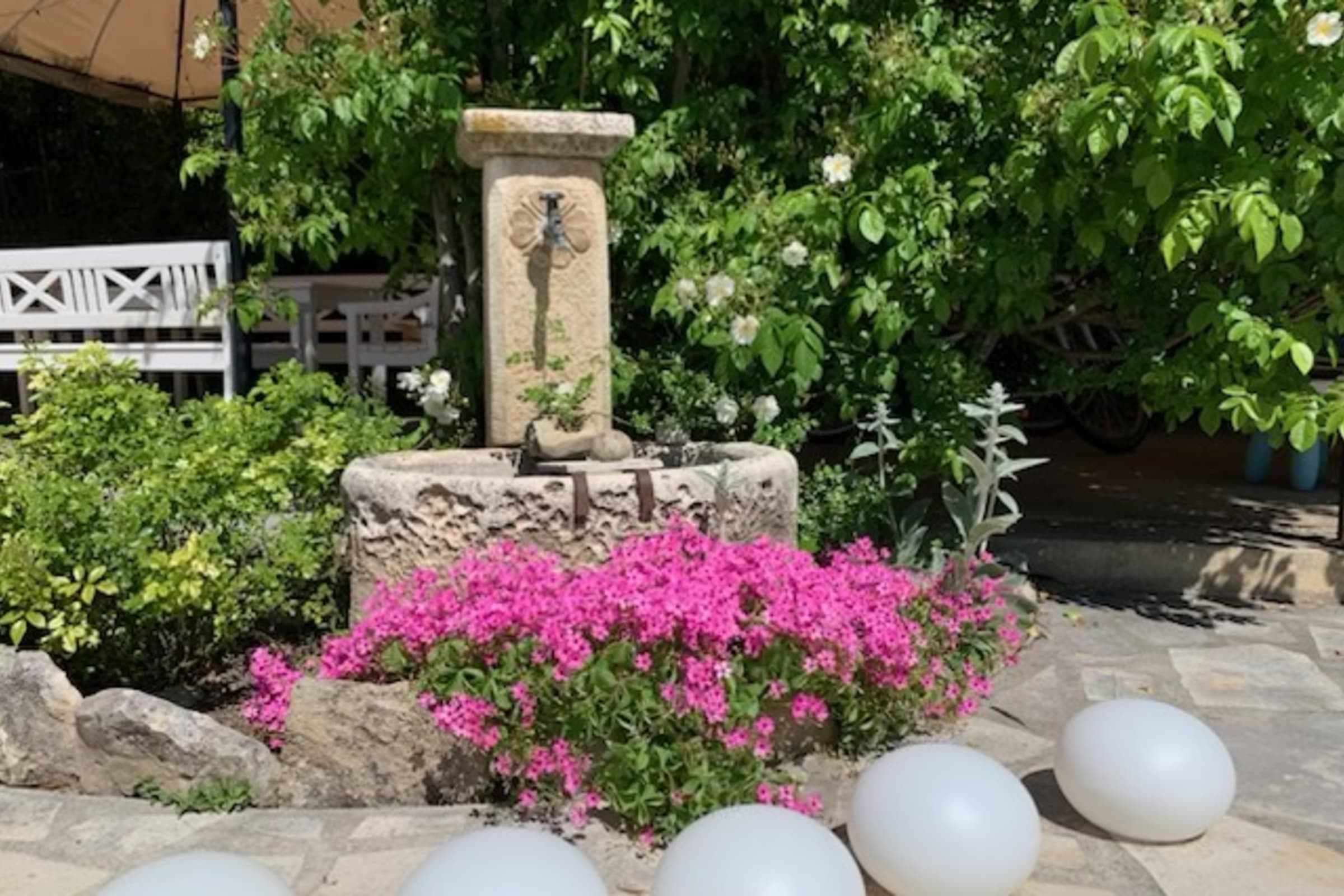 You can relax in this peaceful outdoor area, surrounded by greenery, ideal for relaxation.