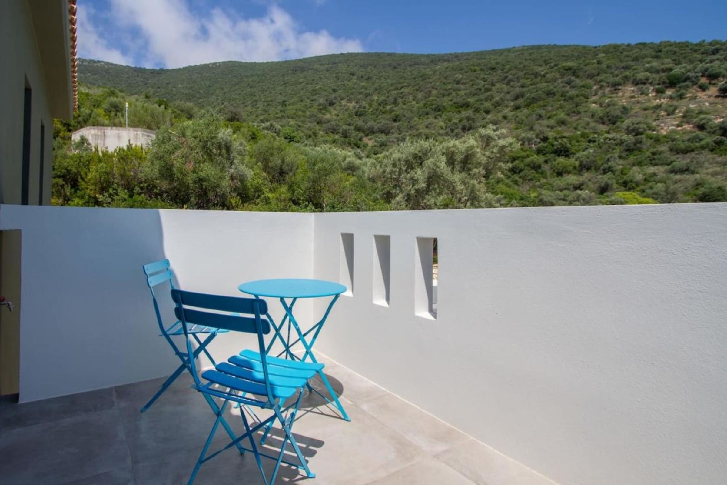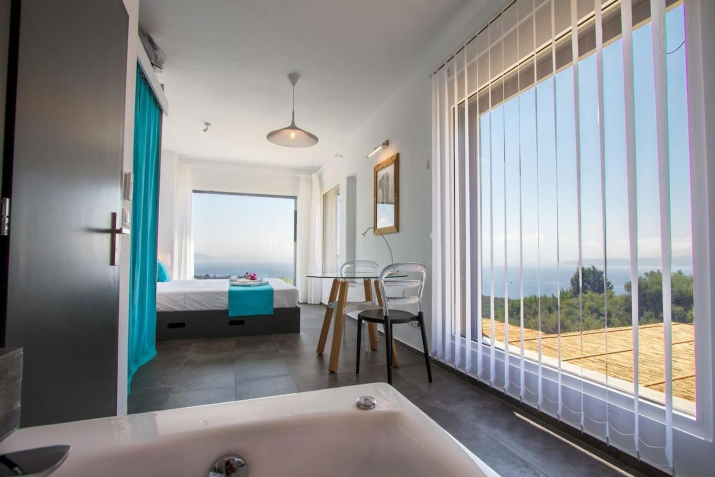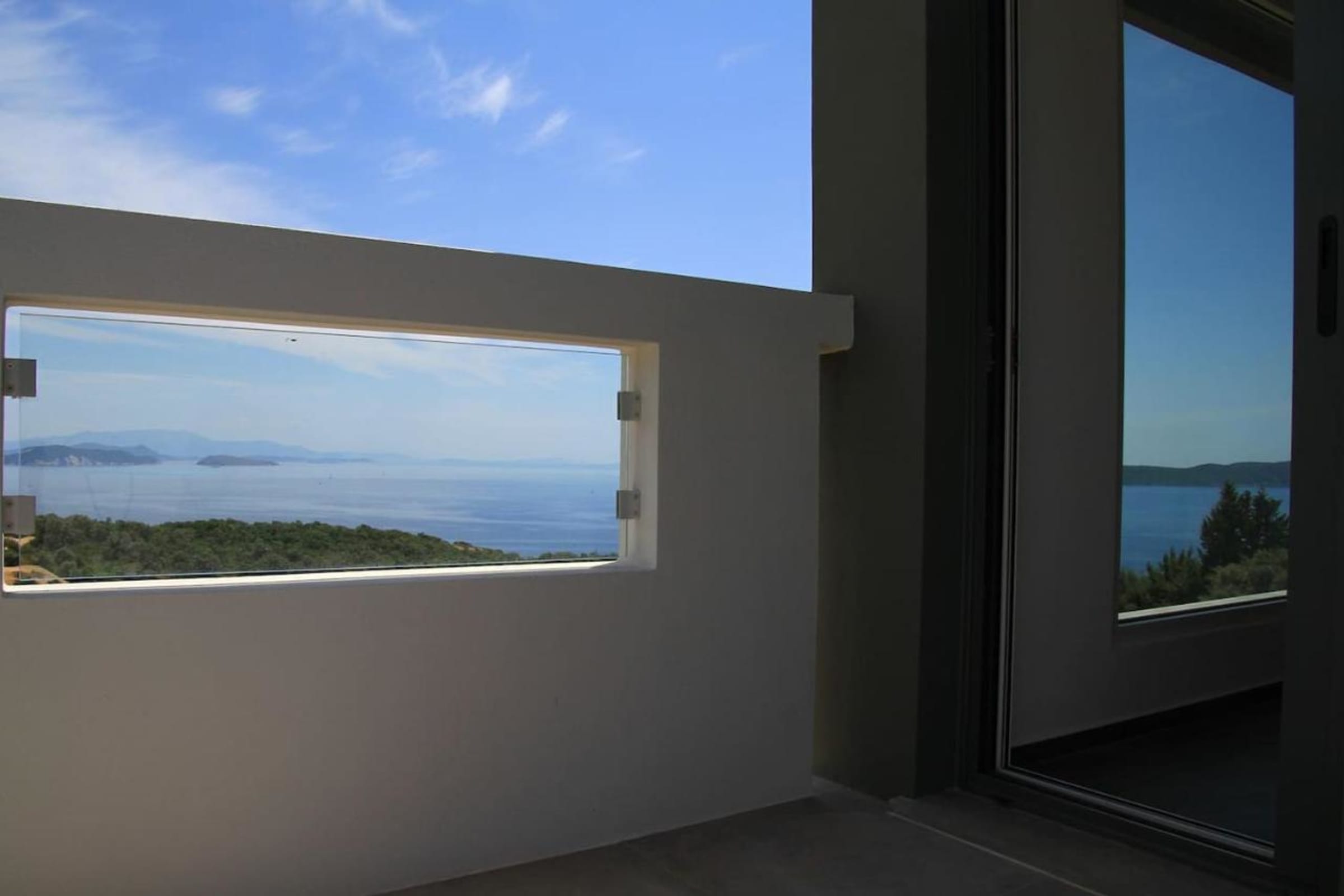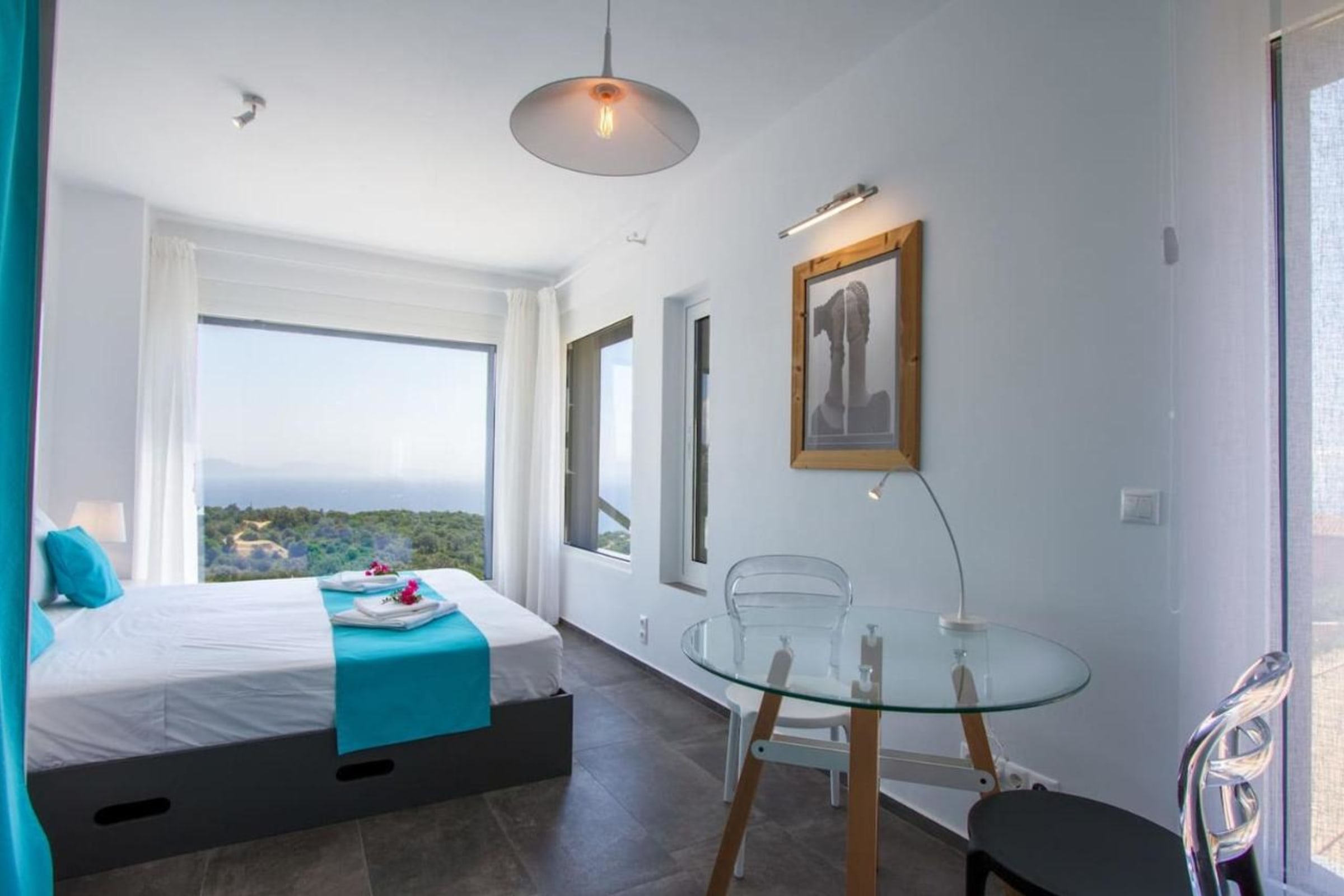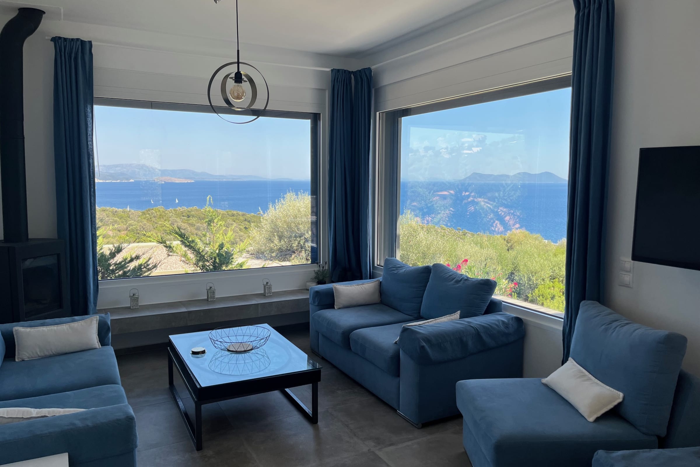 Living Room: The living area features a fire stove, plus floor to ceiling windows commanding breathtaking views of the Ionian sea stretching to the horizon