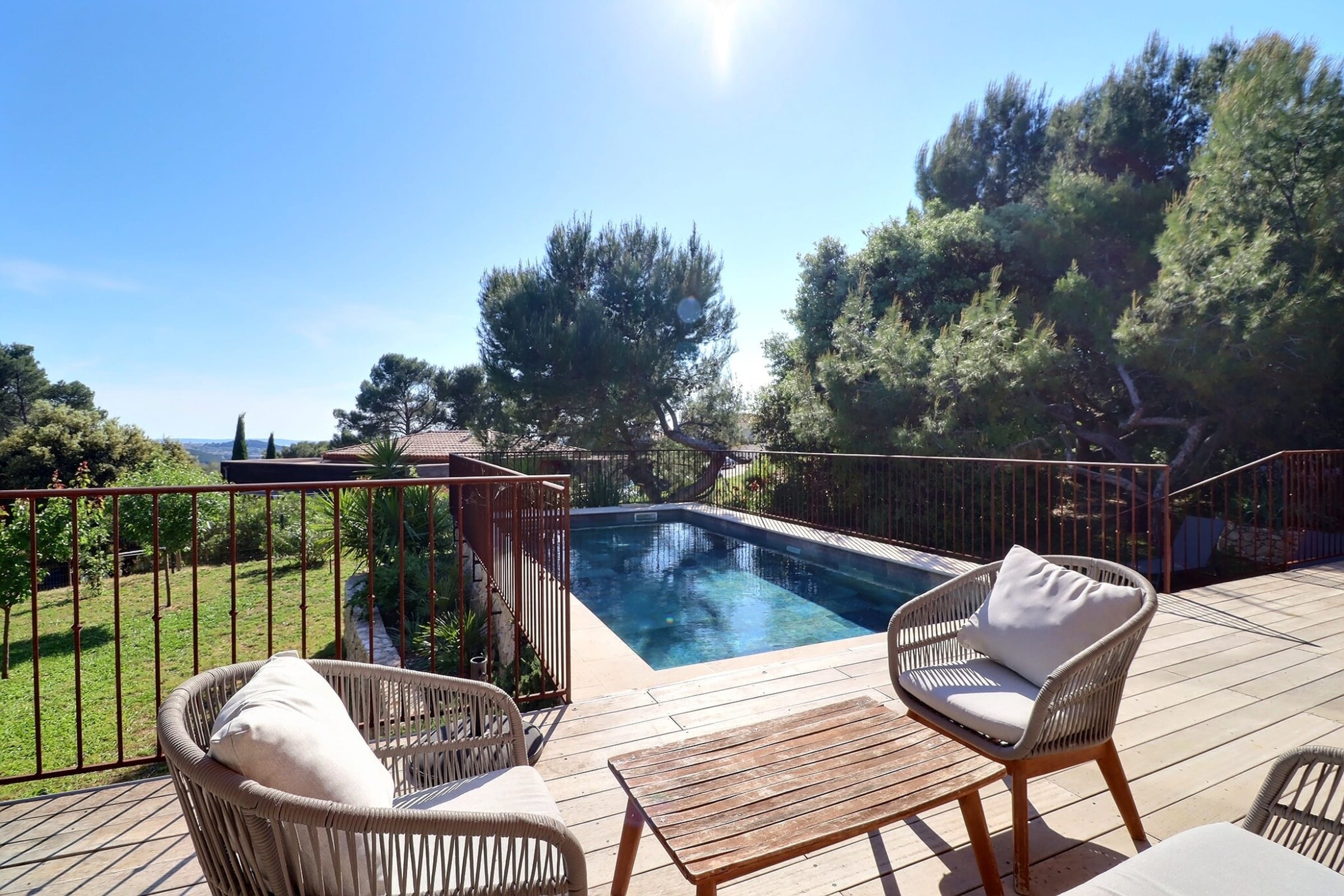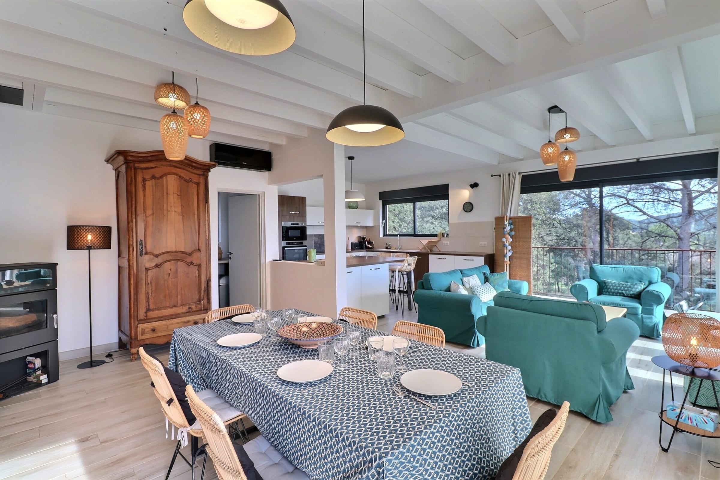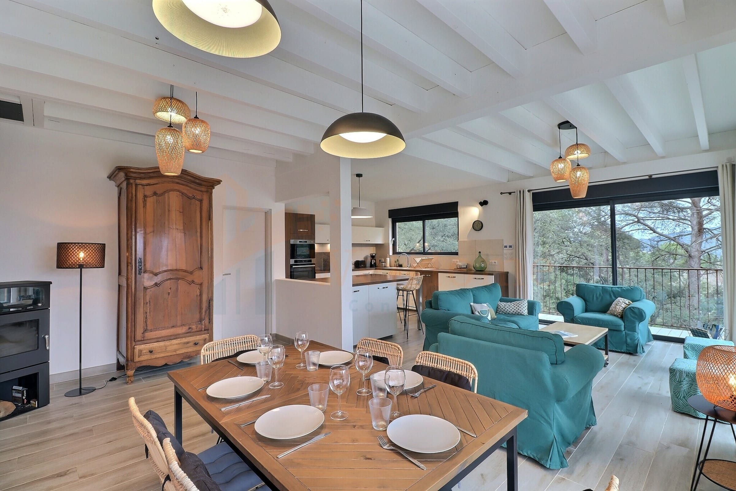 Built in wood, this contemporary villa is brand new and thoughtfully designed to offer an atmosphere that is both elegant and welcoming. The interior decor, firmly modern, has been carefully curated to provide an immediate sense of well-being. Several tastefully furnished terraces extend the living areas outdoors, beneath the shade of pine trees.