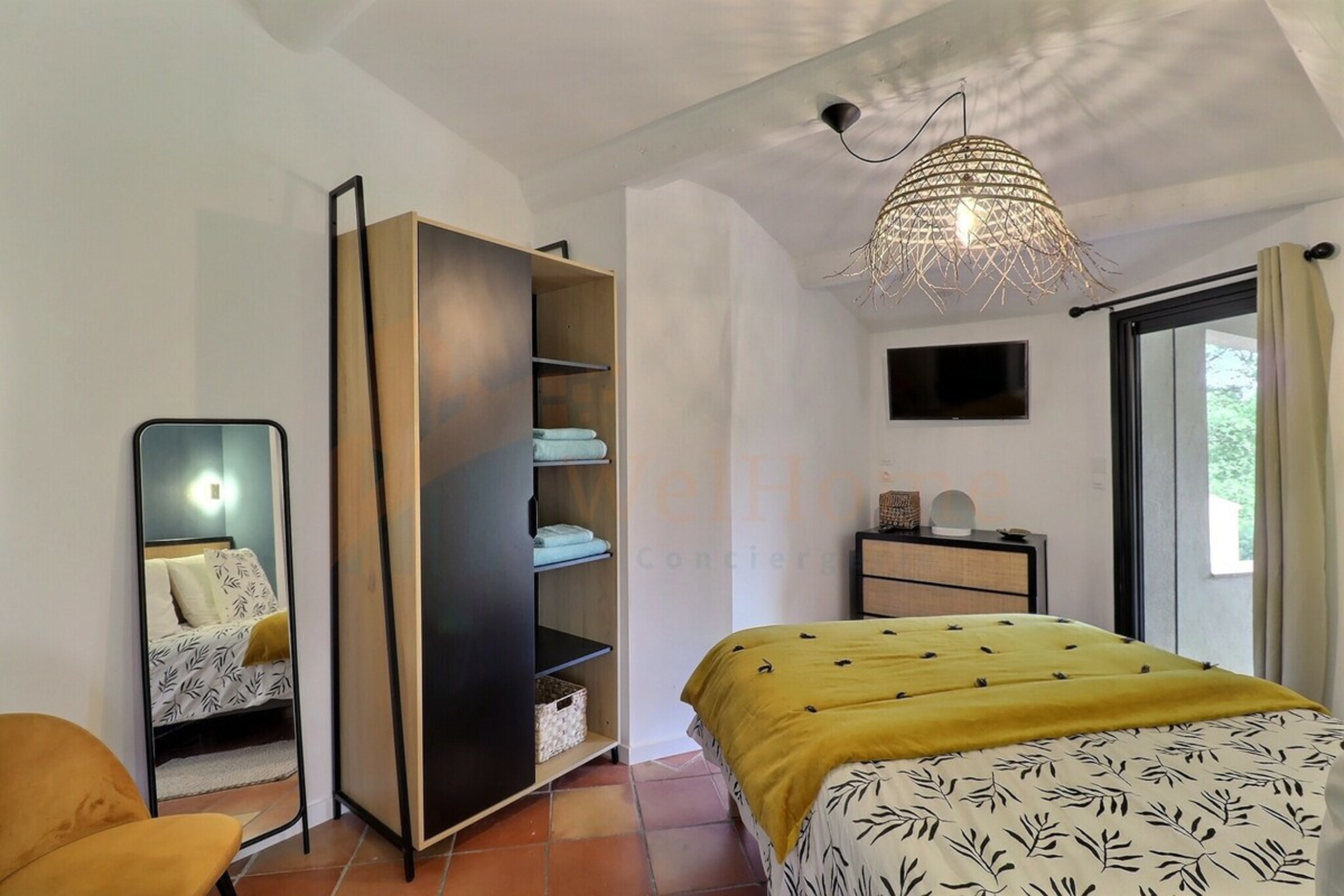 The room, a real cocoon of tranquility, has a double bed (140x200), storage space and direct access to the terrace. Wake up every morning with a breathtaking view of Provencal nature. The modern bathroom completes the space with a shower, a vanity unit and a toilet. Sheets and towels are provided for a worry-free stay.