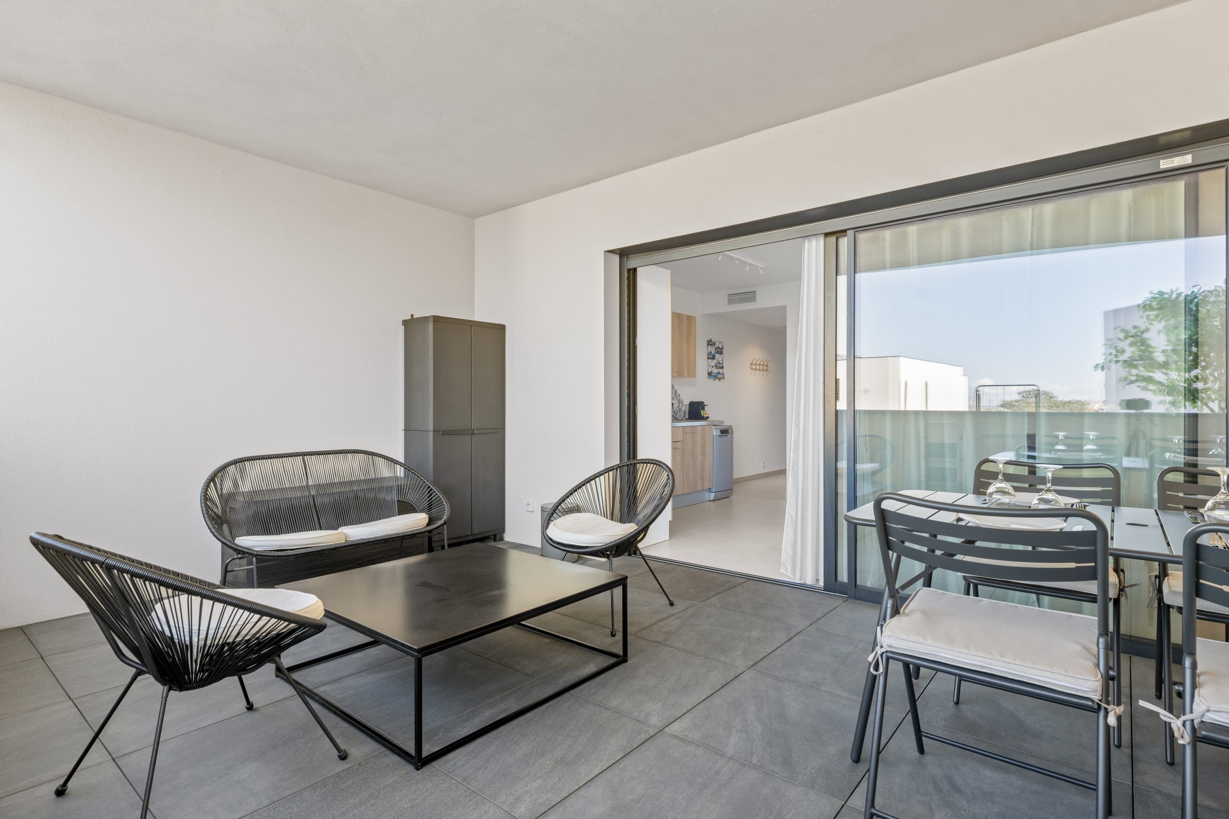 Outside, the large east-facing terrace is ideal for outdoor dining or shaded relaxation. Picture yourself enjoying a barbecue on the plancha grill or simply lounging on the comfortable sofas with a good book.