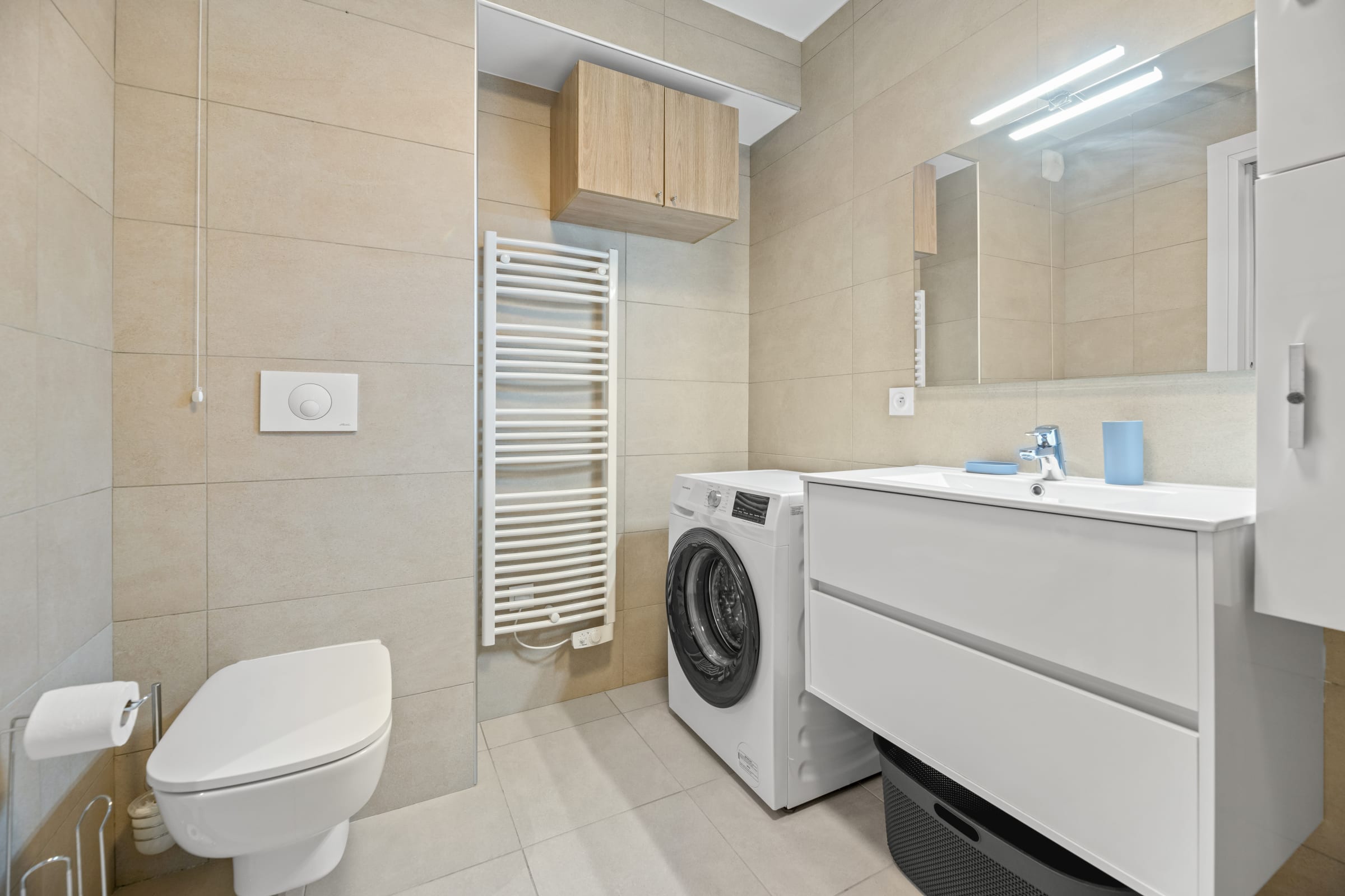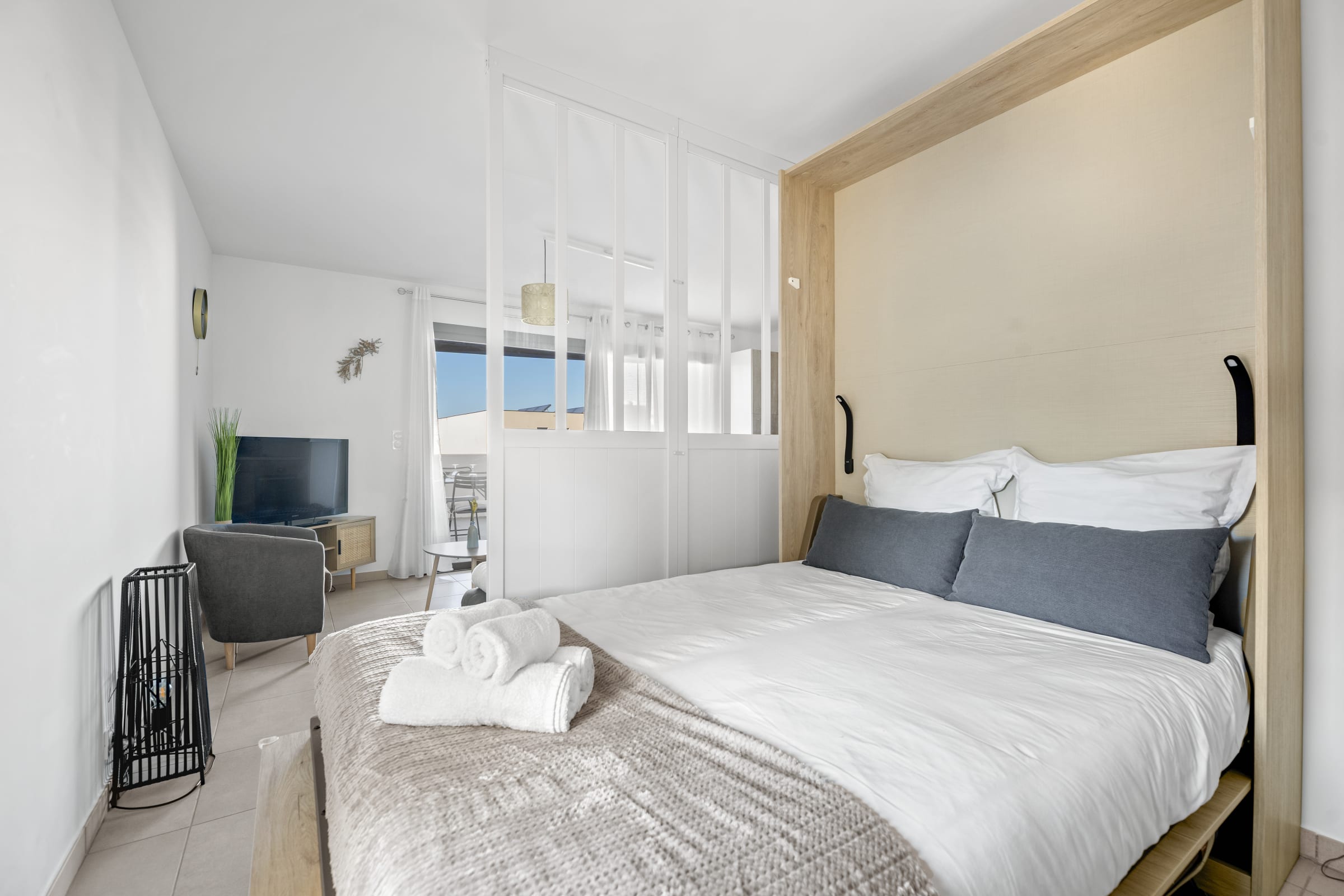 The air-conditioned sleeping area welcomes you with a foldaway double bed (140x200 cm) and practical storage spaces to make you feel at home. The elegant and functional bathroom features a shower, a wall-mounted toilet, and a stylish towel warmer, with towels provided for your comfort. A washing machine, steamer, and drying rack are also available for your convenience.