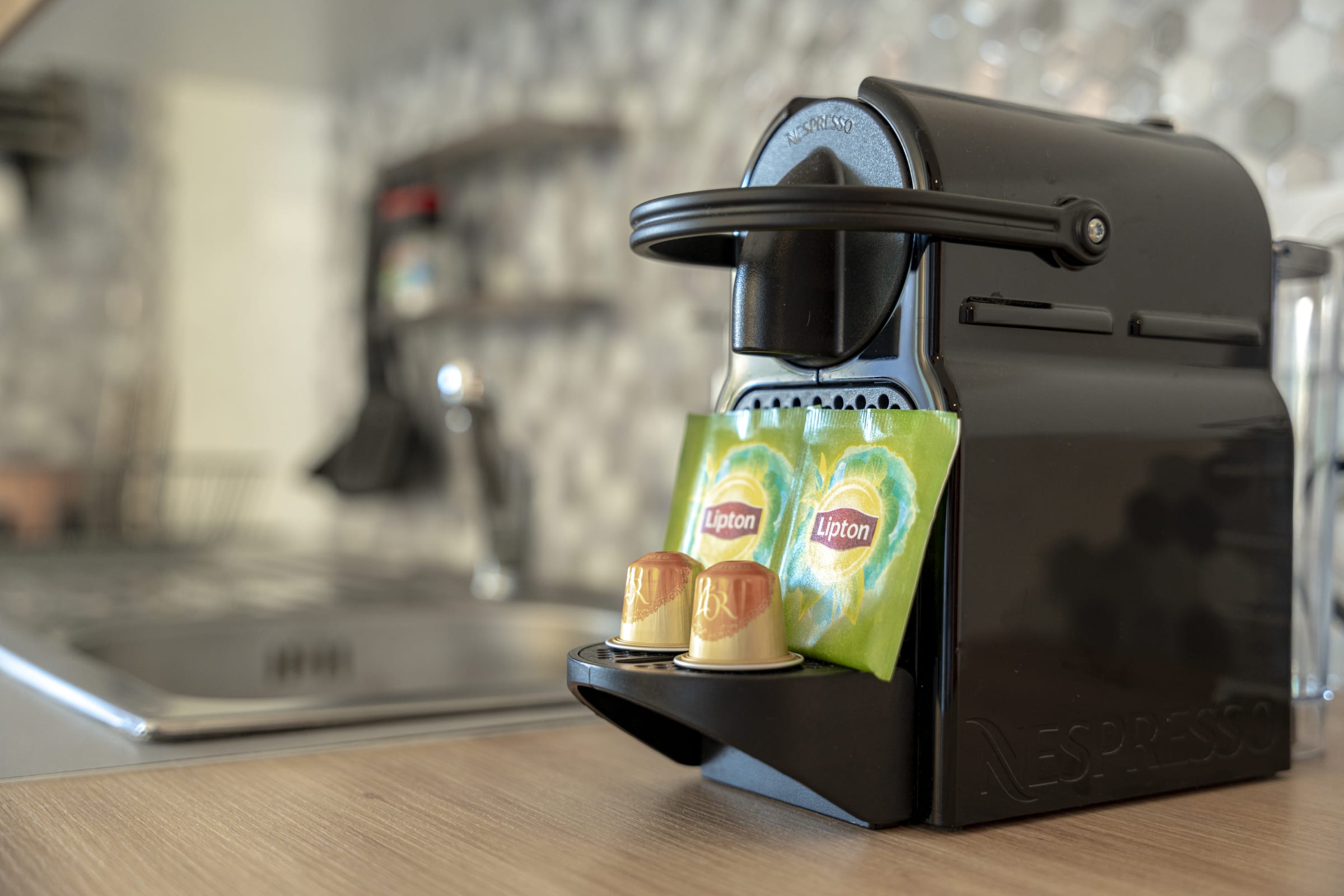 Inside, every detail has been thoughtfully designed to make your stay as enjoyable as possible. The cozy living room, equipped with a two-seater sofa and a TV, is the ideal spot to unwind after a day of adventures, whether at the beach or exploring nearby hiking trails. The modern, fully equipped kitchen (ceramic cooktop, microwave, Nespresso coffee machine, refrigerator with freezer) allows you to easily prepare delicious meals.