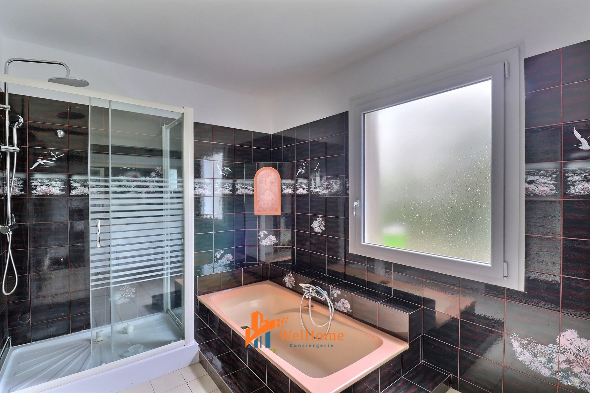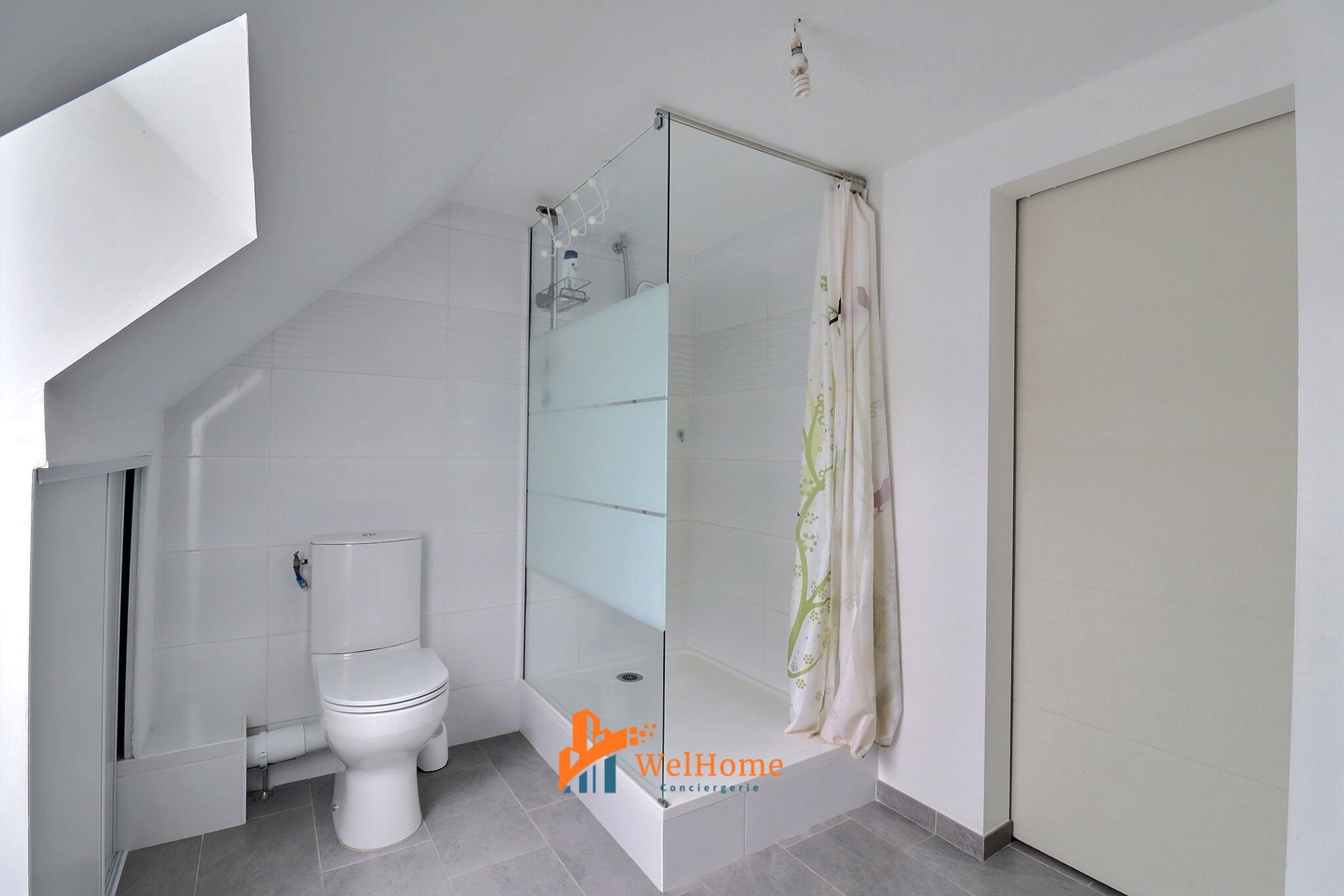 On the ground floor, a comfortable bedroom with a 160x200 bed offers a peaceful space for the night. The bathroom is equipped with a shower, a bathtub and two sinks, and a separate toilet adds to the practicality.