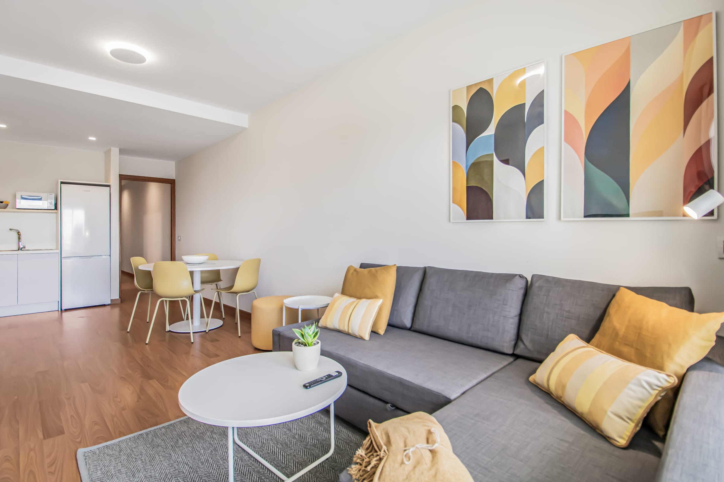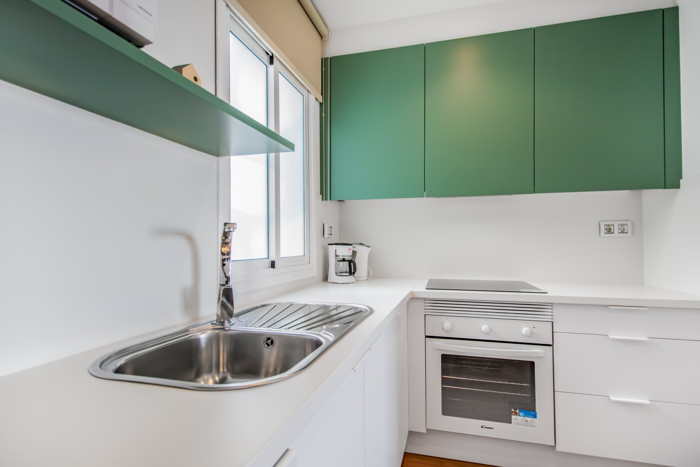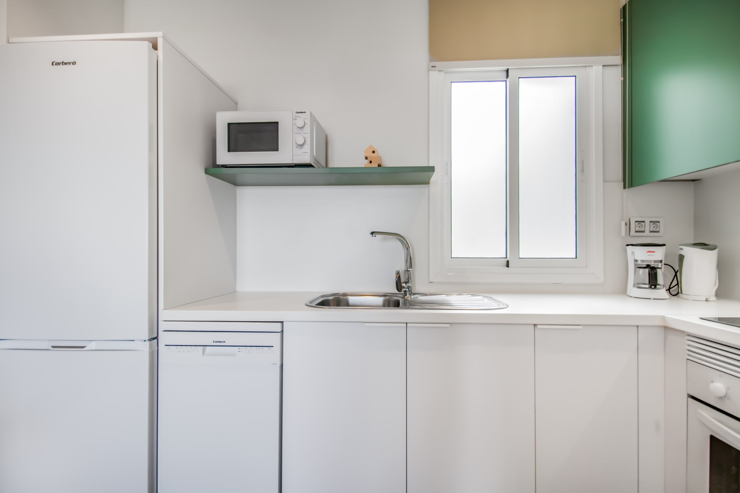 The apartment offers a modern kitchen equipped with everything you need for your stay, from appliances to utensils.