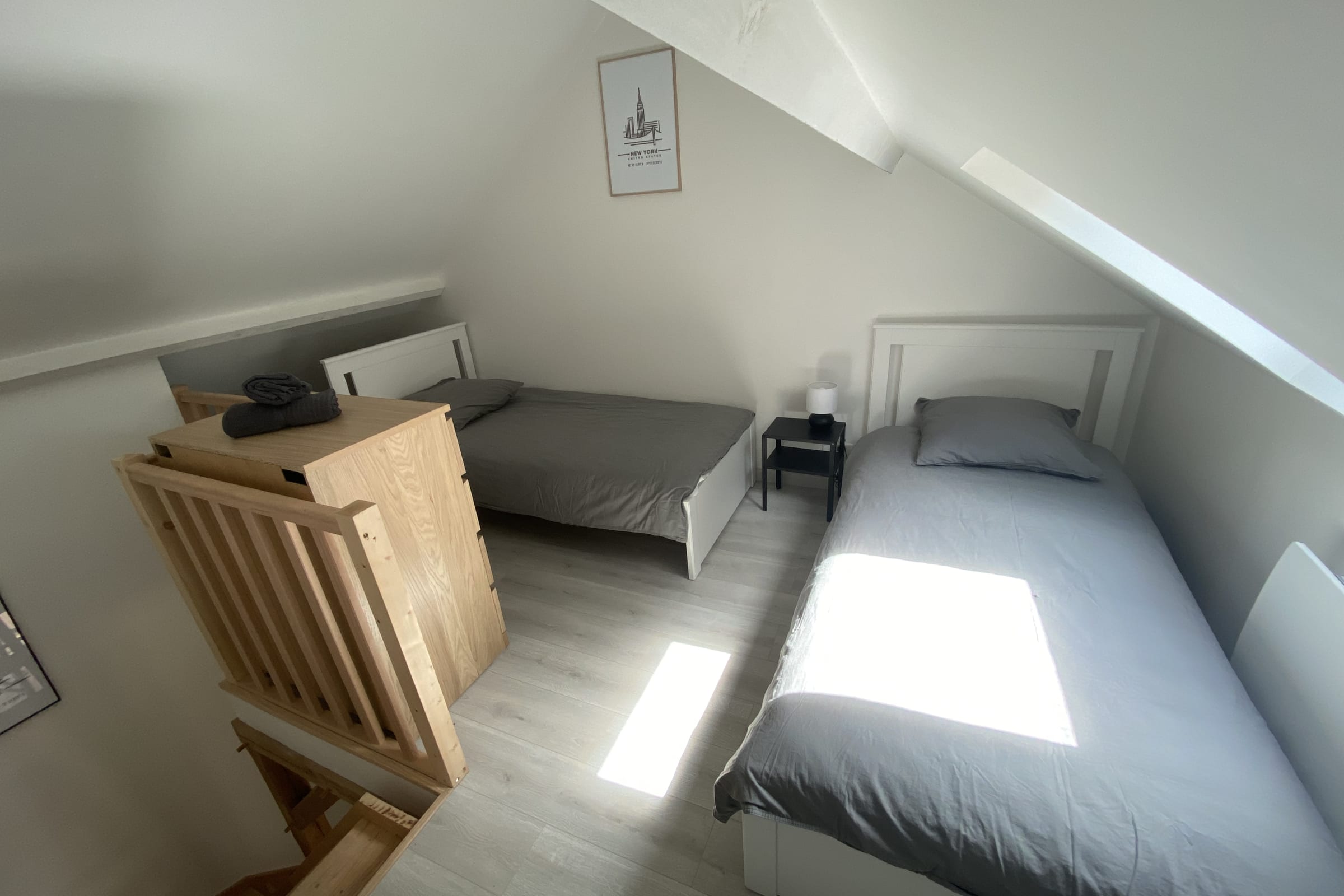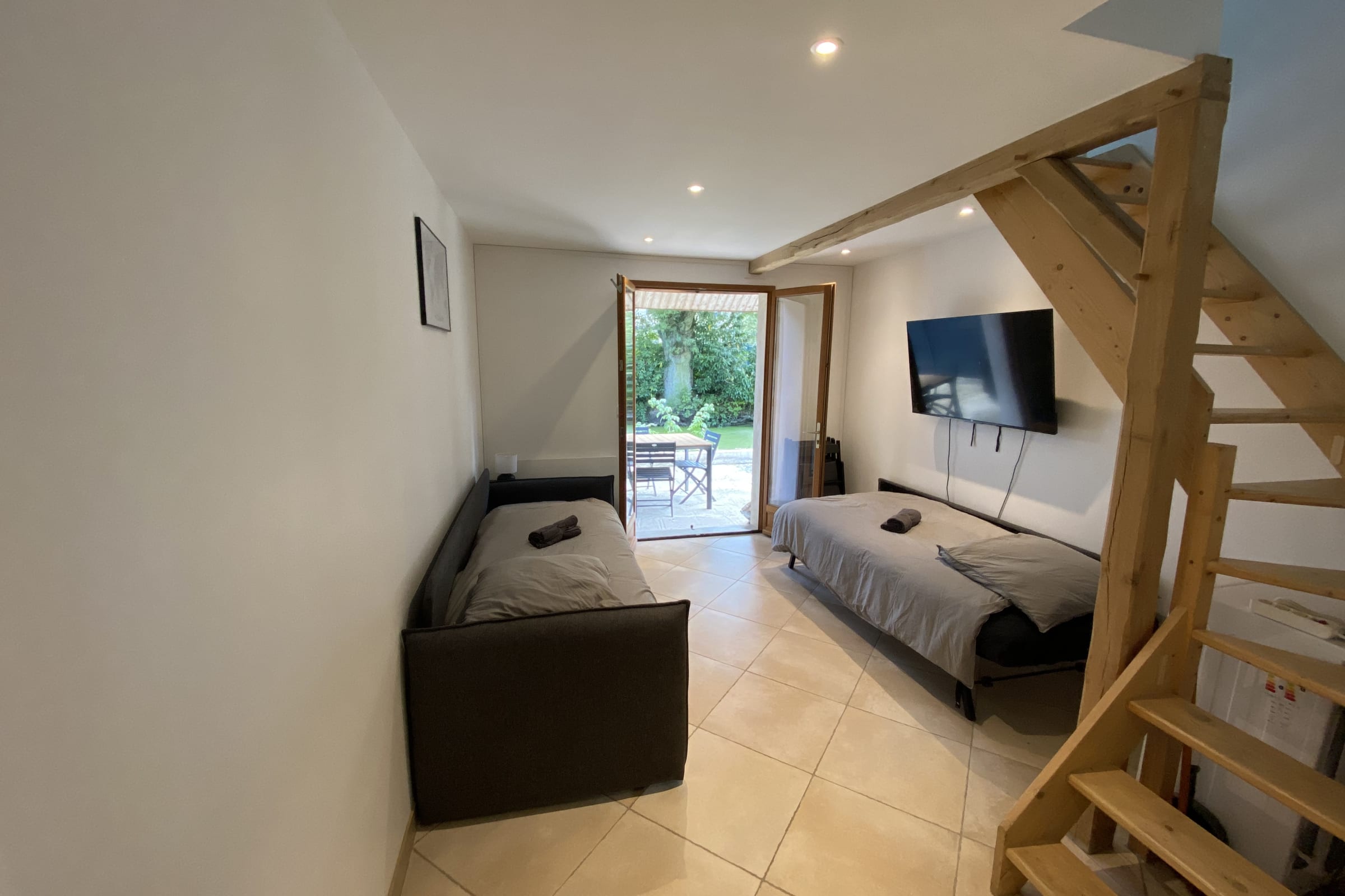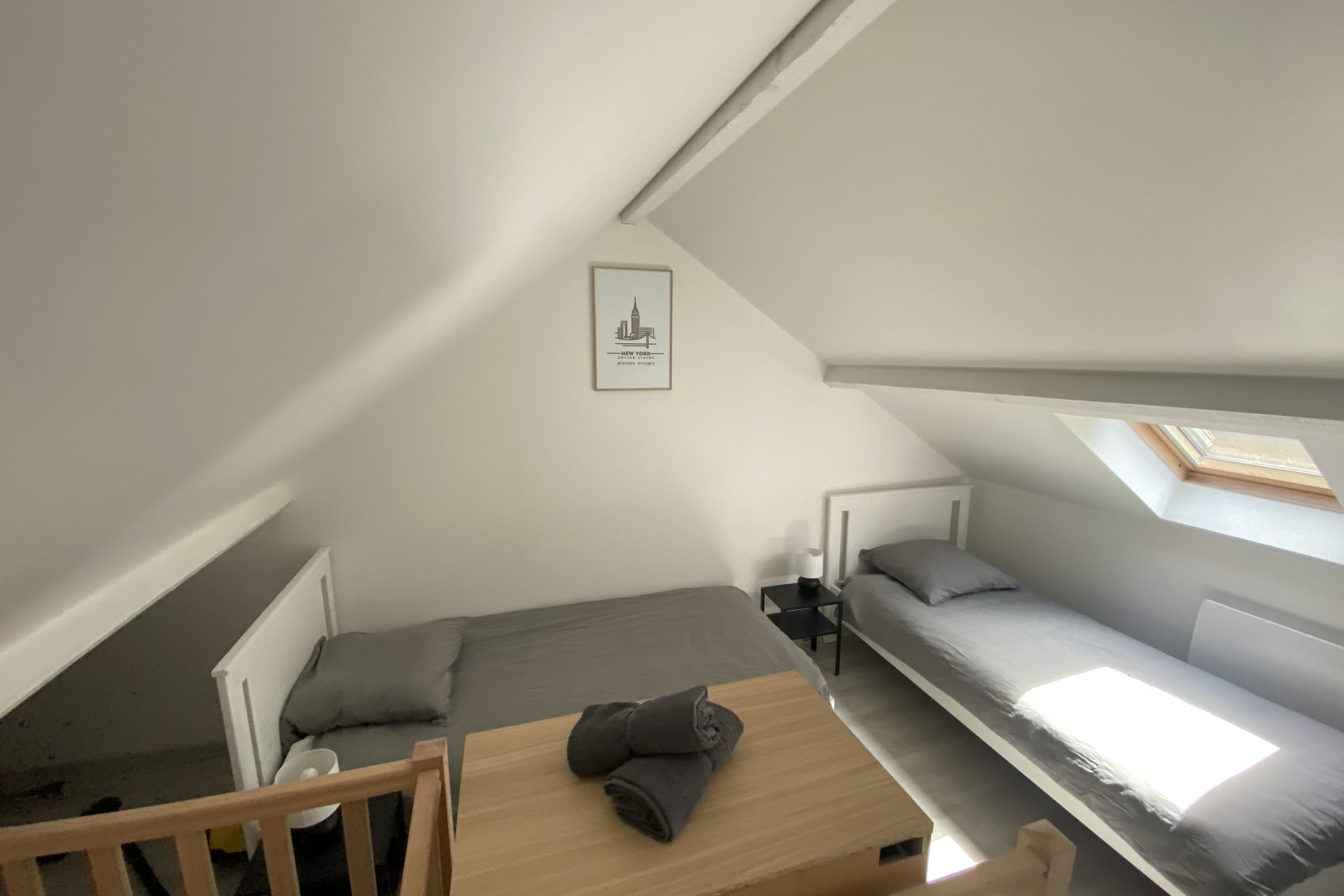 Le logement dispose de 4 couchages : 2 lits simple à l'étage et un canapé lit convertible très confortable de la marque EMMA dans le salon . Il est possible de convertir le canapé lit en 2 lits simples (2 lits de 80x200) ou en 1 lit double de 160x200.