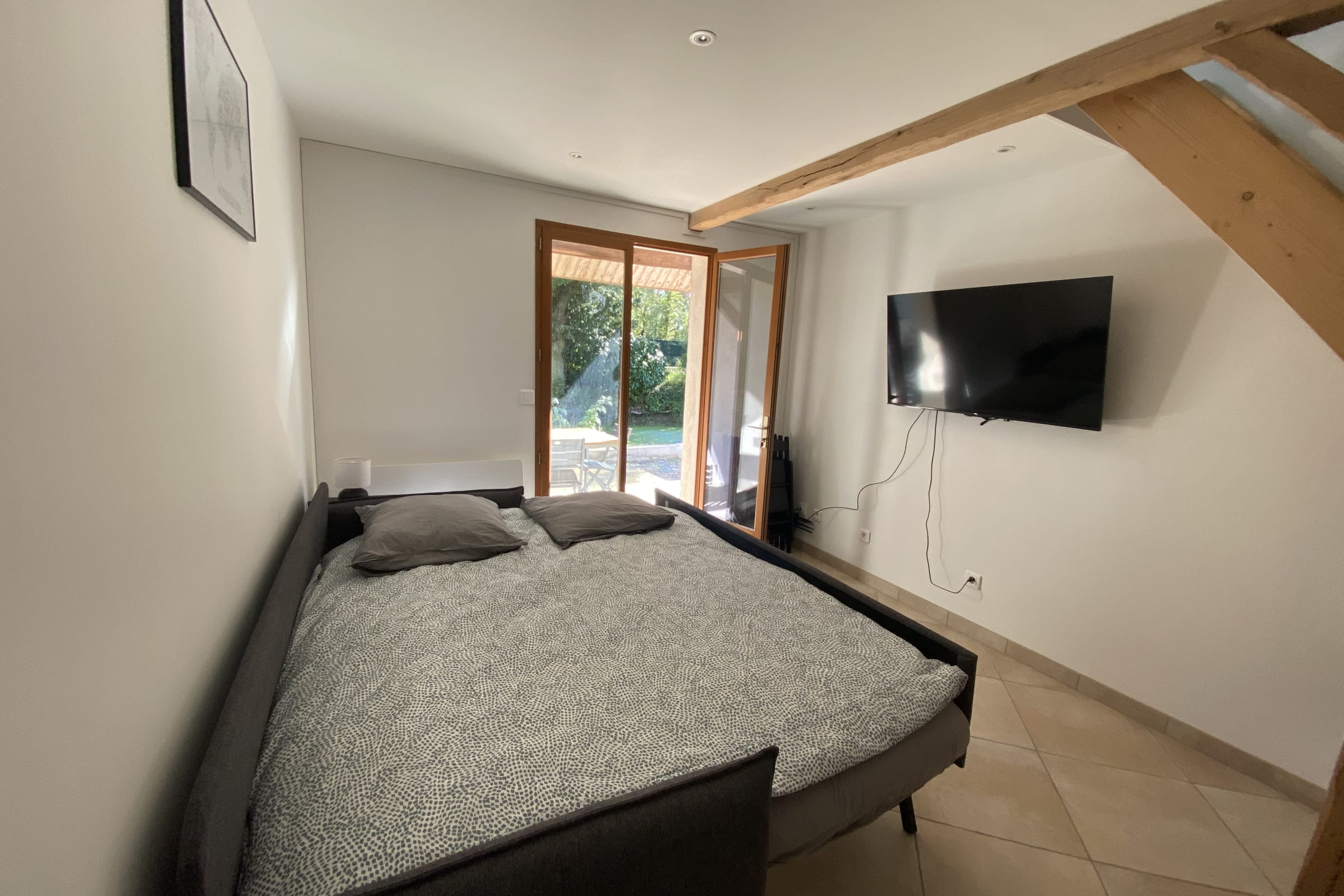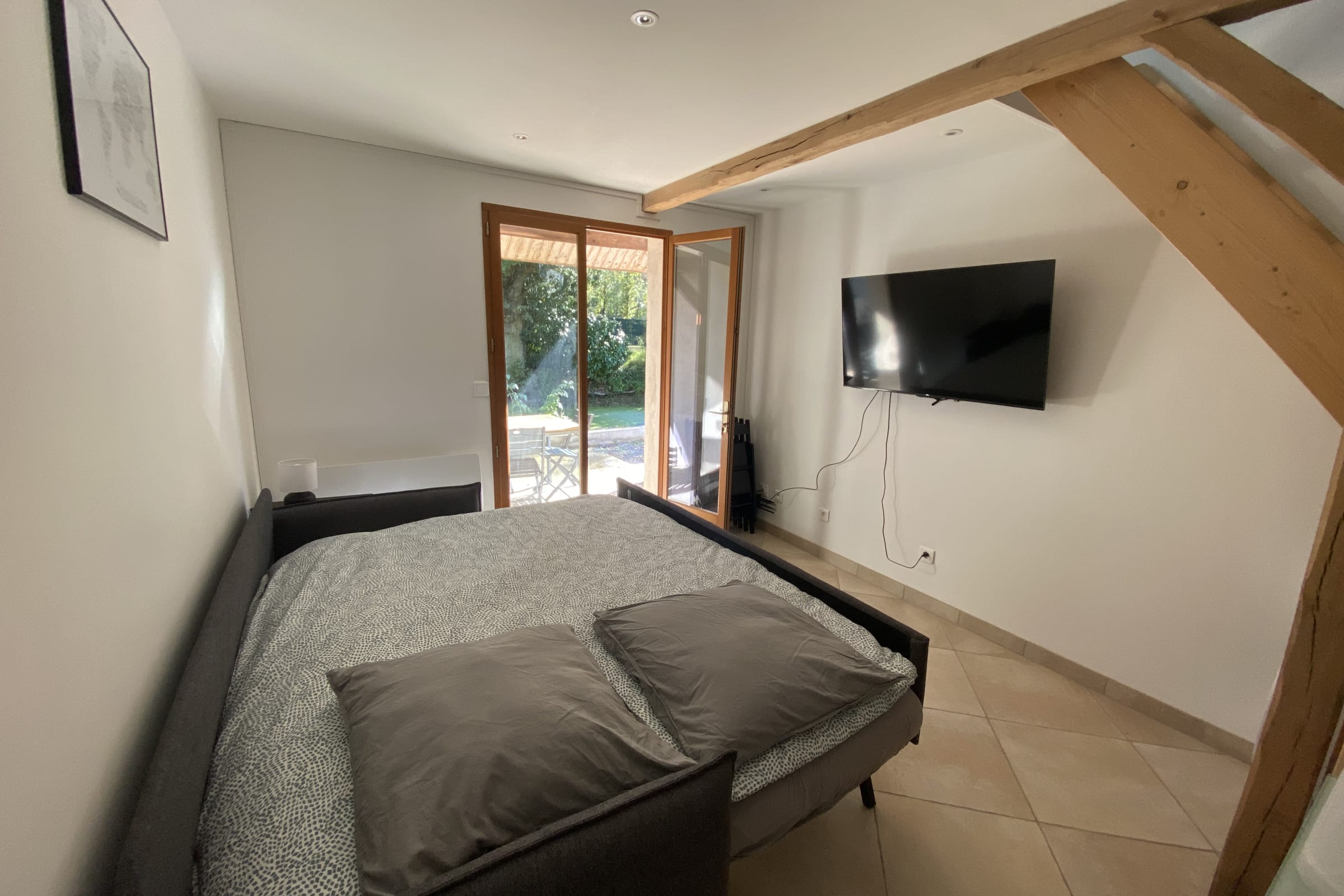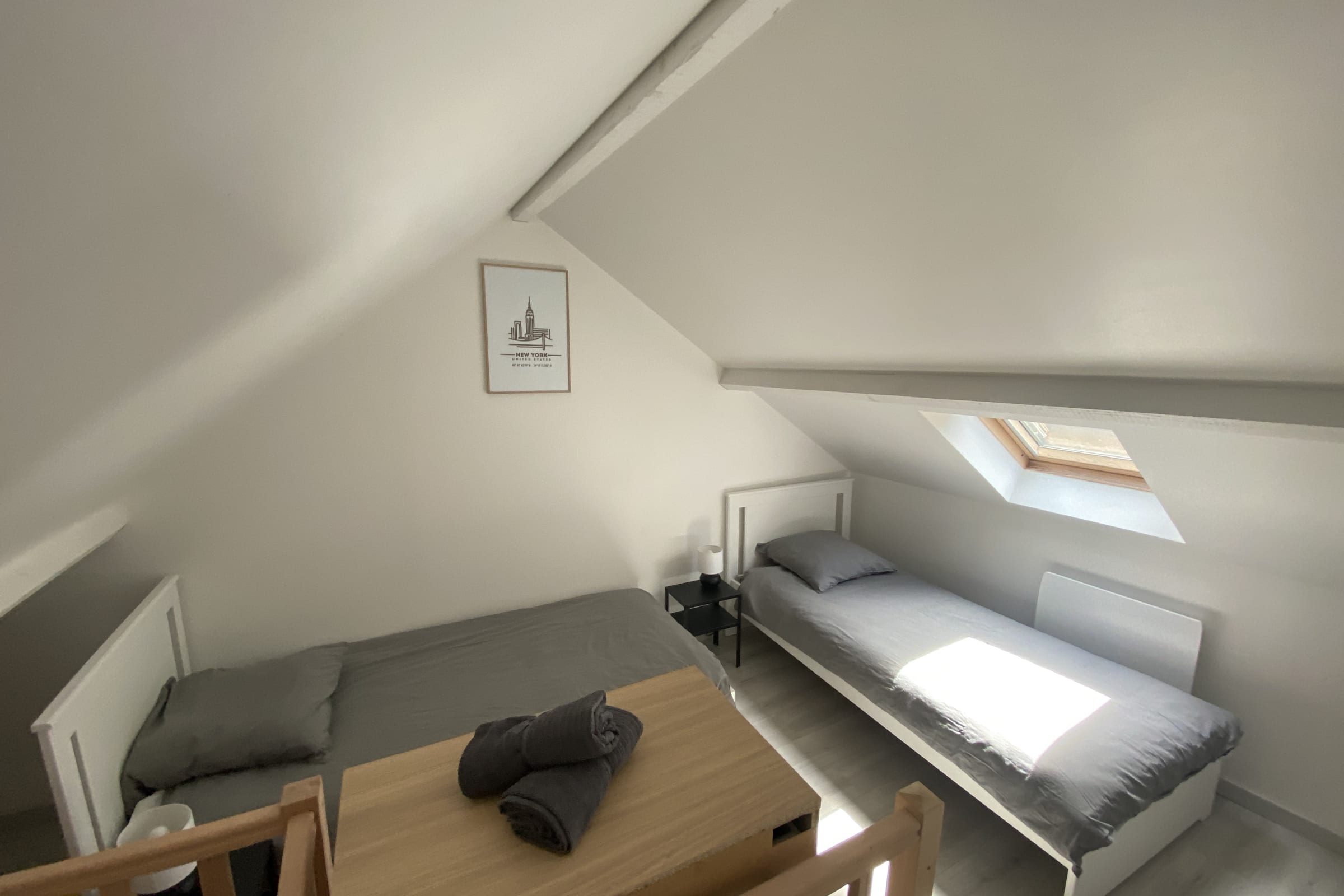 Le logement dispose de 4 couchages : 2 lits simple à l'étage et un canapé lit convertible très confortable de la marque EMMA dans le salon . Il est possible de convertir le canapé lit en 2 lits simples (2 lits de 80x200) ou en 1 lit double de 160x200.