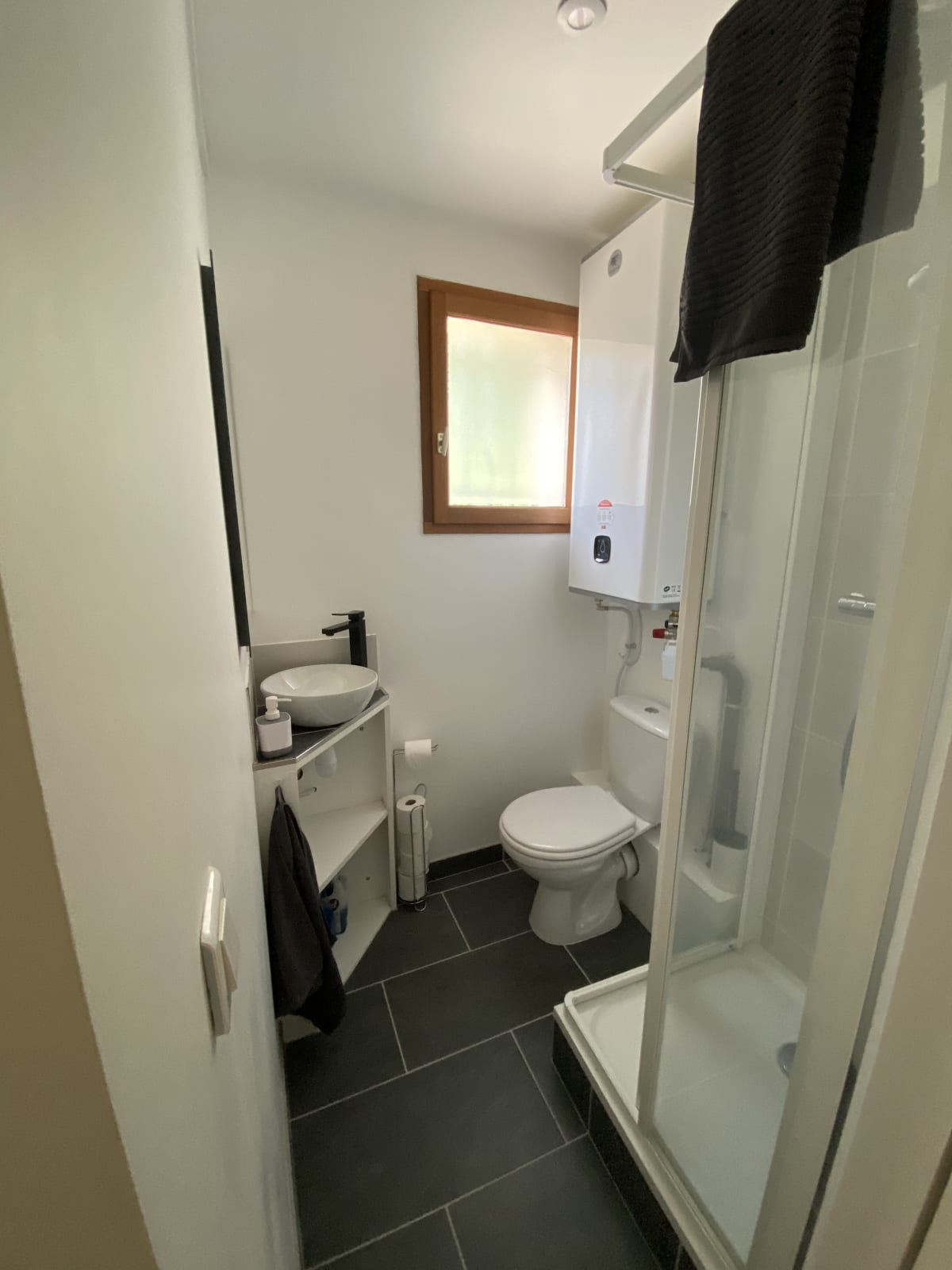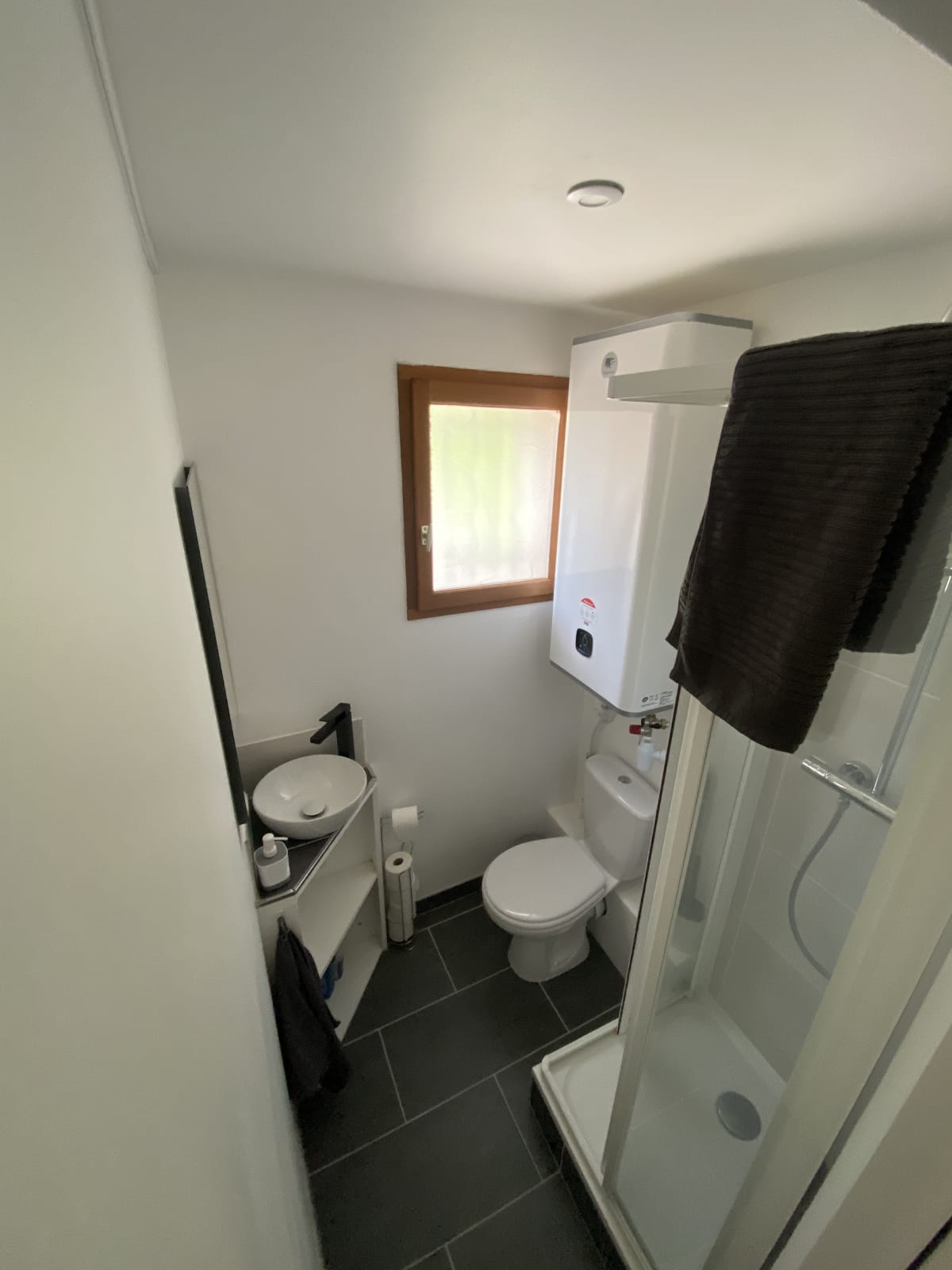 Également au rez-de-chaussée vous trouverez une salle de bain équipée d'une douche 70x70cm, un WC Anglais et un lavabo.
