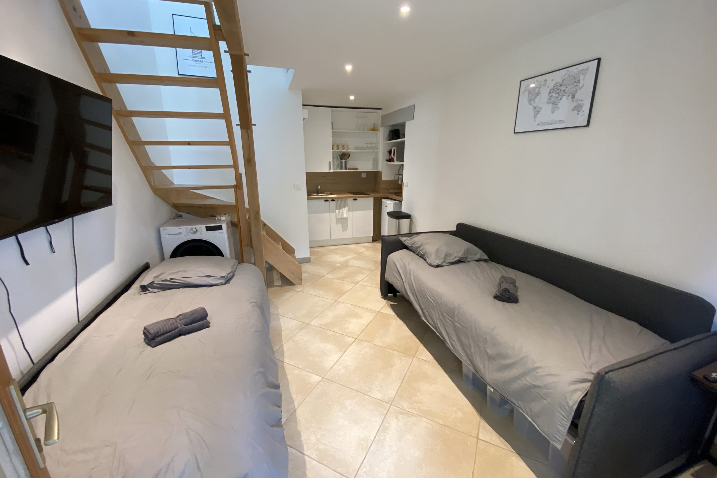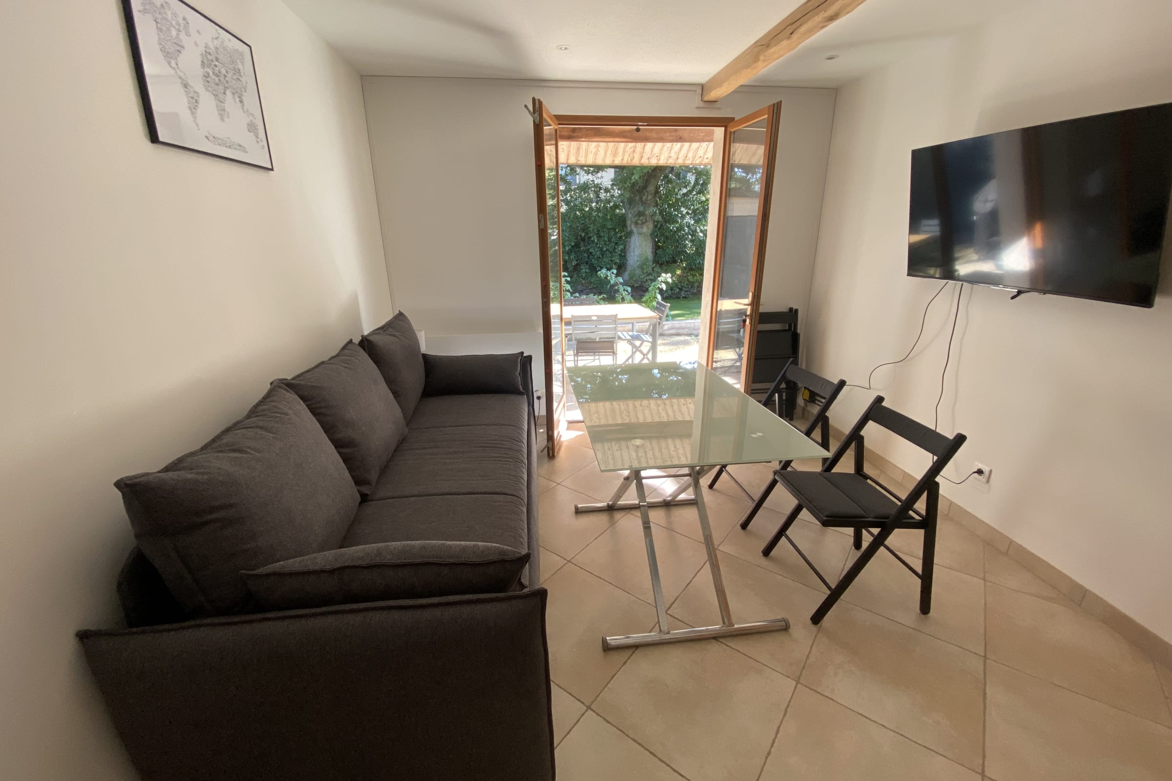 Salon équipé d'une grande Télévision de 126cm (55"), d'un canapé convertible de la marque EMMA, une table basse réversible en table haute ainsi que 4 chaises, une machine à laver (le linge) séchante ainsi que d'une cuisine ouverte équipée (Micro-onde, cafetière Nespresso, bouilloire, grille-pain, frigo, ustensiles de cuisines, couverts et vaisselles). La cuisine n'est pas équipée de lave vaisselle, ni de four.