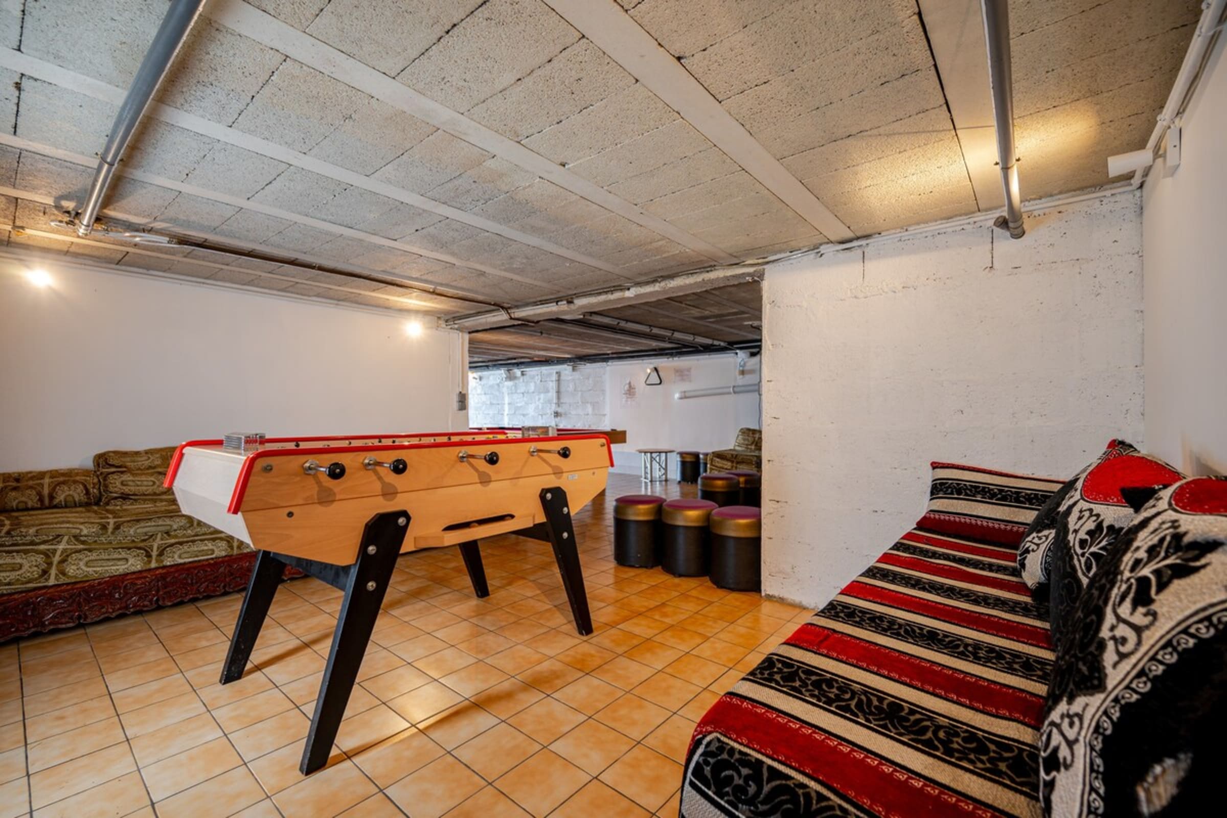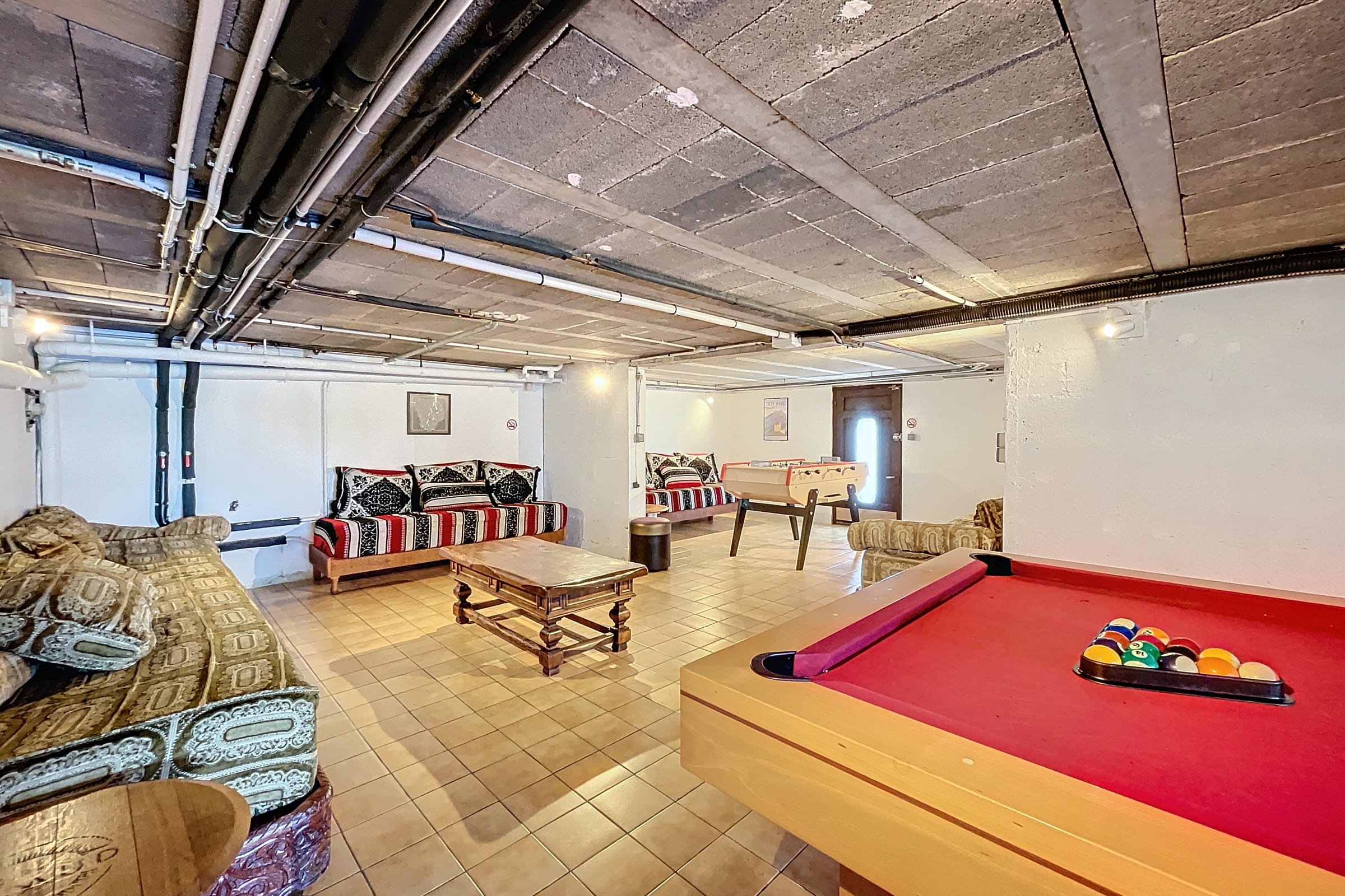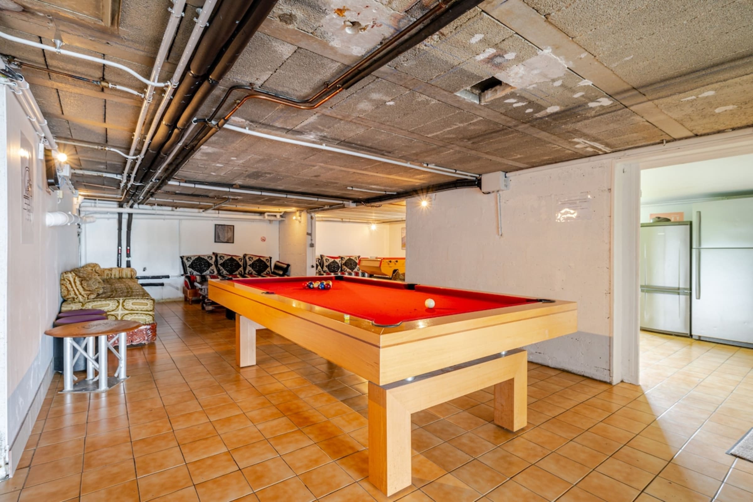 Located on the ground floor, a large living/dining room with a wood-burning fireplace (wood not provided), a sofa and a coffee table. The dining room has two large tables that can accommodate all your guests.