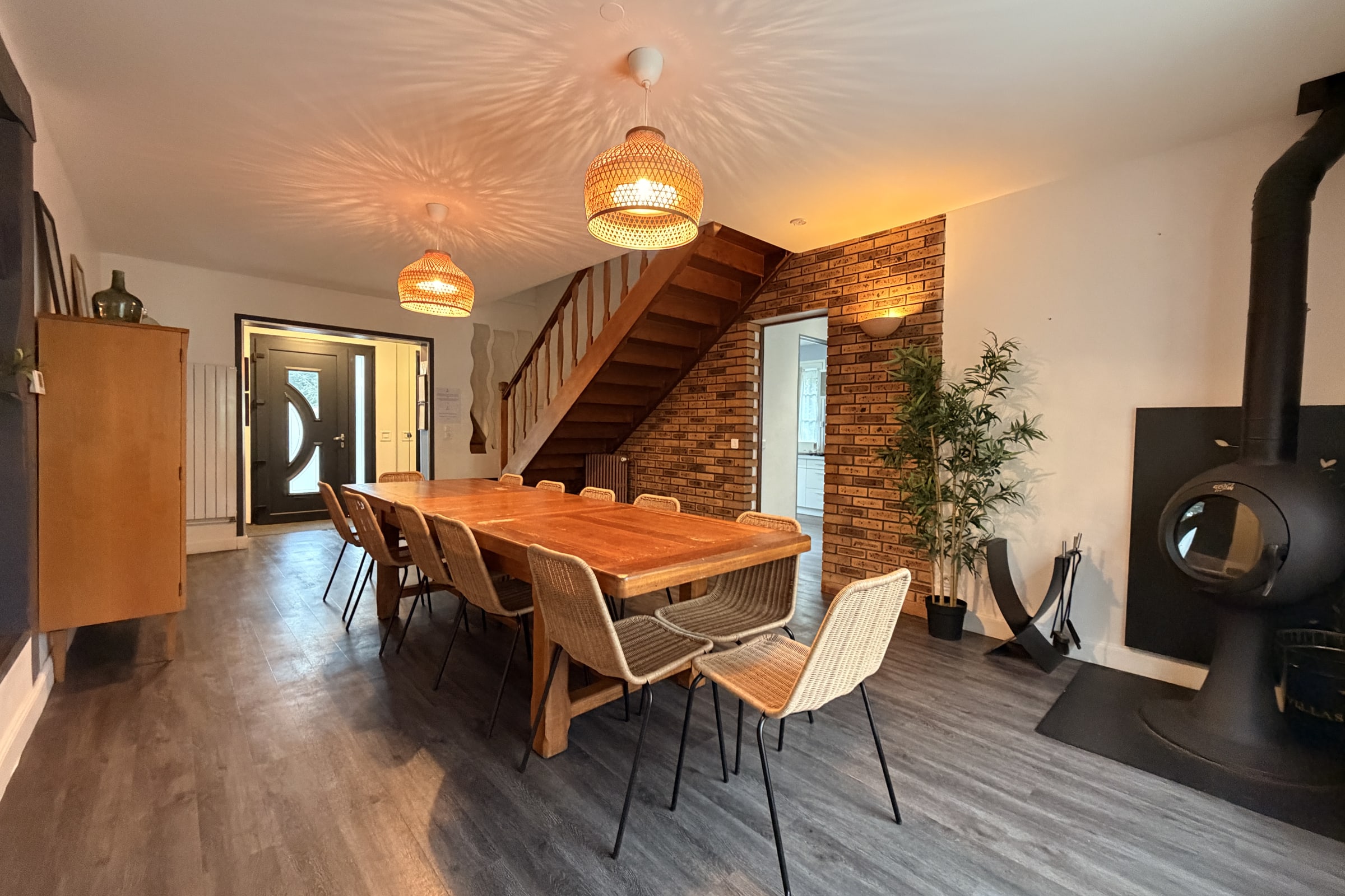 Large dining room equipped with a large table and chairs that can accommodate up to 14 people.