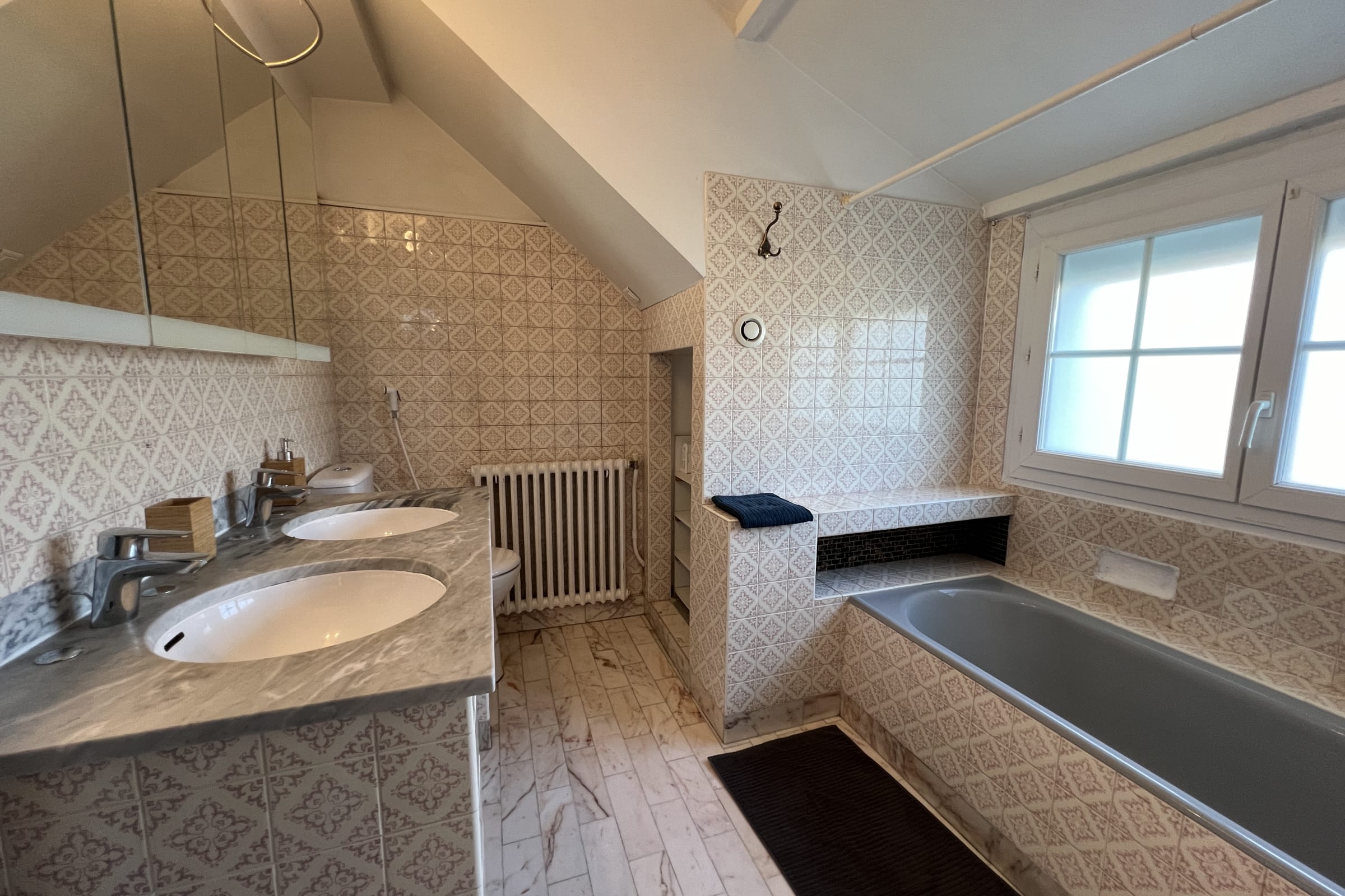 Two bathrooms are available: one on the ground floor with a sink, a shower, a bathtub and a washing machine. The second upstairs with a bathtub, a double sink unit and a toilet.