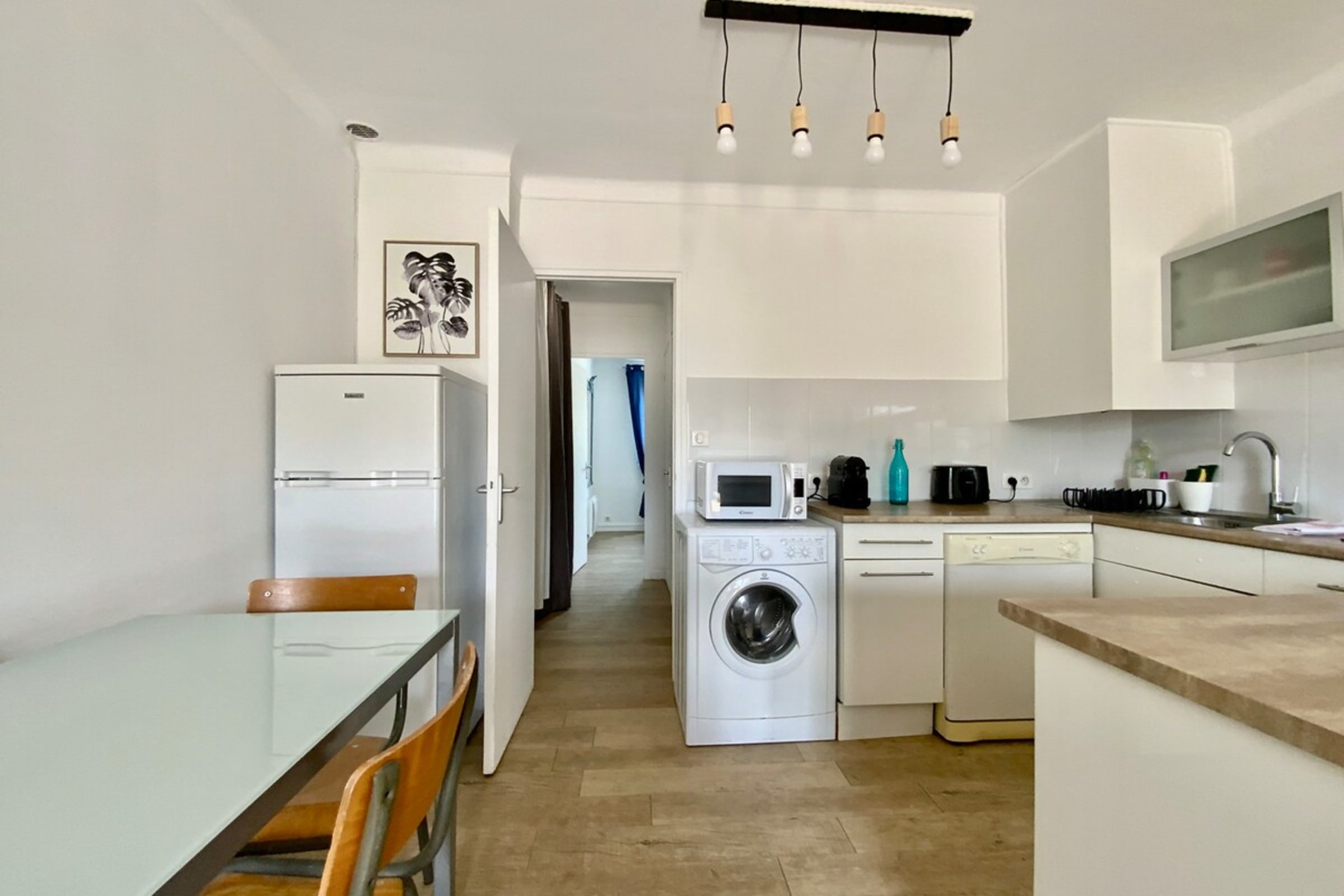 A living room including the lounge area with its 160x200cm sofa bed, an equipped kitchen (dishwasher, washing machine, microwave, Nespresso coffee machine, toaster, hob, etc.), a dining table dining room.