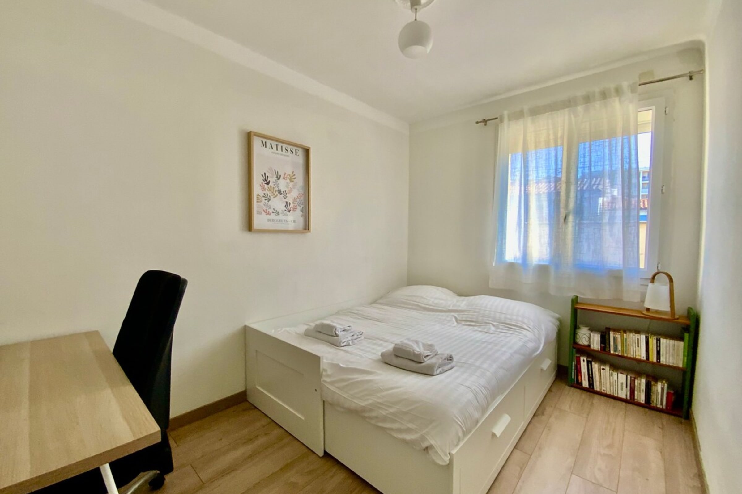 • Bedroom 2 (approximately 10m²): reversible air conditioner, two beds with a 160x200cm trundle bed or two 80cm mattresses constituting a large double bed with storage drawers, a 120x60cm desk accompanied by a comfortable office chair and a wardrobe with shelf. Please note: the bed was damaged at the footboard but this does not interfere with sleeping.