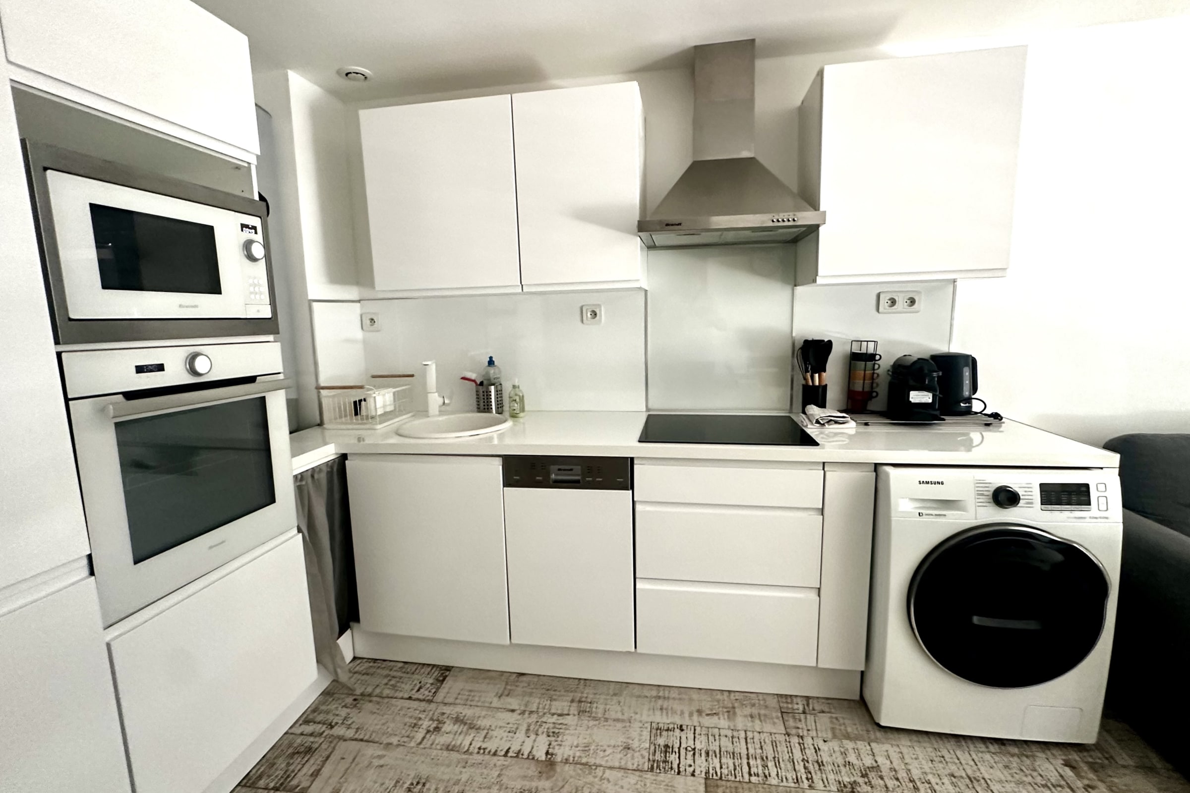 - A bright living room including a lounge area, a dining area with a dining table, a large storage cupboard, an open kitchen equipped with all the necessary appliances and storage: 4-burner hob, microwave, fridge-freezer, toaster, kettle, Nespresso coffee maker, extractor hood, washing machine...