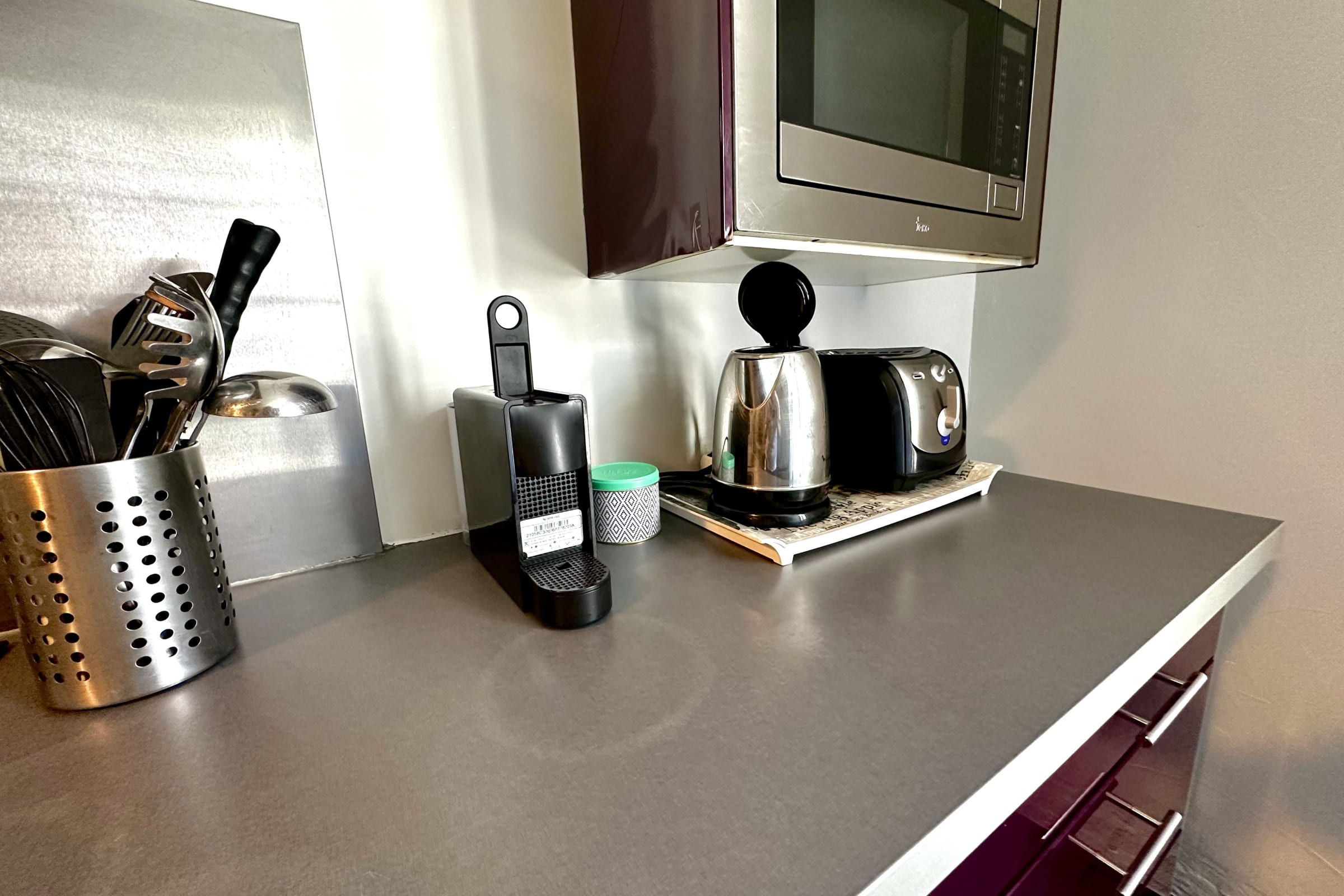 - A fully equipped open kitchen with combined fridge, Nespresso and manual coffee machine, washing machine, dishwasher, toaster, kettle