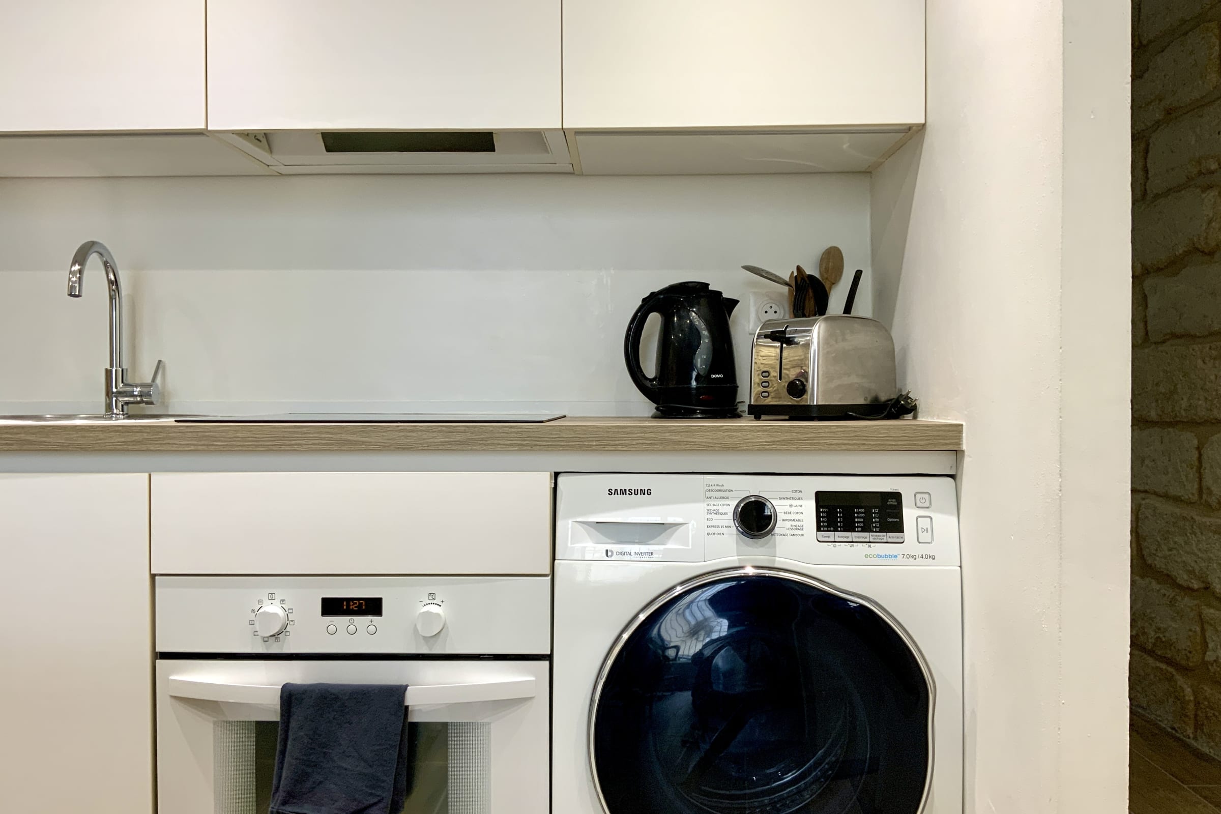 ° The modern kitchen is open to the dining area with an adjustable table for meals. The kitchen, with plenty of storage, is equipped with: a stovetop, oven, microwave, dishwasher, washing machine, refrigerator/freezer, Senseo coffee maker, kettle, toaster, and a large sideboard with all the necessary dishes and utensils.
