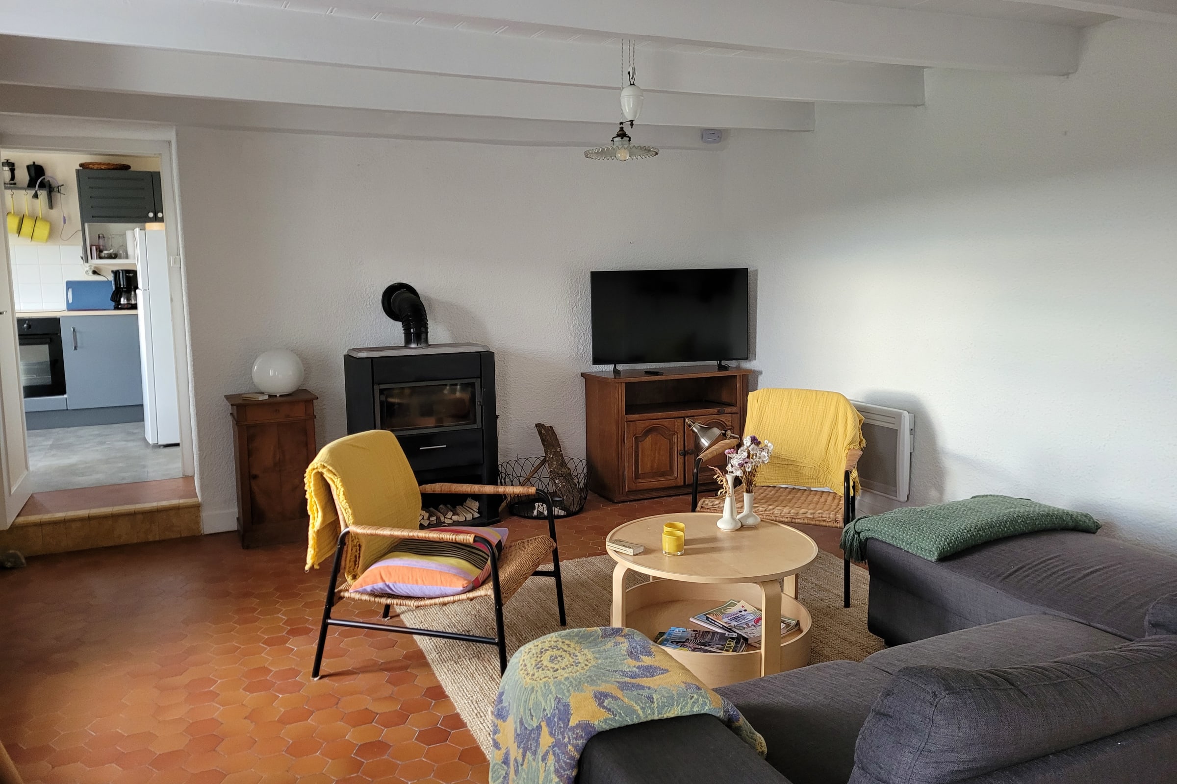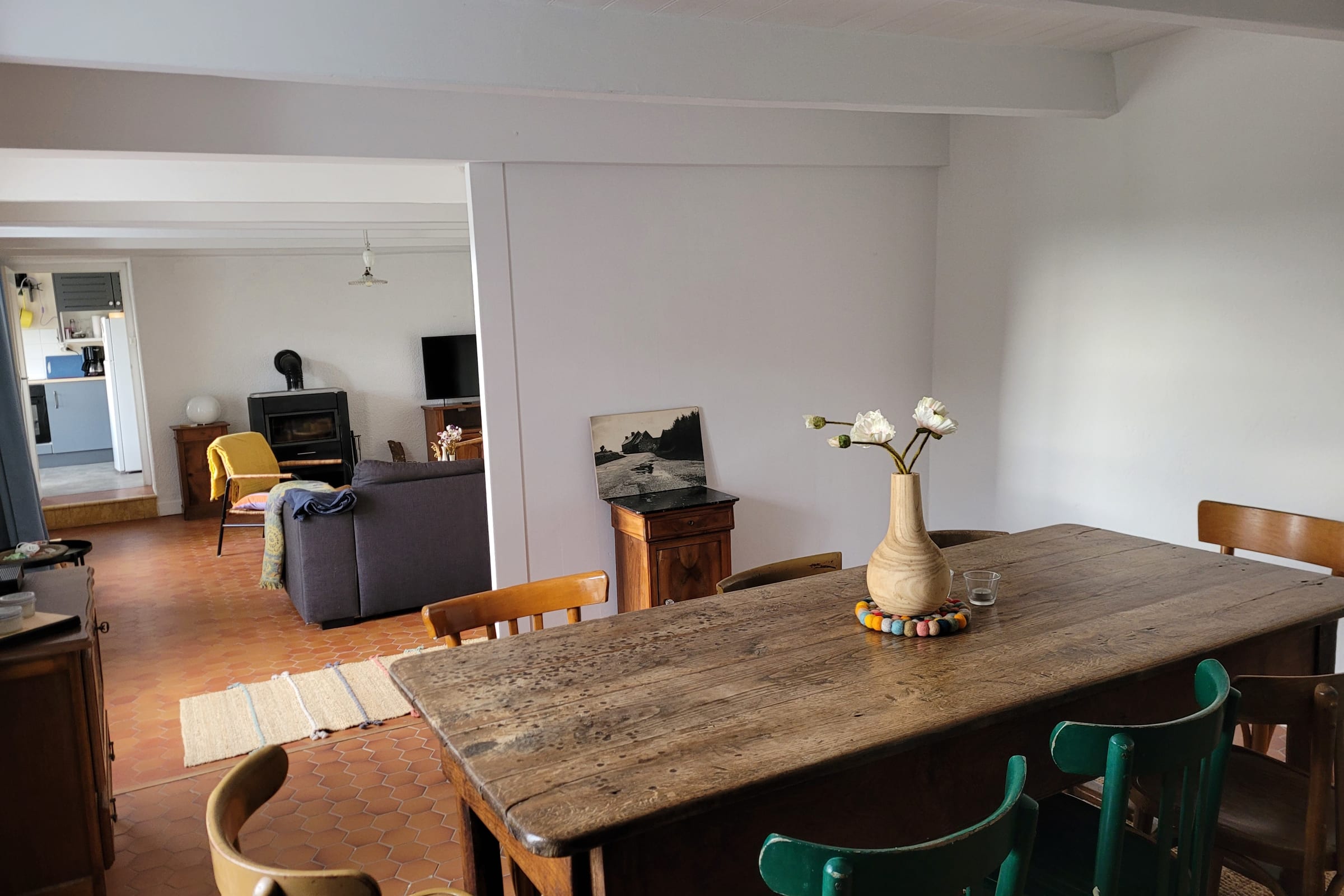 Living room with wood-burning stove and dining area