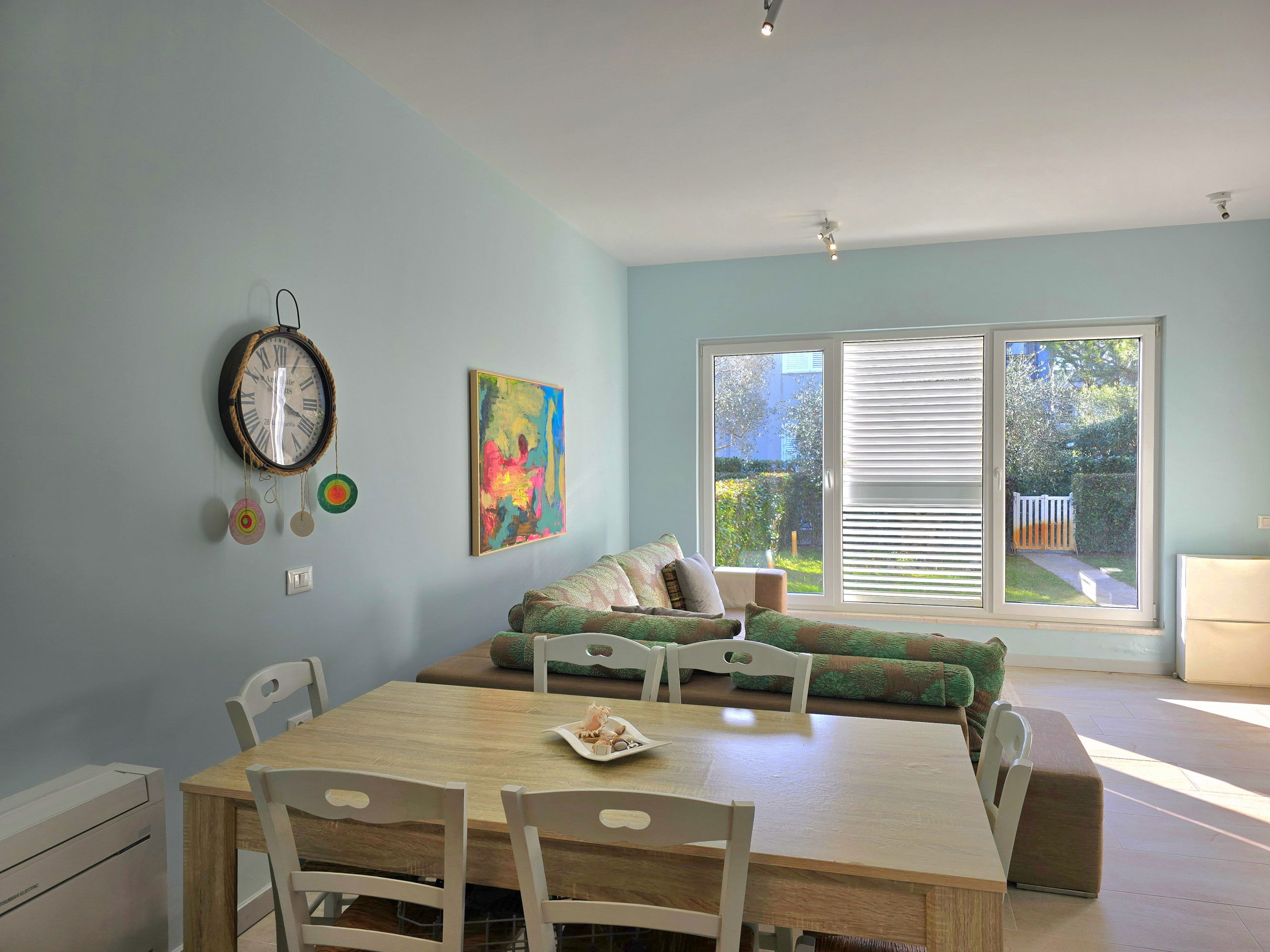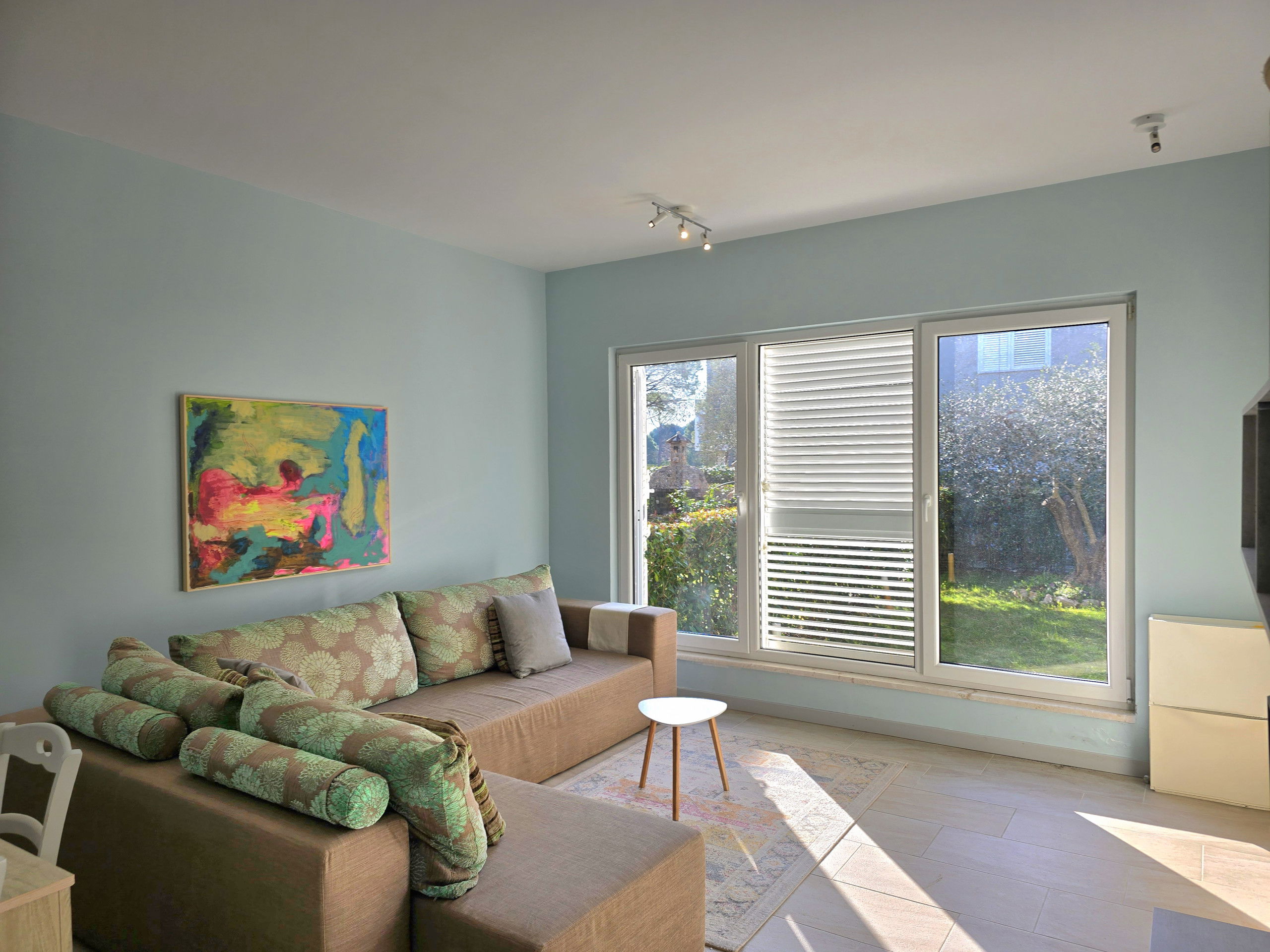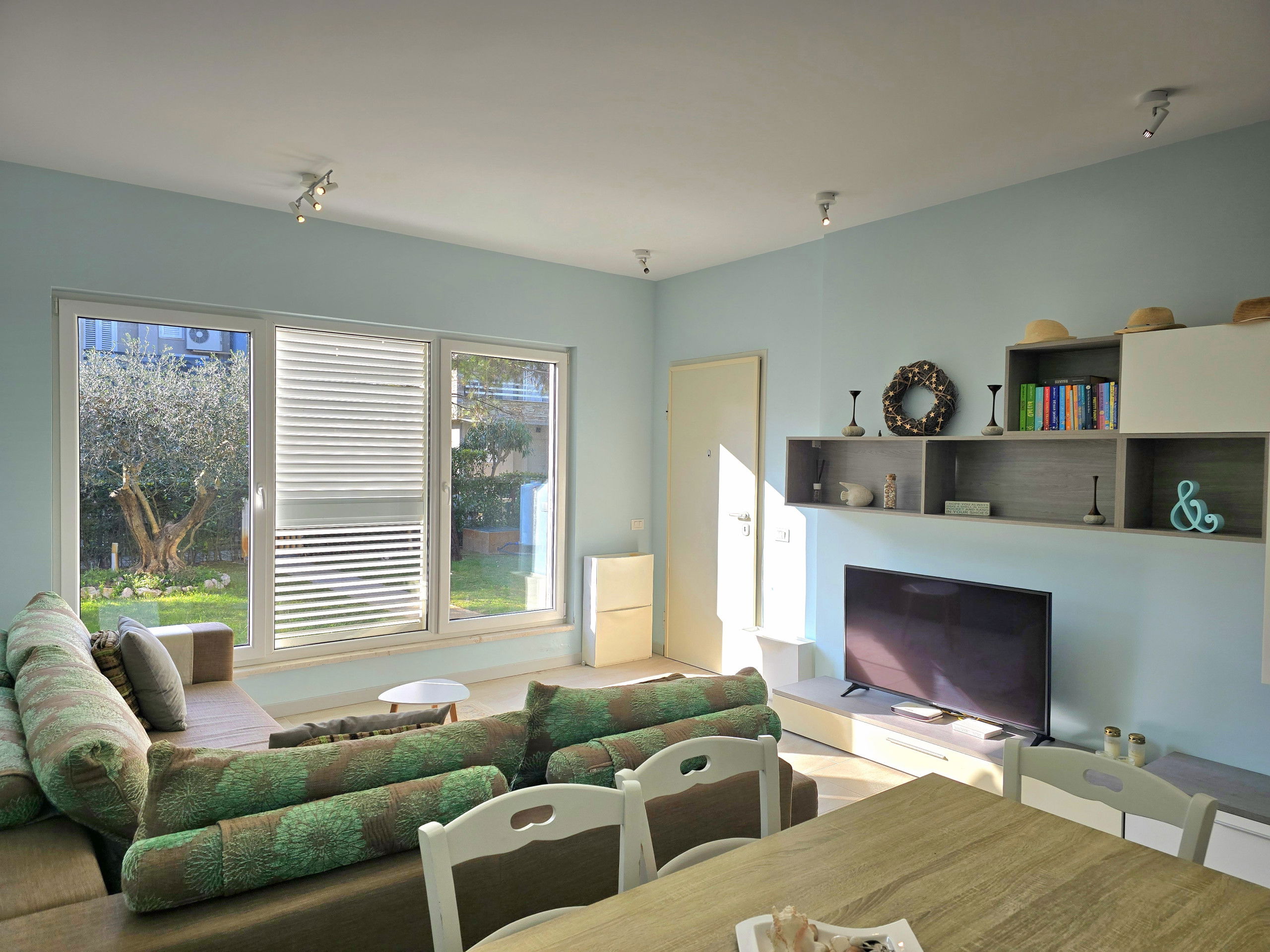 This accommodation is positioned on the ground floor of a two-story building. The big garden creates a great atmosphere for late evenings and early mornings. It is nicely furnished and it has everything needed for a comfortable holiday.