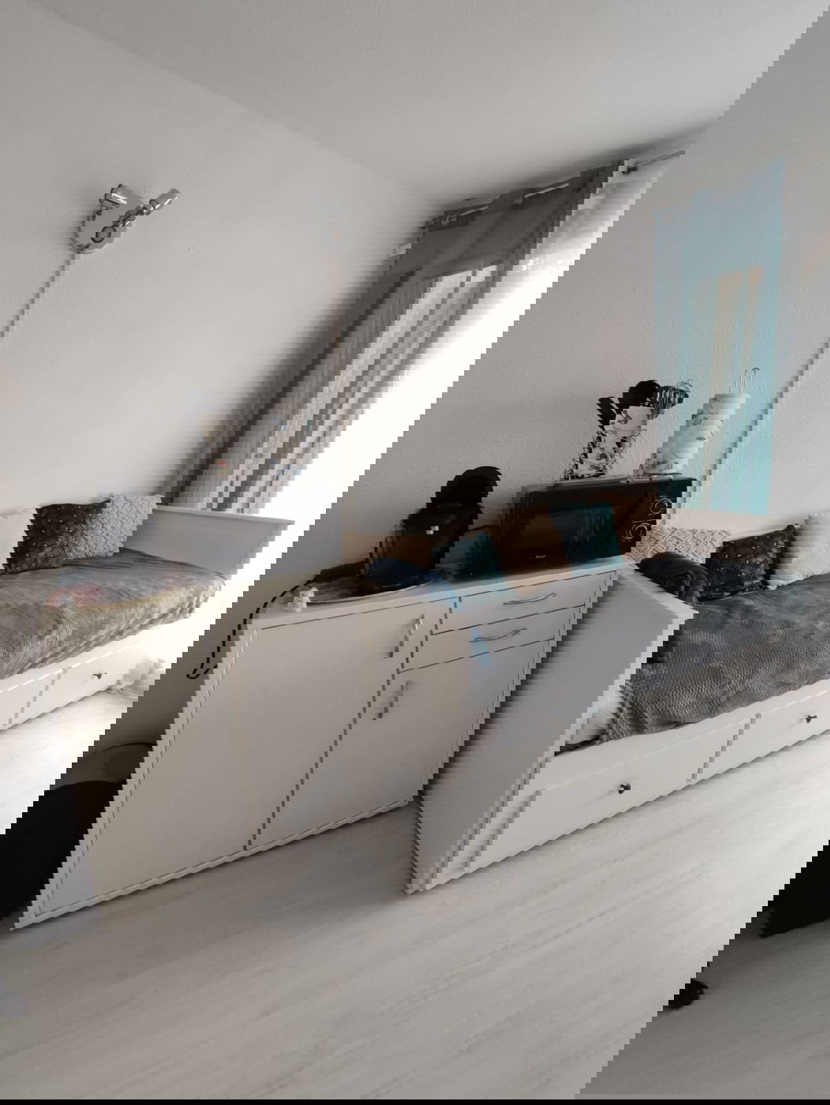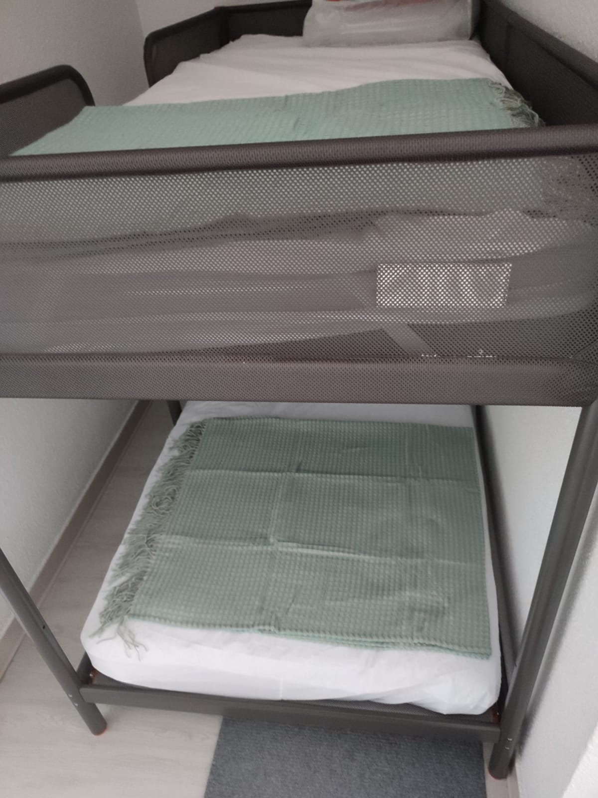 Located on the 2nd floor without an elevator, the apartment offers a central location while maintaining a peaceful atmosphere. It features an entry with bunk beds, ideal for children, a bright living area with an open kitchenette, and a large balcony where you can enjoy meals outdoors. A bathroom with a shower and a separate WC complete the apartment.