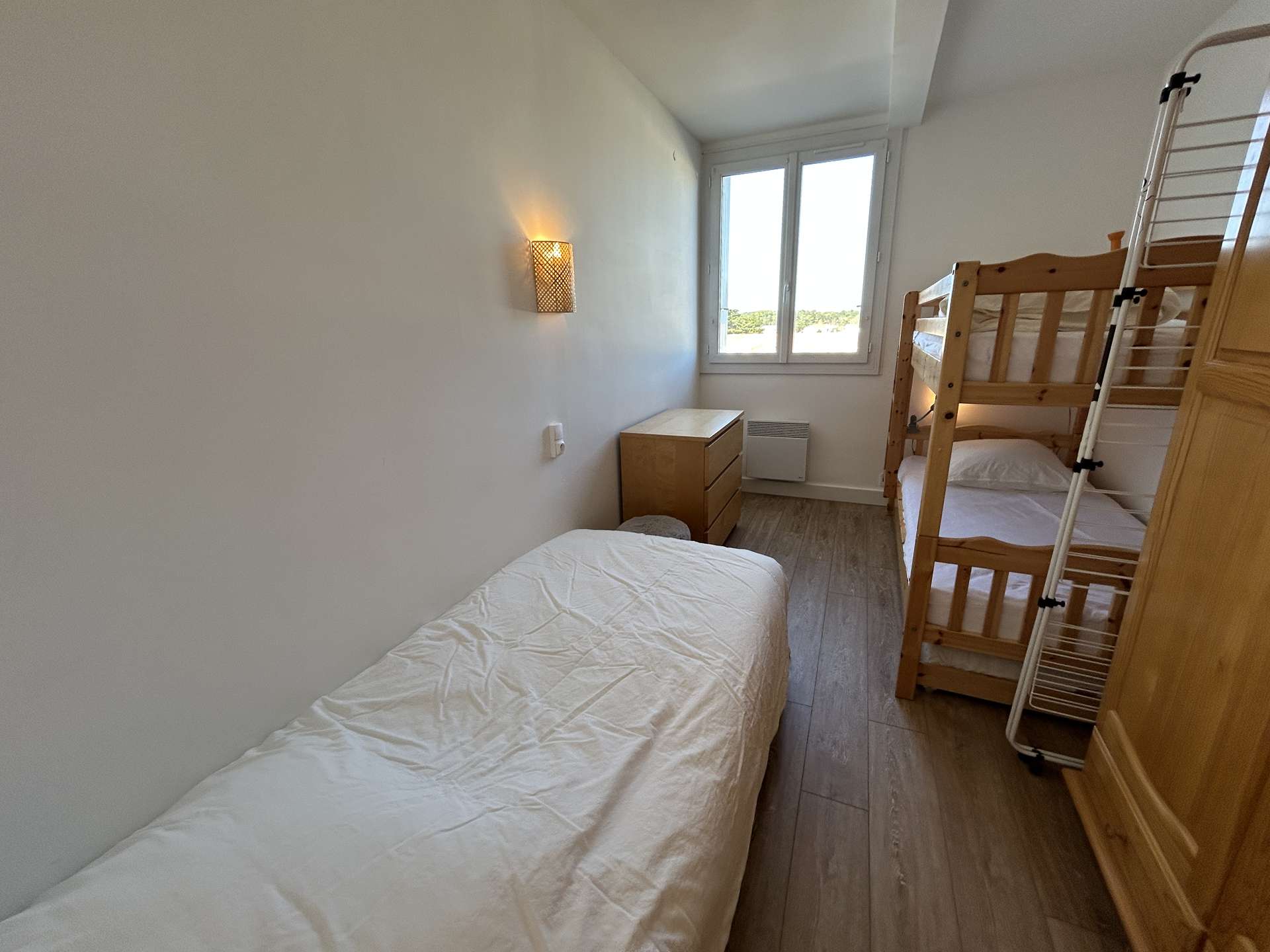 This beachfront rental, located on the 3rd floor with a half-floor elevator, features a living room with a double sofa bed and television, a balcony with a beautiful sea view, a fully fitted and equipped kitchen (refrigerator/freezer, dishwasher, electric oven, microwave, 3-burner induction hob, washing machine), a bedroom with a single bed (90 cm) and two bunk beds (90 cm), a bedroom with a double bed (160 cm), a bathroom, and a separate toilet.