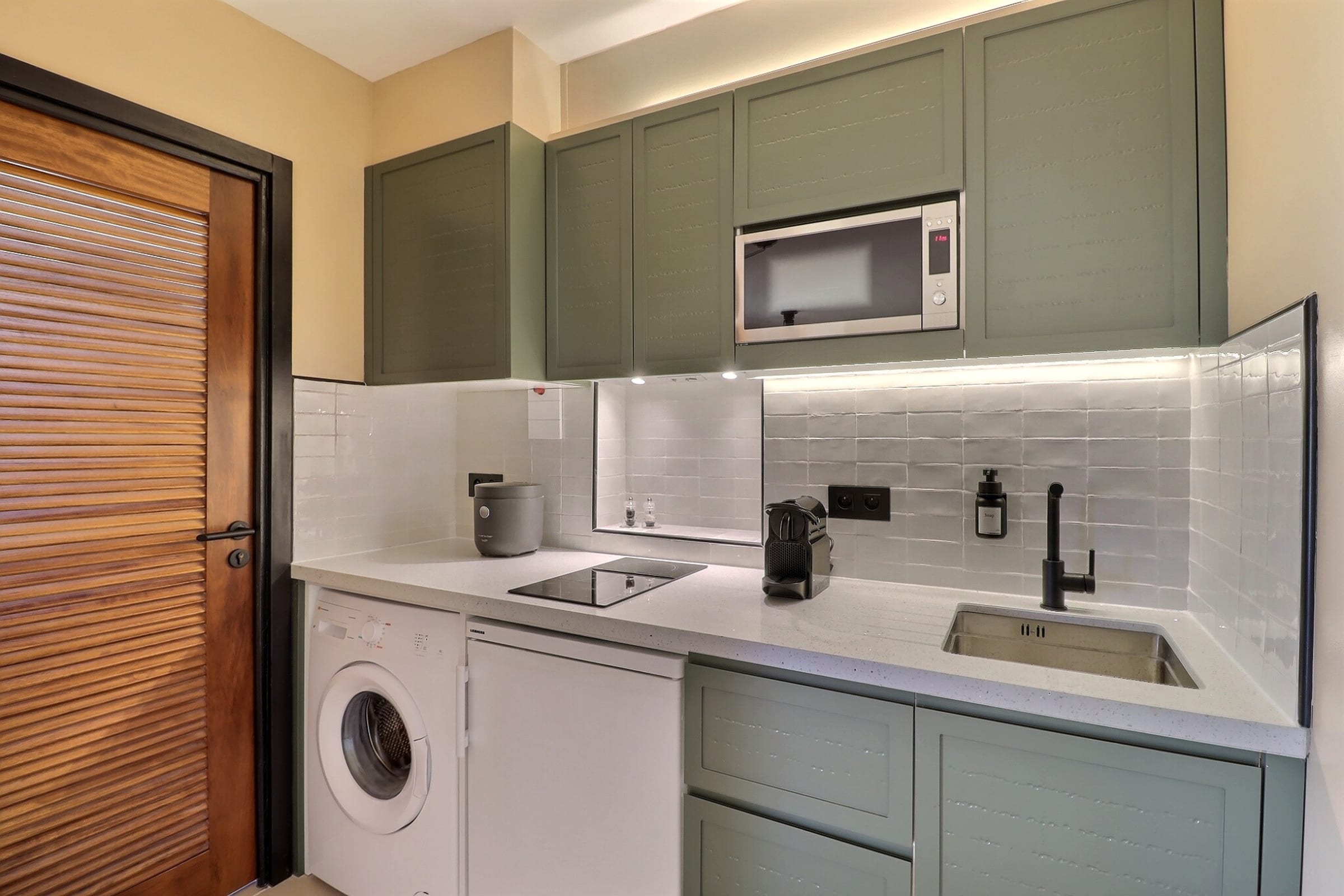 The suite is fully air-conditioned and thoughtfully designed, featuring a comfortable sleeping area separated by a decorative screen, a cozy dining corner, and a modern kitchen equipped with everything you need—including a coffee machine, cooktop, and washing machine. High-speed Wi-Fi and a smart TV ensure both convenience and entertainment throughout your stay.