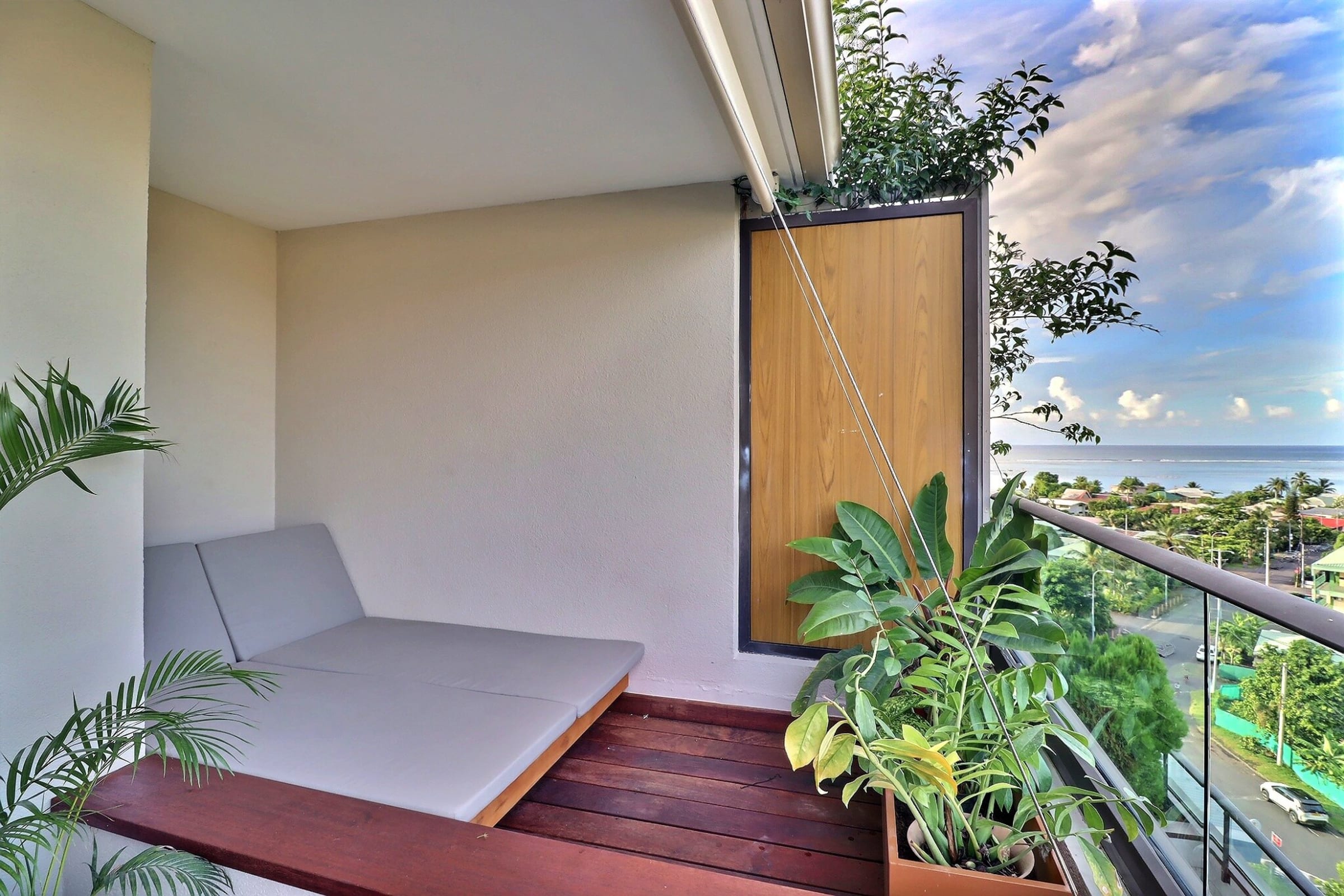 Step inside and discover a space where modern design meets Polynesian warmth. The bright living area flows seamlessly onto the terrace, perfect for enjoying morning coffee as the city awakens or sharing a glass of wine as the sun sets over the lagoon.