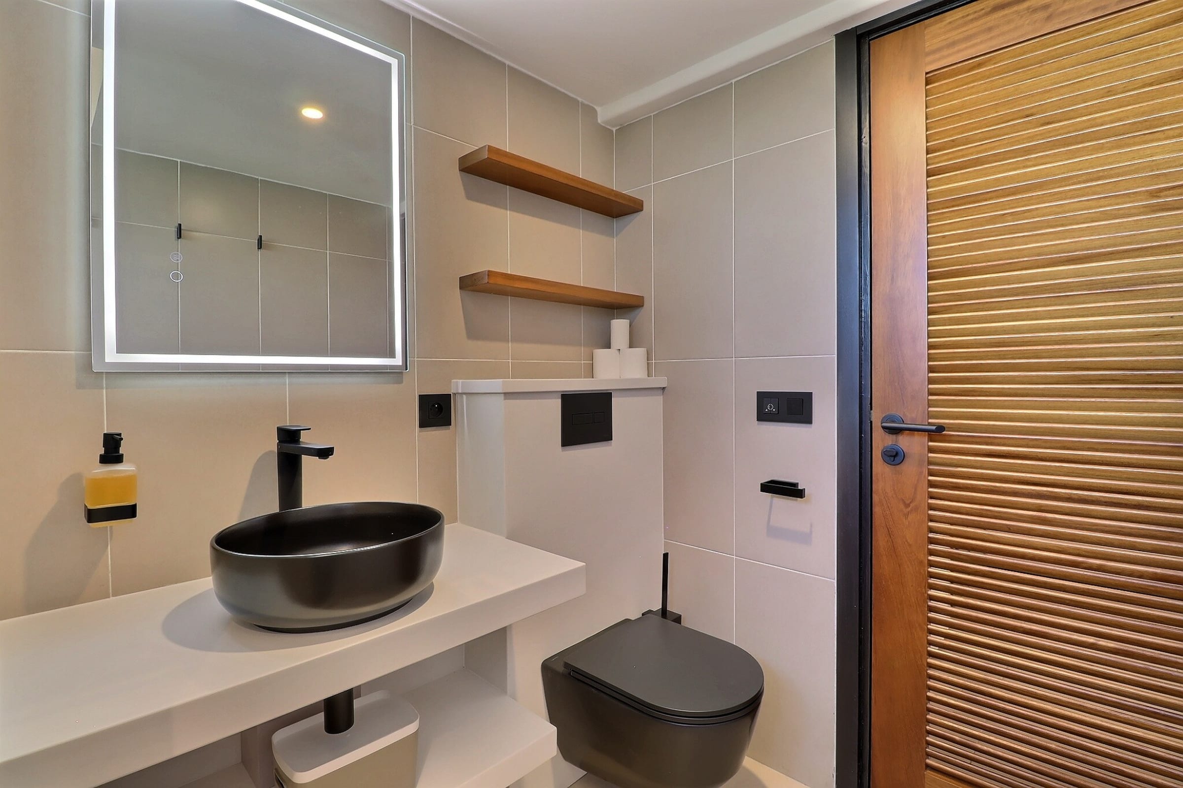 The sleek bathroom offers a refreshing retreat, with a spacious walk-in shower and elegant finishes.