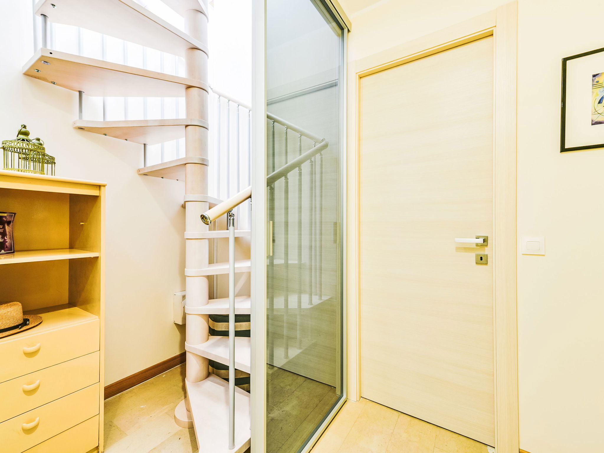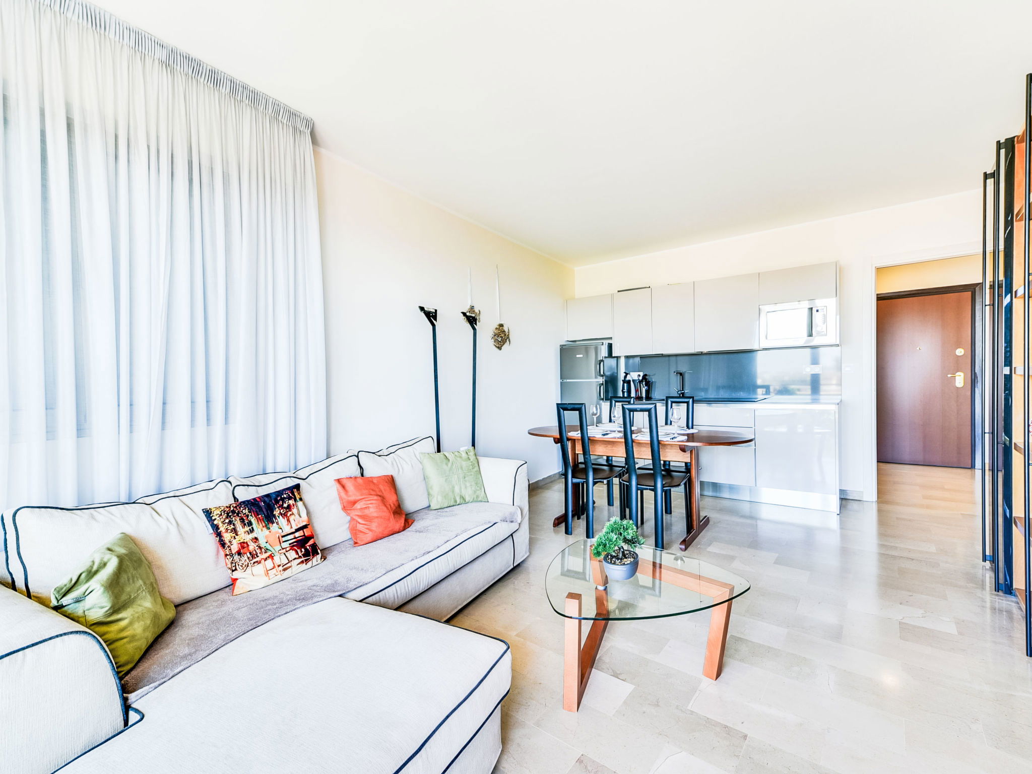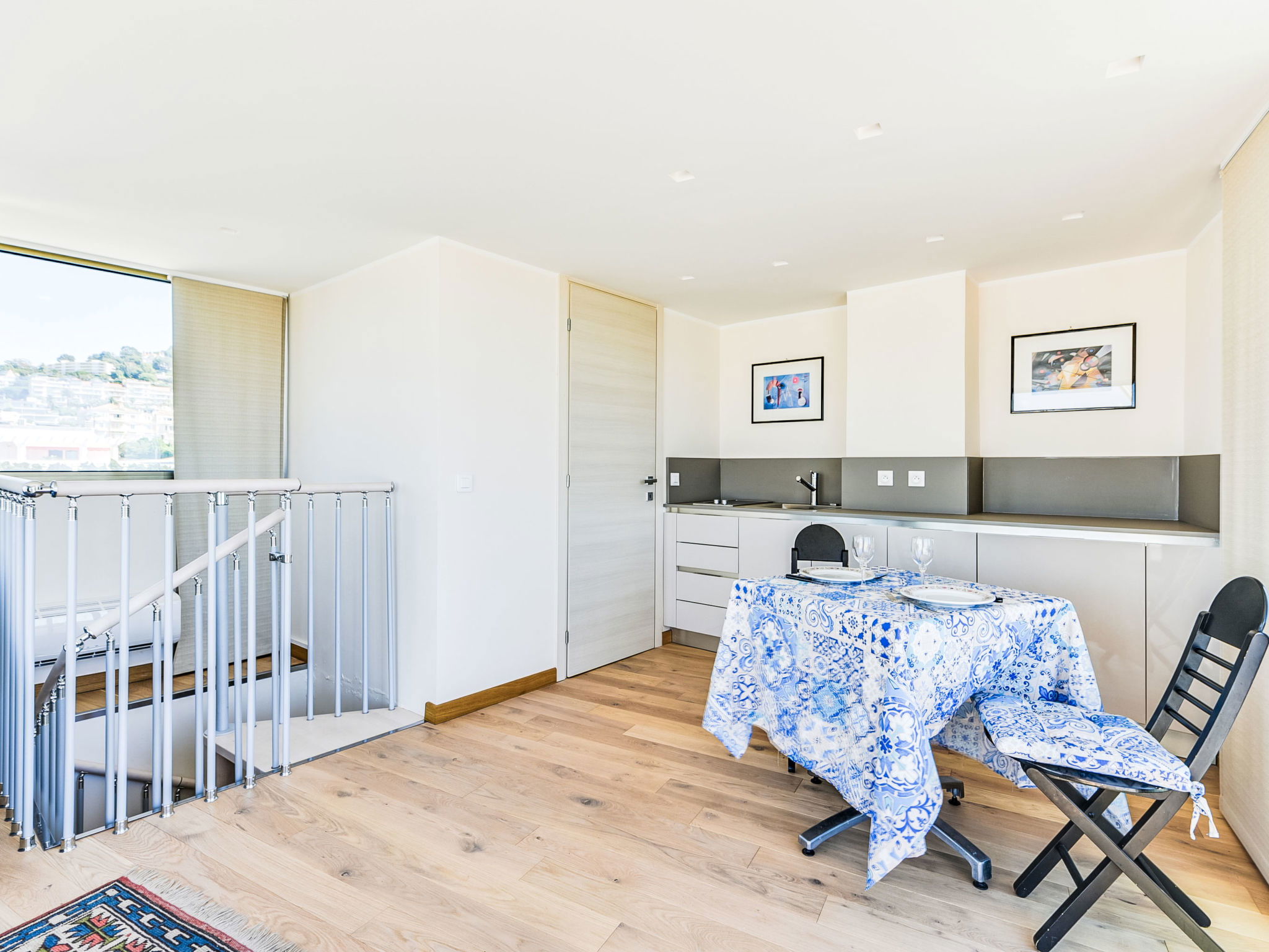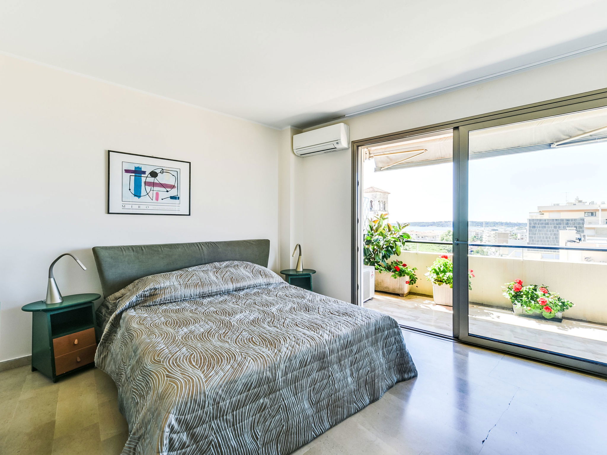 4-room maisonette 90 m2 on 7th floor. Fully, very comfortable and beautiful furnishings: living/dining room with TV (flat screen). Exit to the terrace. 1 room with 1 french bed (160 cm, length 200 cm). Exit to the terrace. 1 room with 1 french bed (140 cm, length 190 cm). Open kitchen (dishwasher, 4 induction hot plates, microwave, electric coffee machine). Bath/bidet/WC. Electric heating, air-conditioning. Upper floor: (spiral staircase) living/dining room. Exit to the terrace. Shower/WC. Terrace 12 m2, large terrace 40 m2. Terrace furniture. Very beautiful view of the sea. Facilities: washing machine. Internet (WiFi, free). Garage, height 180 cm, width 250 cm. Please note: smoke alarm. Please note : the garage is for small cars. 06029008918SB