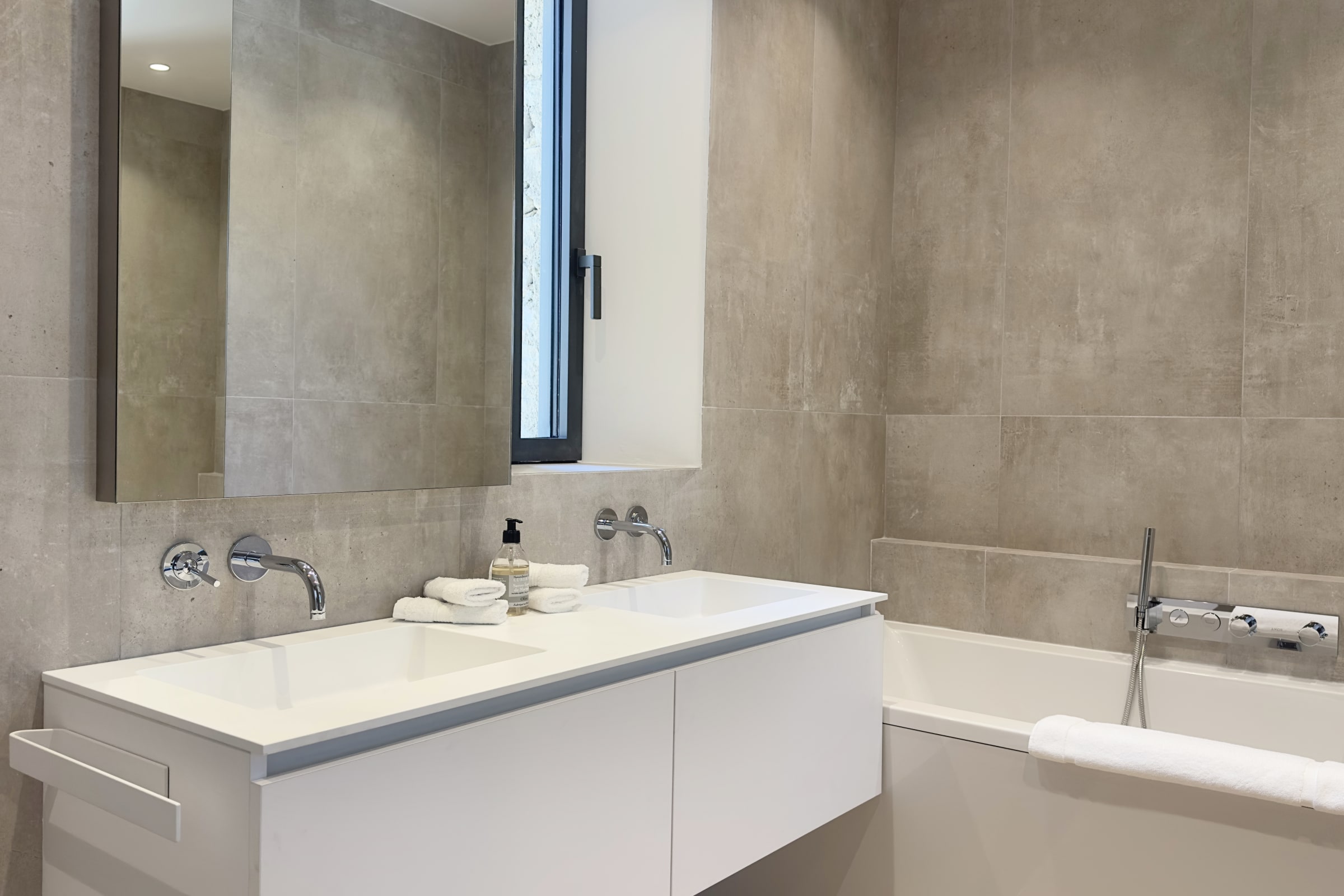 For those seeking more privacy, the master suite on the garden level is a true sanctuary. This expansive suite features an en-suite bathroom, fitted with a Japanese bidet for a spa-like experience, and a walk-in closet, offering all the luxury you need for a restful stay. With direct access to the terrace, you can savour quiet mornings or peaceful evenings while connecting with the beauty of the surrounding landscape.