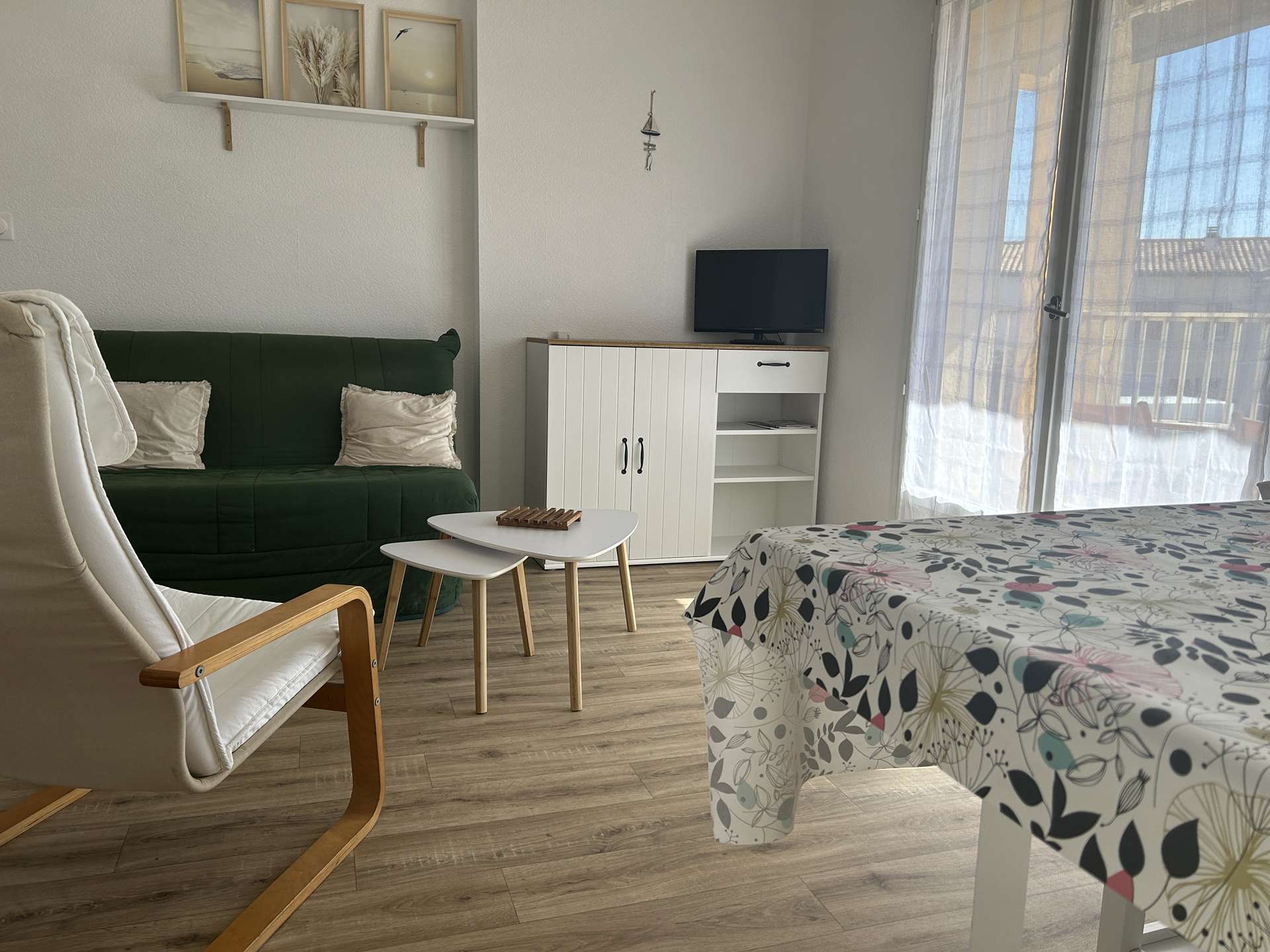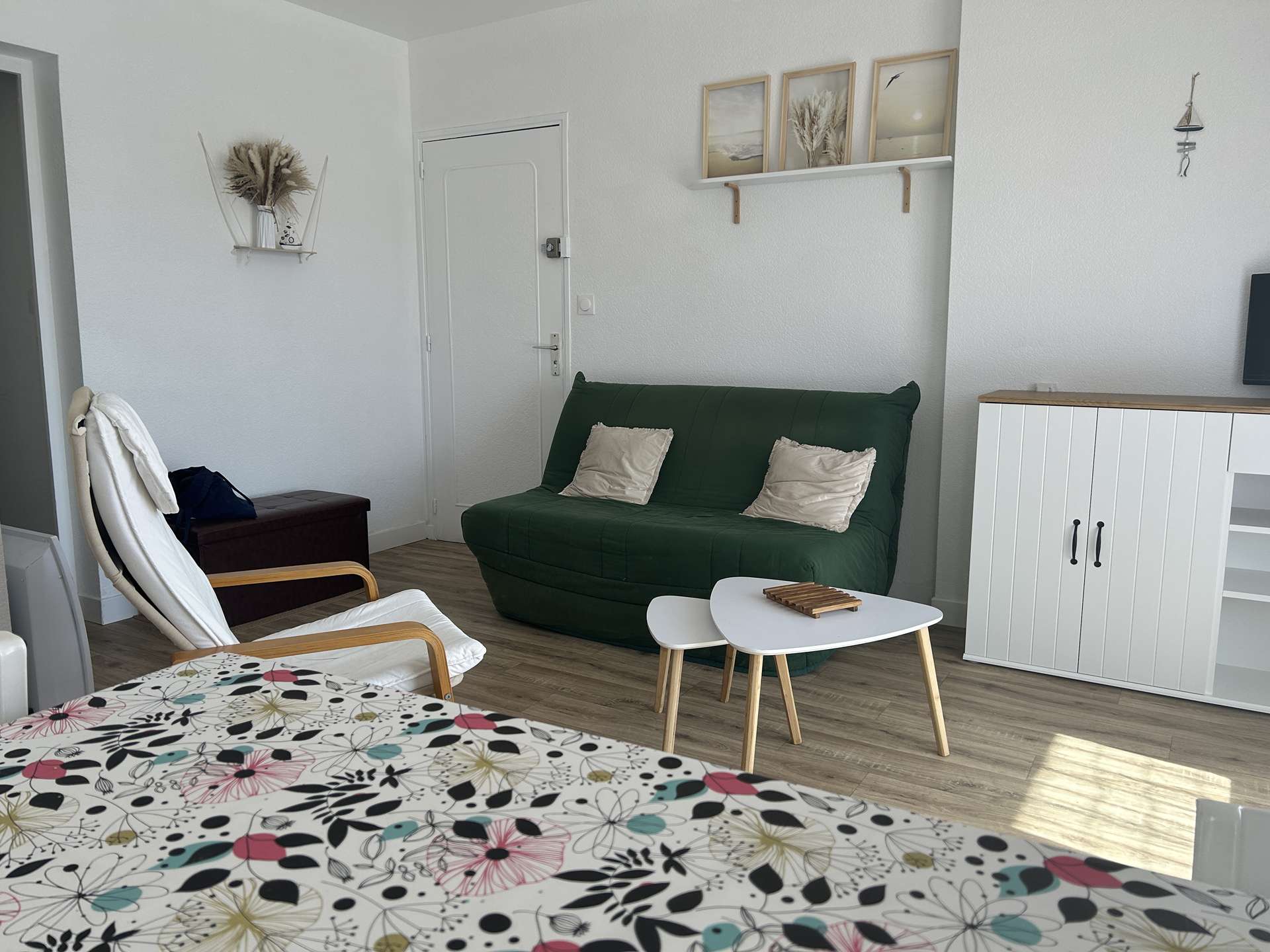 Le logement : Cette location de vacances à la plage se trouve au premier étage et se compose d'un séjour avec télévision (sous réserve d'une bonne réception), un canapé convertible,