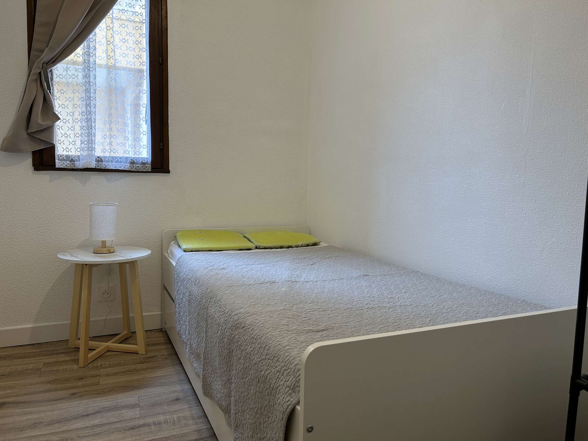 une cuisine séparée et équipée, une chambre avec un lit double (140), une 2e petite chambre avec 2 lits simples, une salle d'eau et des wc indépendants