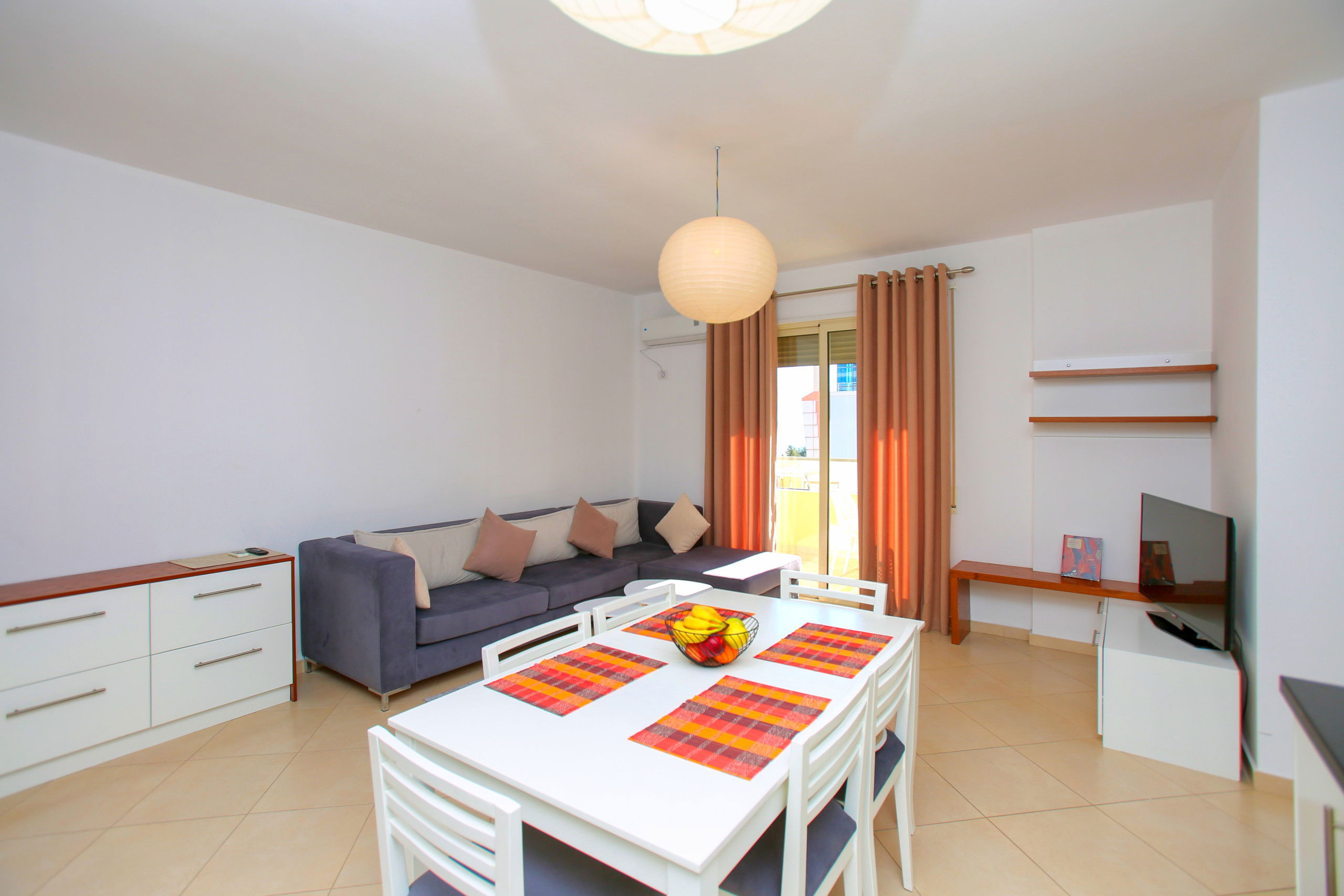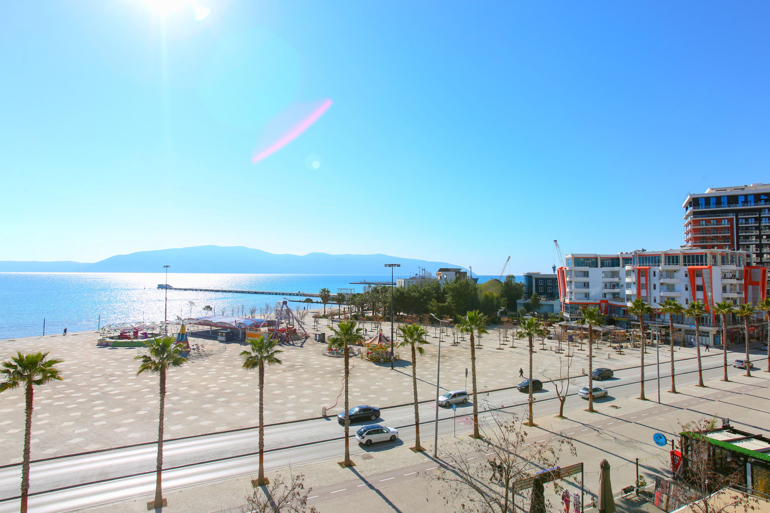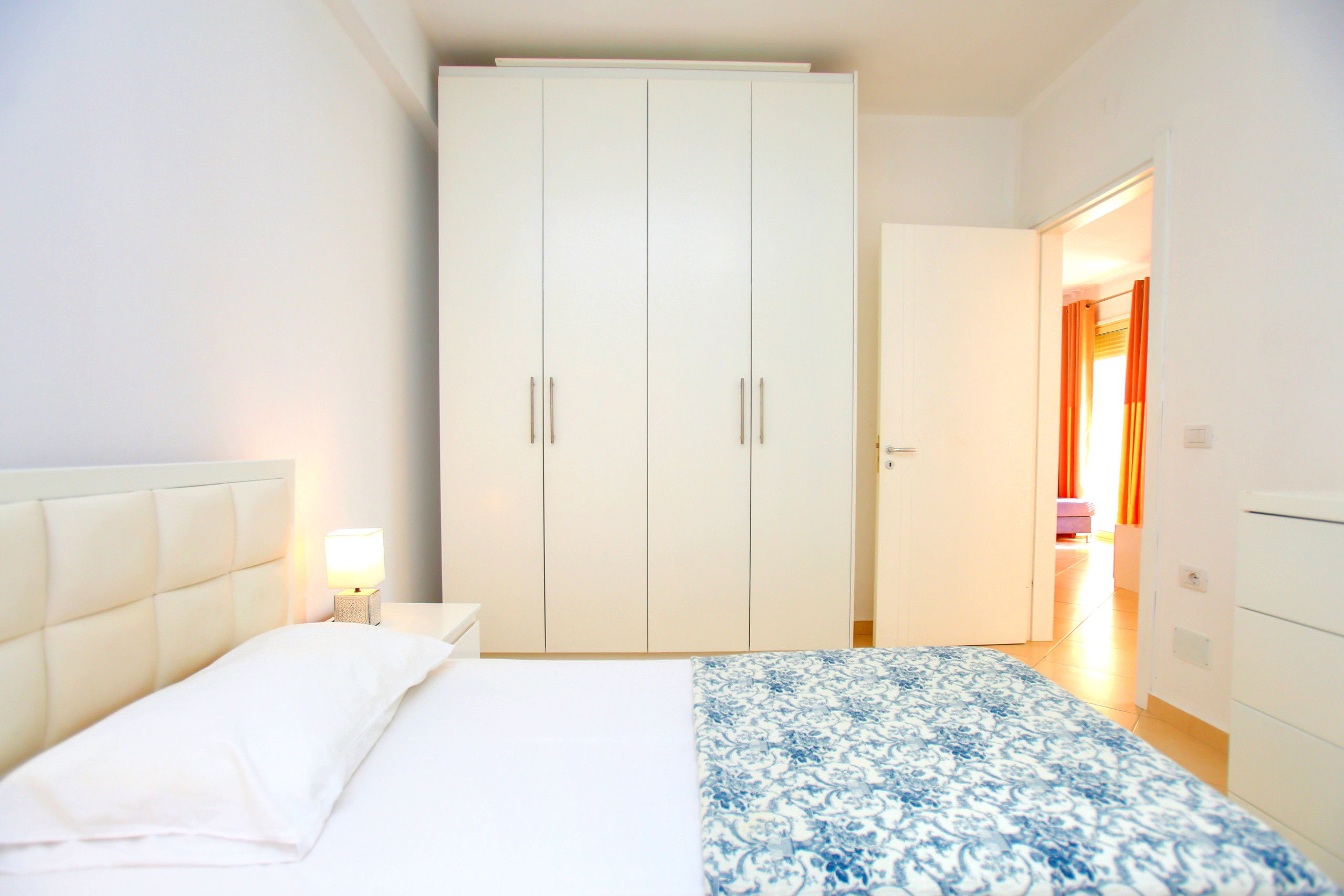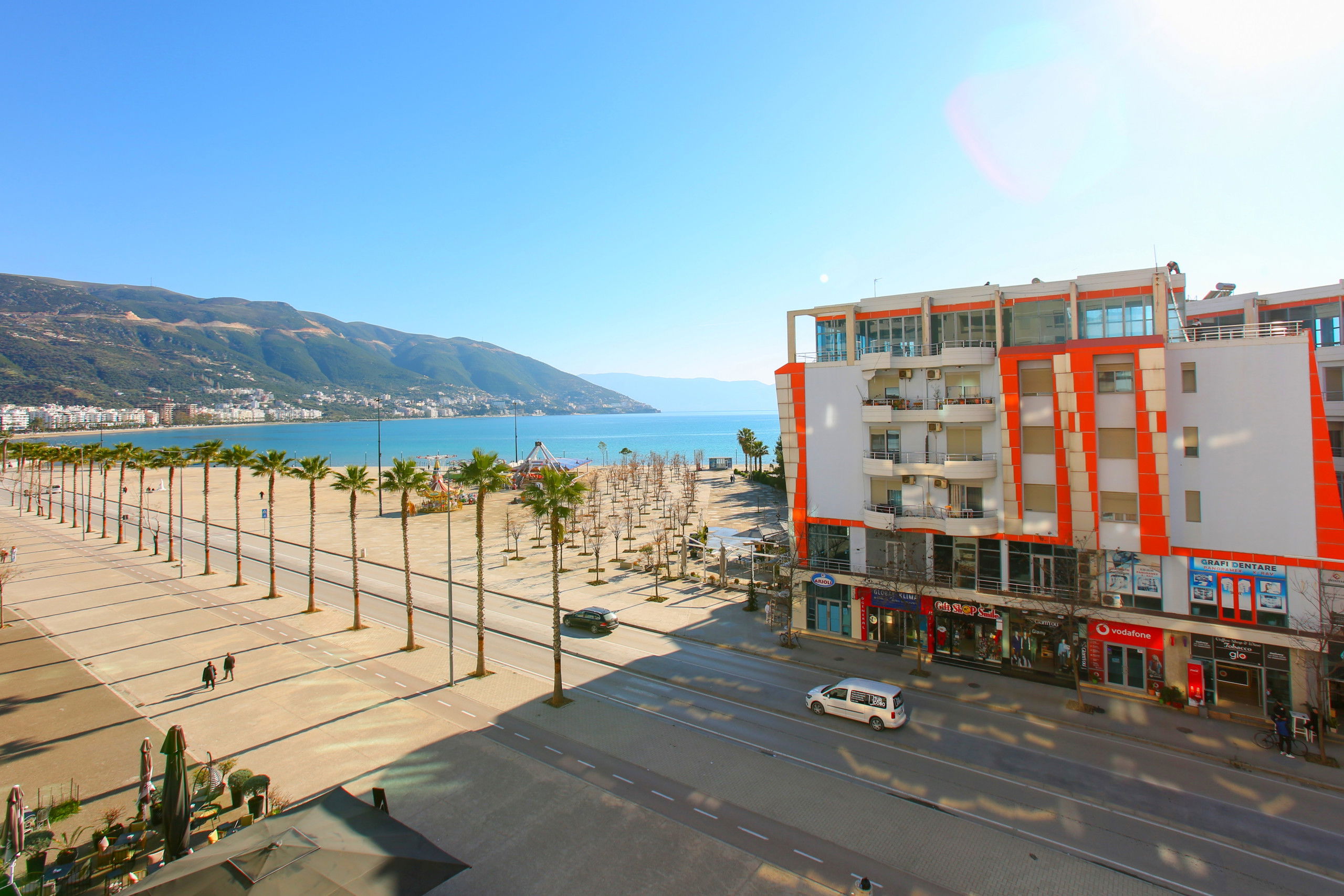 The apartment in Vlorë has 2 bedrooms and capacity for 5 people. A cosy 80 m² fully equipped accommodation, positioned seafront, with sea and mountain view. It is located 10 m from "Big Market" supermarket, 150 m from the sandy beach, 30 km from "Llogara National Park", 150 km from "Tirana International Airport" and is situated in an ideal area for families and near the sea. It has lift, washing machine, internet access (wifi), hairdryer, balconies, heat pump heating, air conditioning, 1 Television. The American kitchen, electric, is equipped with refrigerator, microwave, oven, freezer, dishes/cutlery, kitchen utensils and kettle.
