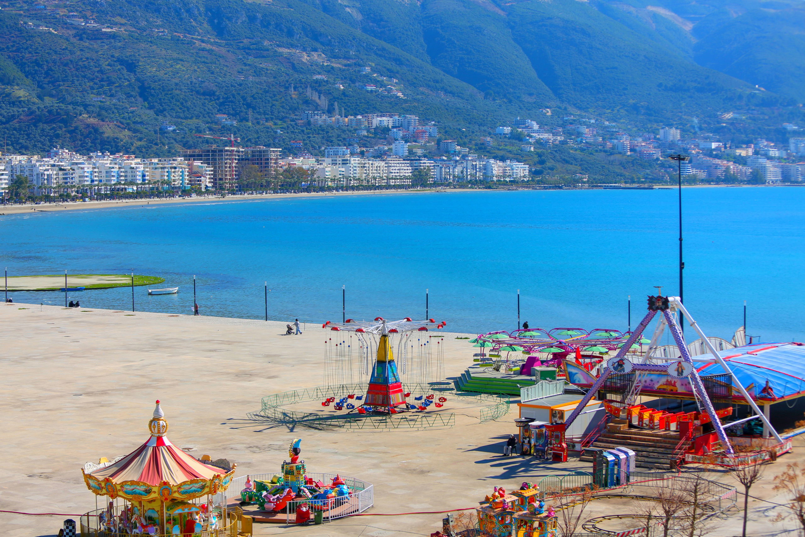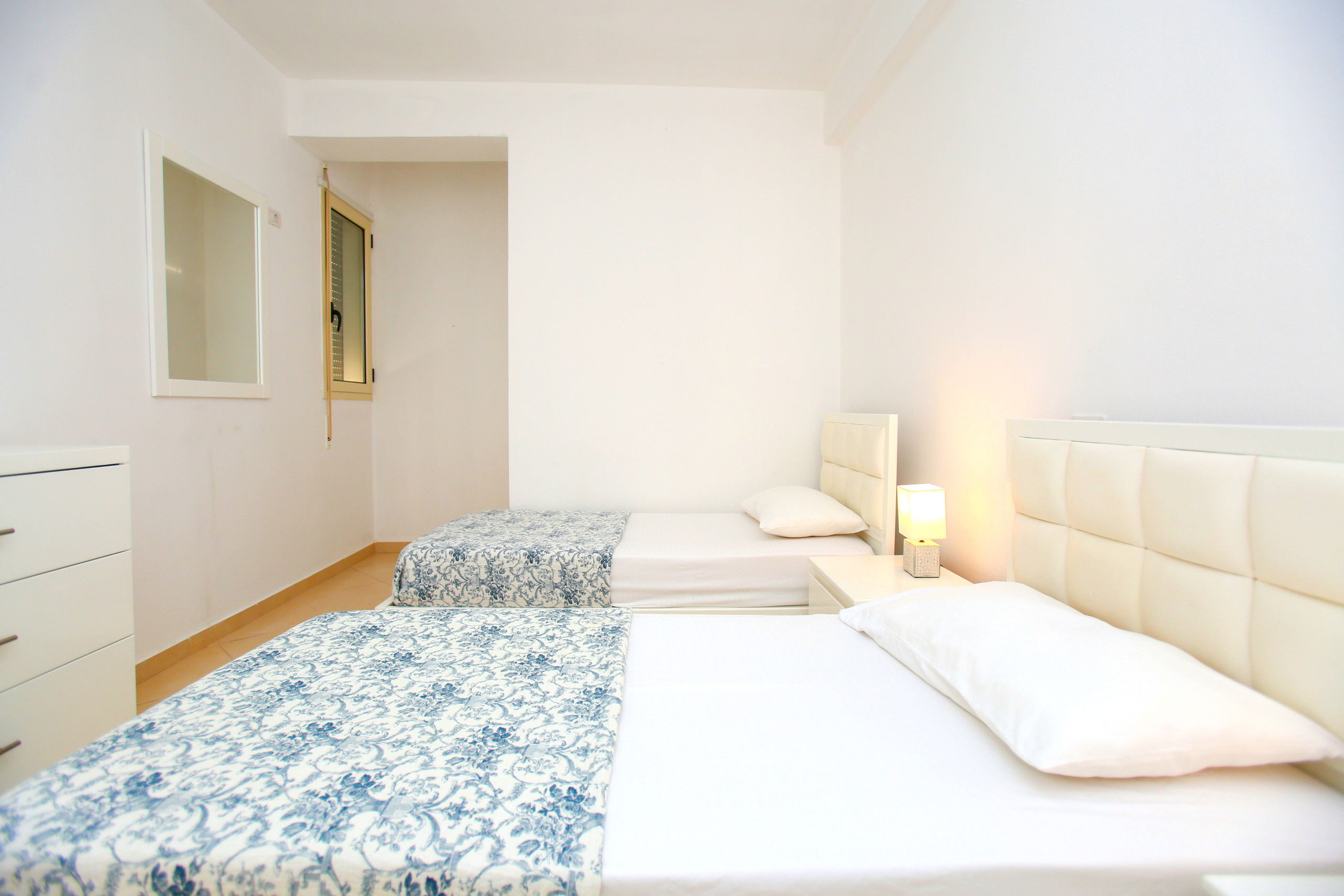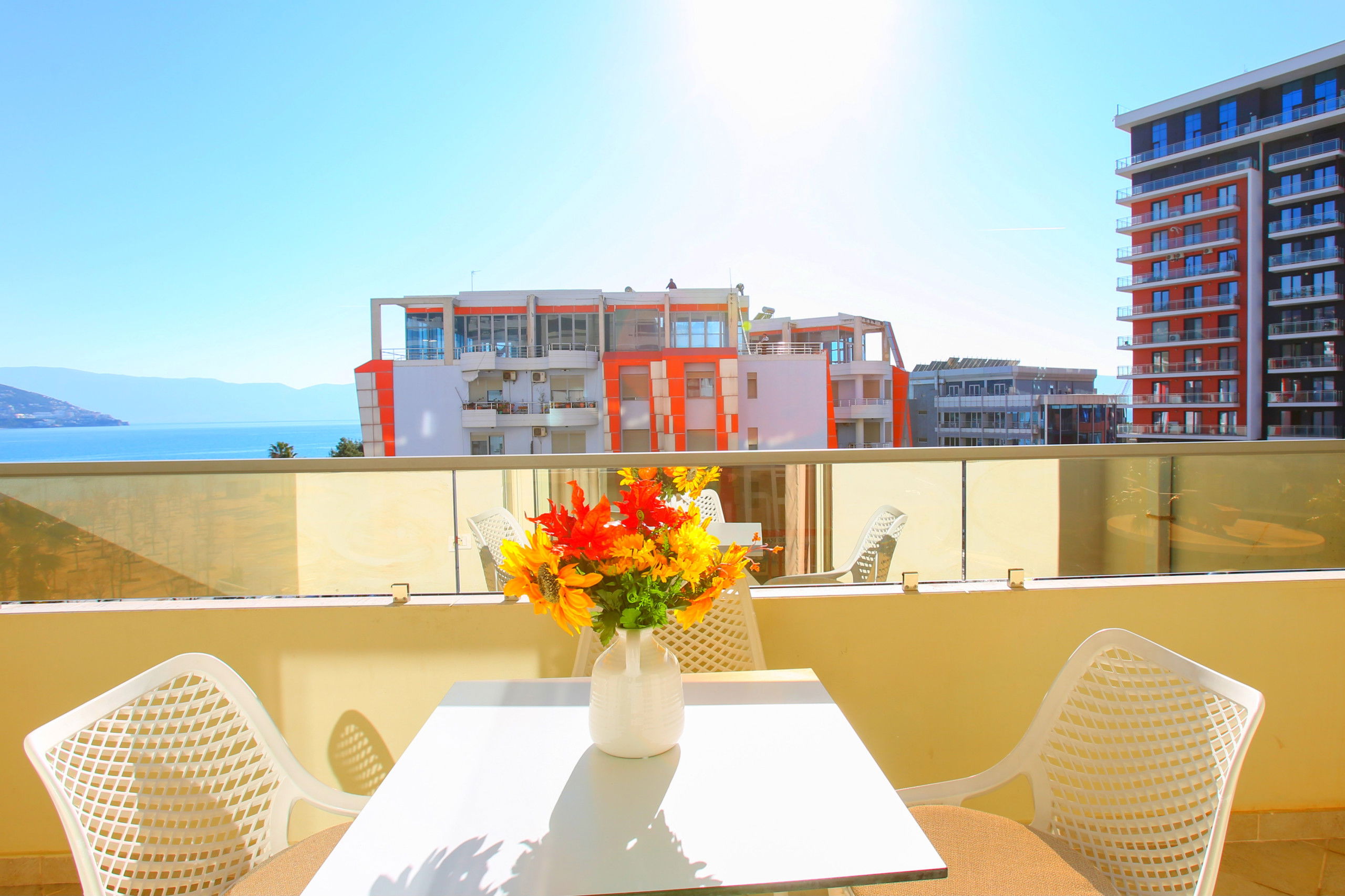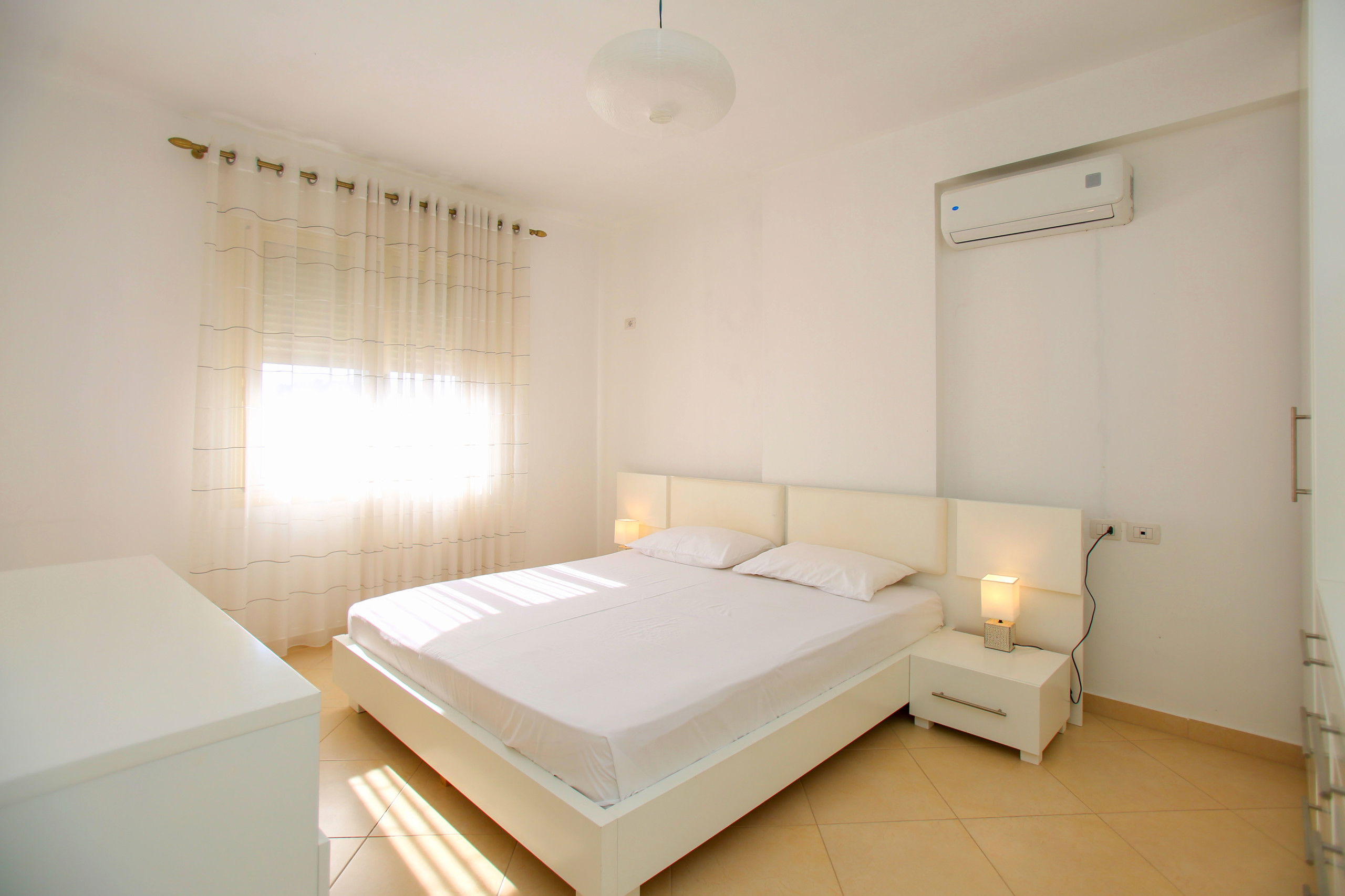 The apartment in Vlorë has 2 bedrooms and capacity for 5 people. A cosy 80 m² fully equipped accommodation, positioned seafront, with sea and mountain view. It is located 10 m from "Big Market" supermarket, 150 m from the sandy beach, 30 km from "Llogara National Park", 150 km from "Tirana International Airport" and is situated in an ideal area for families and near the sea. It has lift, washing machine, internet access (wifi), hairdryer, balconies, heat pump heating, air conditioning, 1 Television. The American kitchen, electric, is equipped with refrigerator, microwave, oven, freezer, dishes/cutlery, kitchen utensils and kettle.