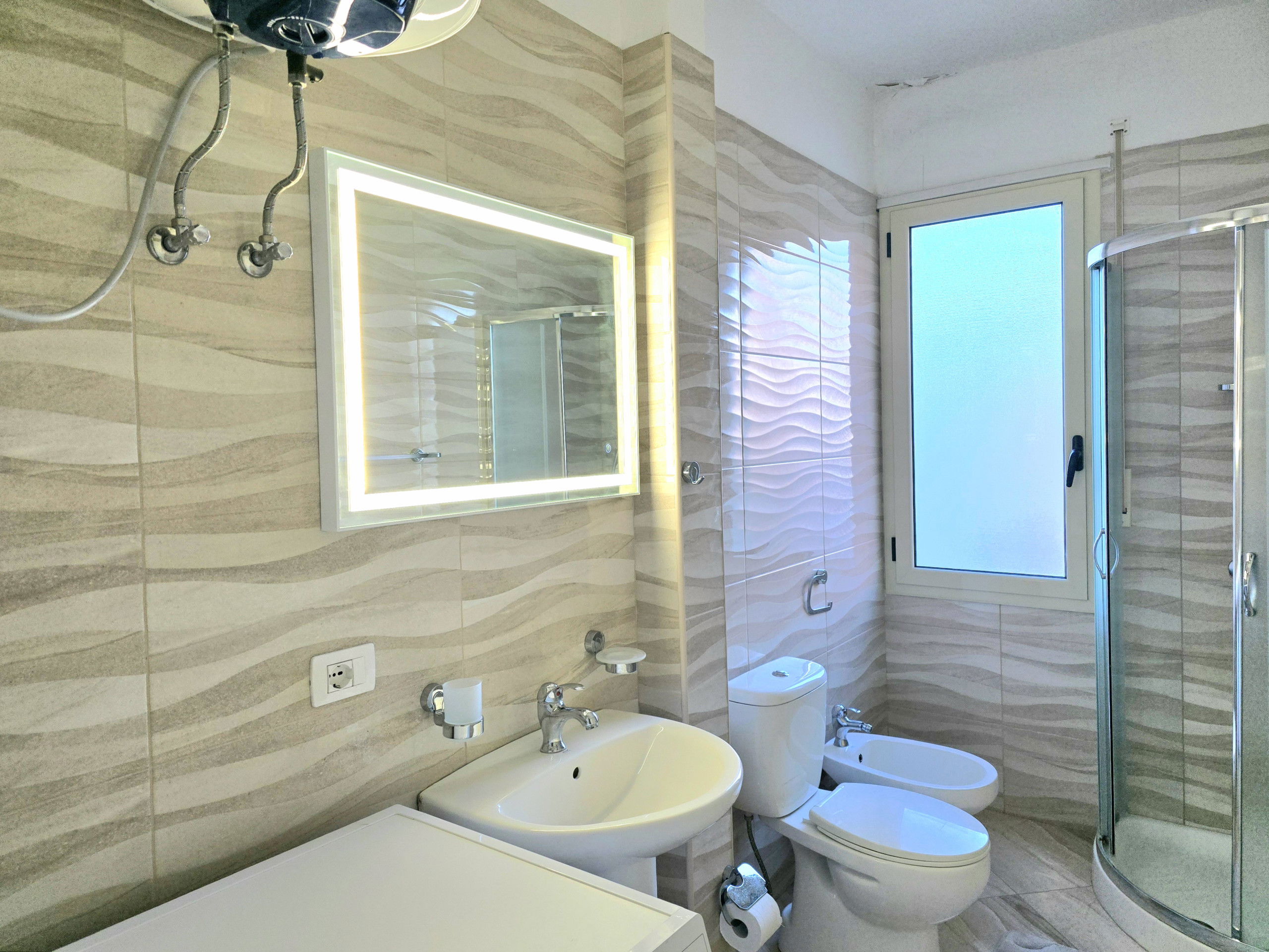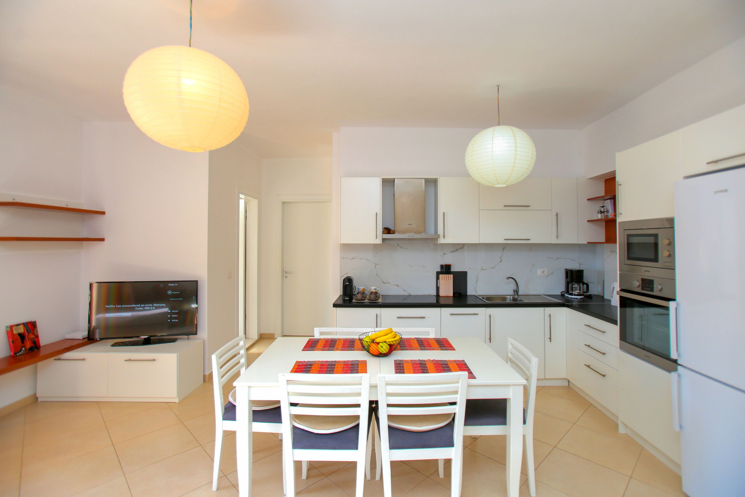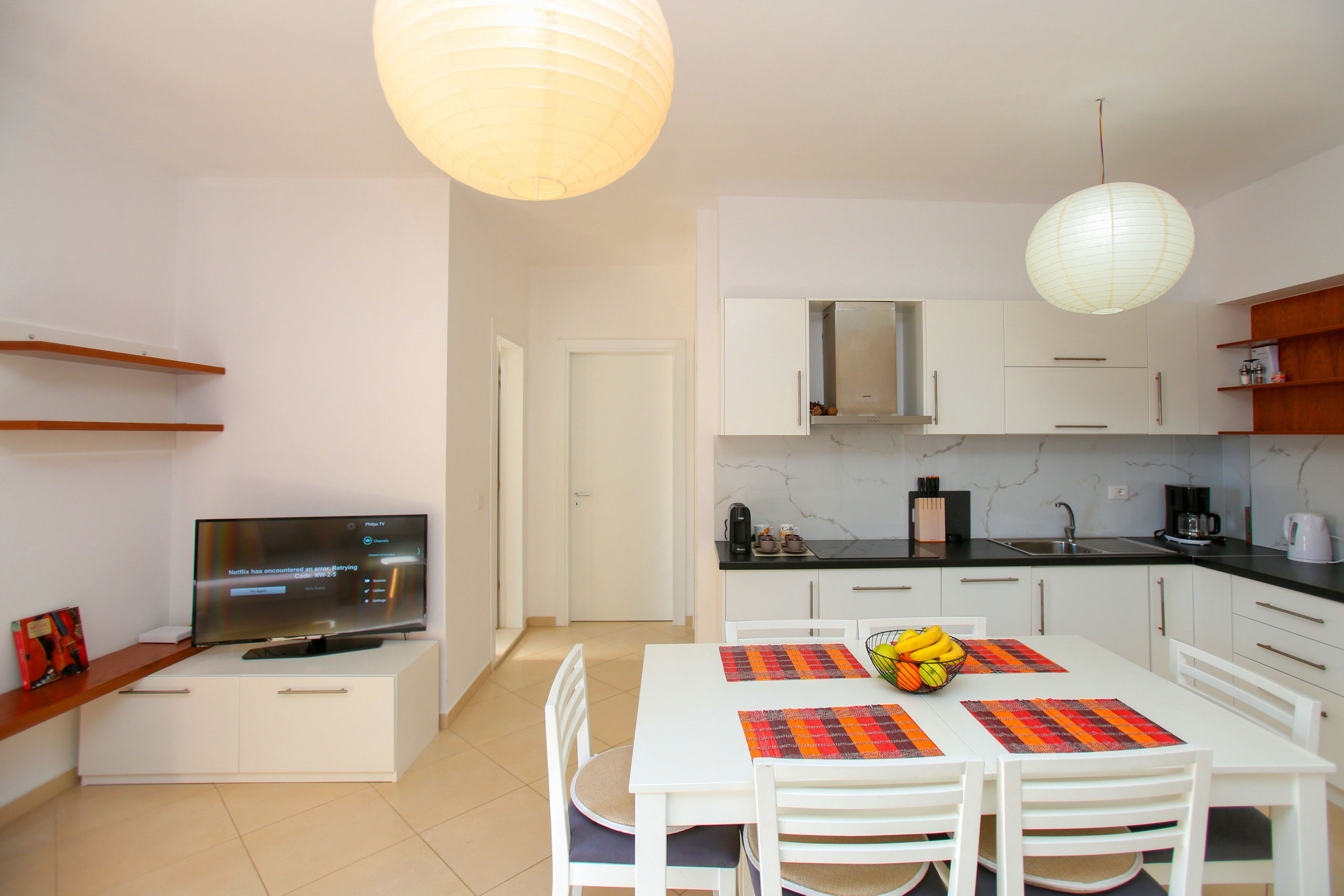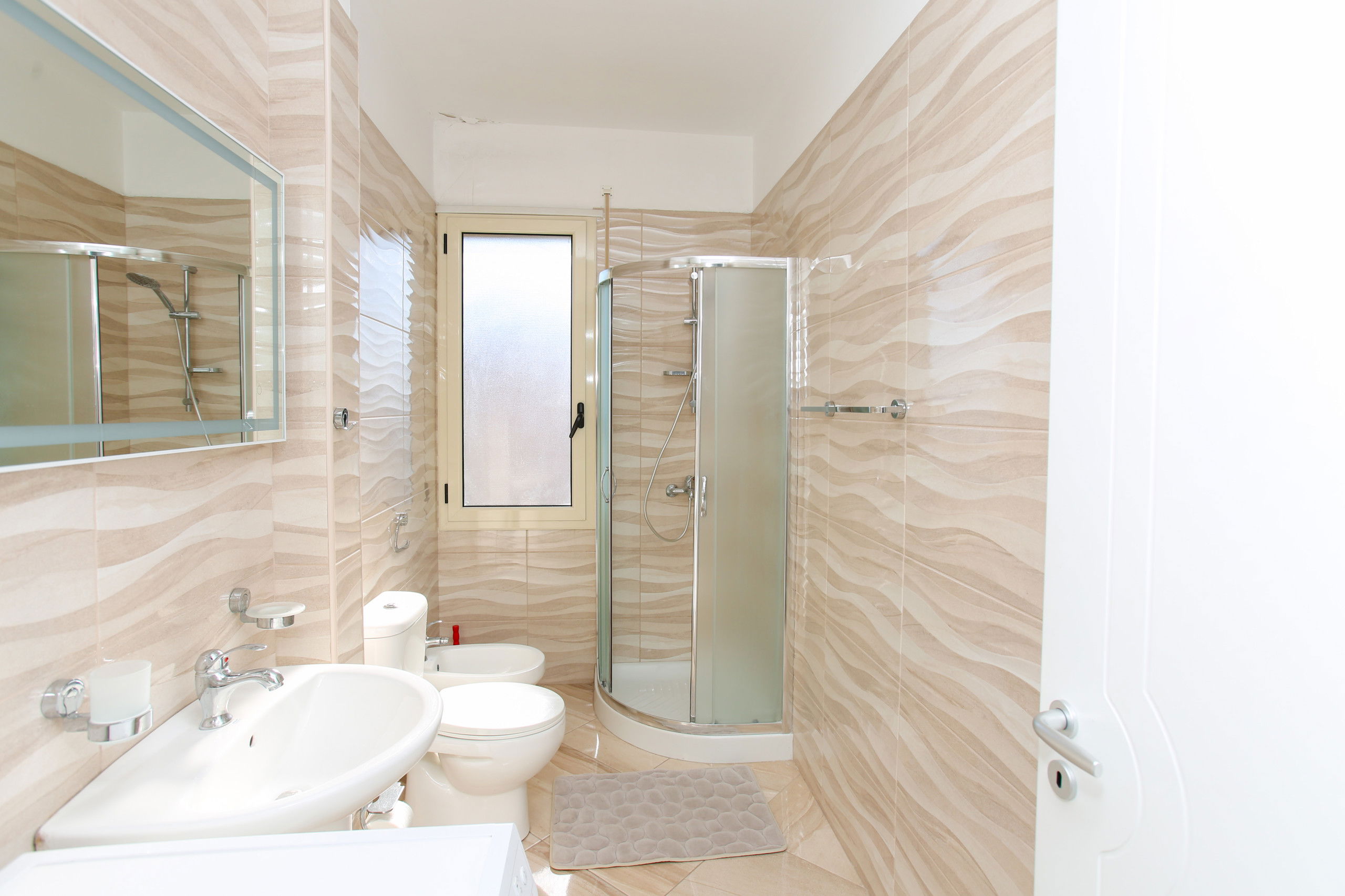 The apartment in Vlorë has 2 bedrooms and capacity for 5 people. A cosy 80 m² fully equipped accommodation, positioned seafront, with sea and mountain view. It is located 10 m from "Big Market" supermarket, 150 m from the sandy beach, 30 km from "Llogara National Park", 150 km from "Tirana International Airport" and is situated in an ideal area for families and near the sea. It has lift, washing machine, internet access (wifi), hairdryer, balconies, heat pump heating, air conditioning, 1 Television. The American kitchen, electric, is equipped with refrigerator, microwave, oven, freezer, dishes/cutlery, kitchen utensils and kettle.