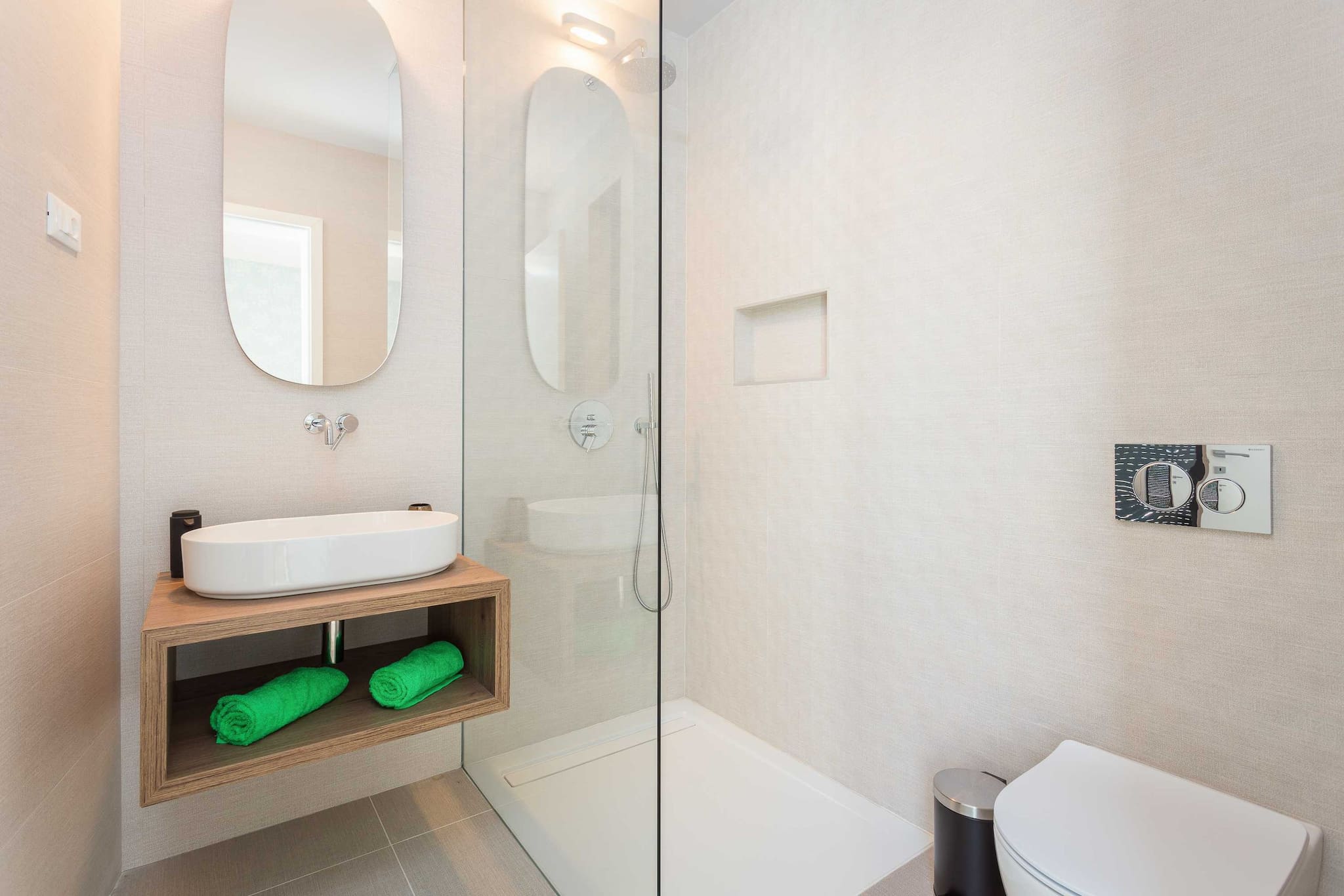 Beautifully designed staircase leads to a living room with sea view and lounge area, big kitchen with dining area and a big terrace with outdoor dining area and outstanding view. Guests can use BBQ facilities and dine enjoying the sea breeze.