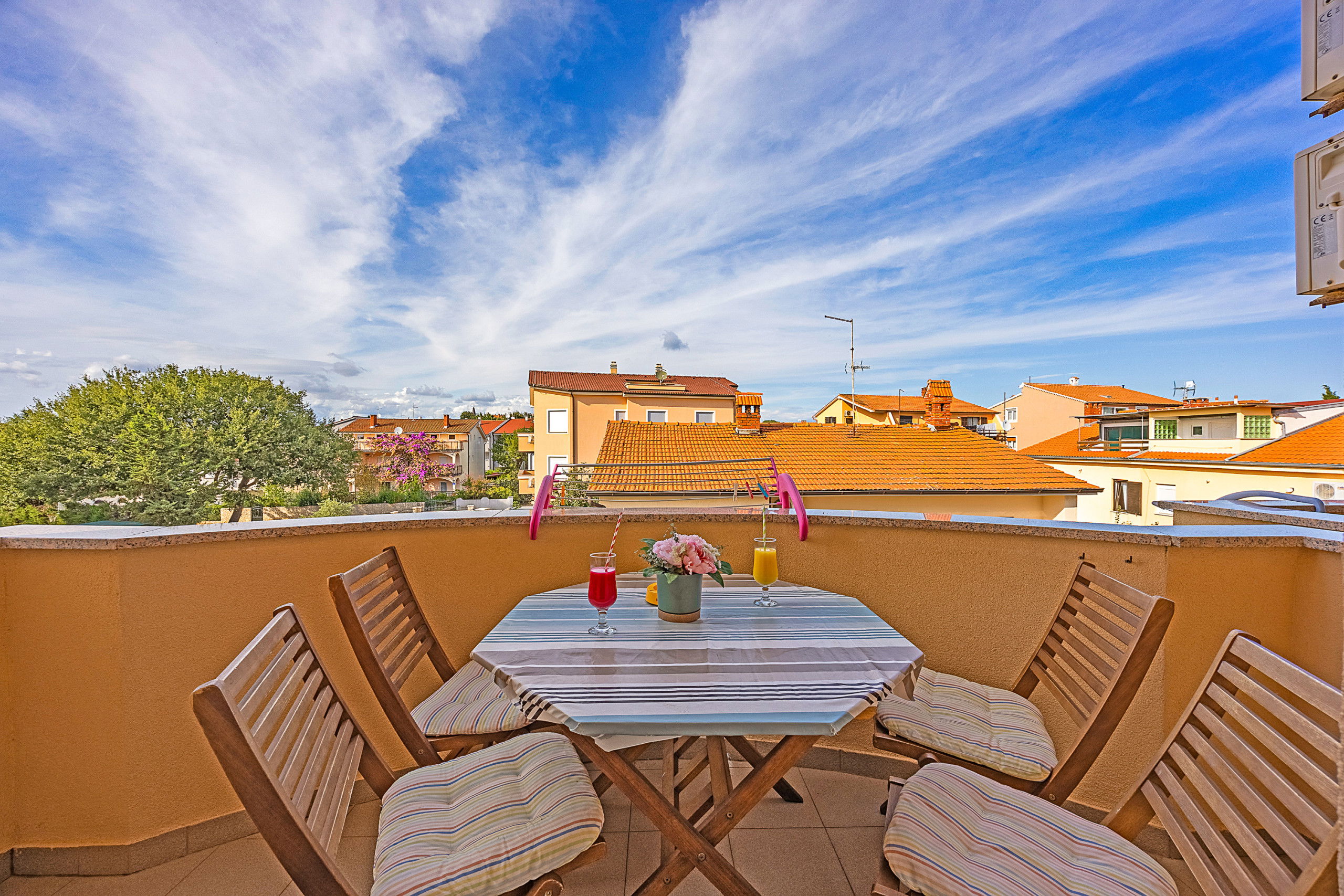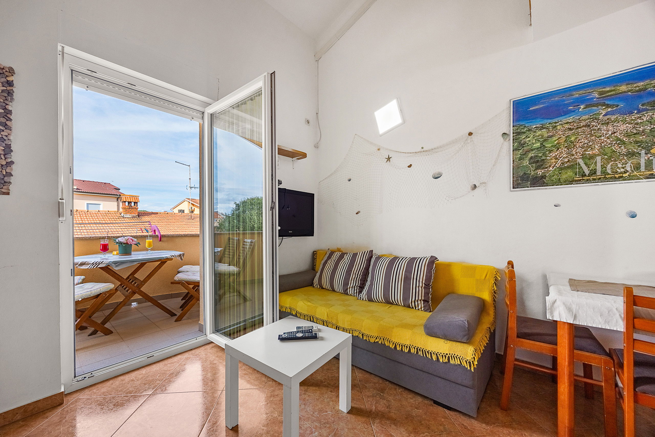 This studio apartment has a kitchen, bathroom and two beds. There's a double bed on the gallery and also a convertible sofa, which makes this space suitable for 2 adults and 2 children. Lovely balcony is perfect to enjoy the sea breeze.