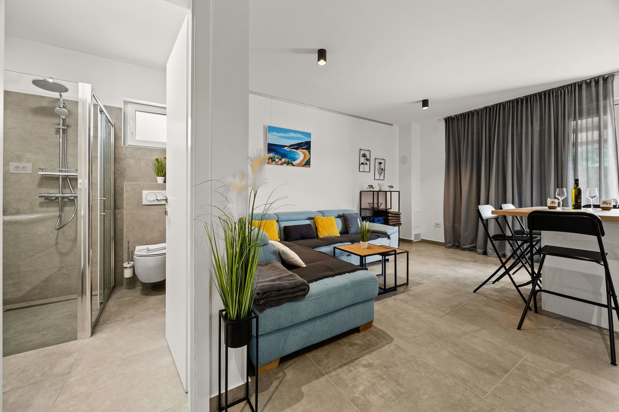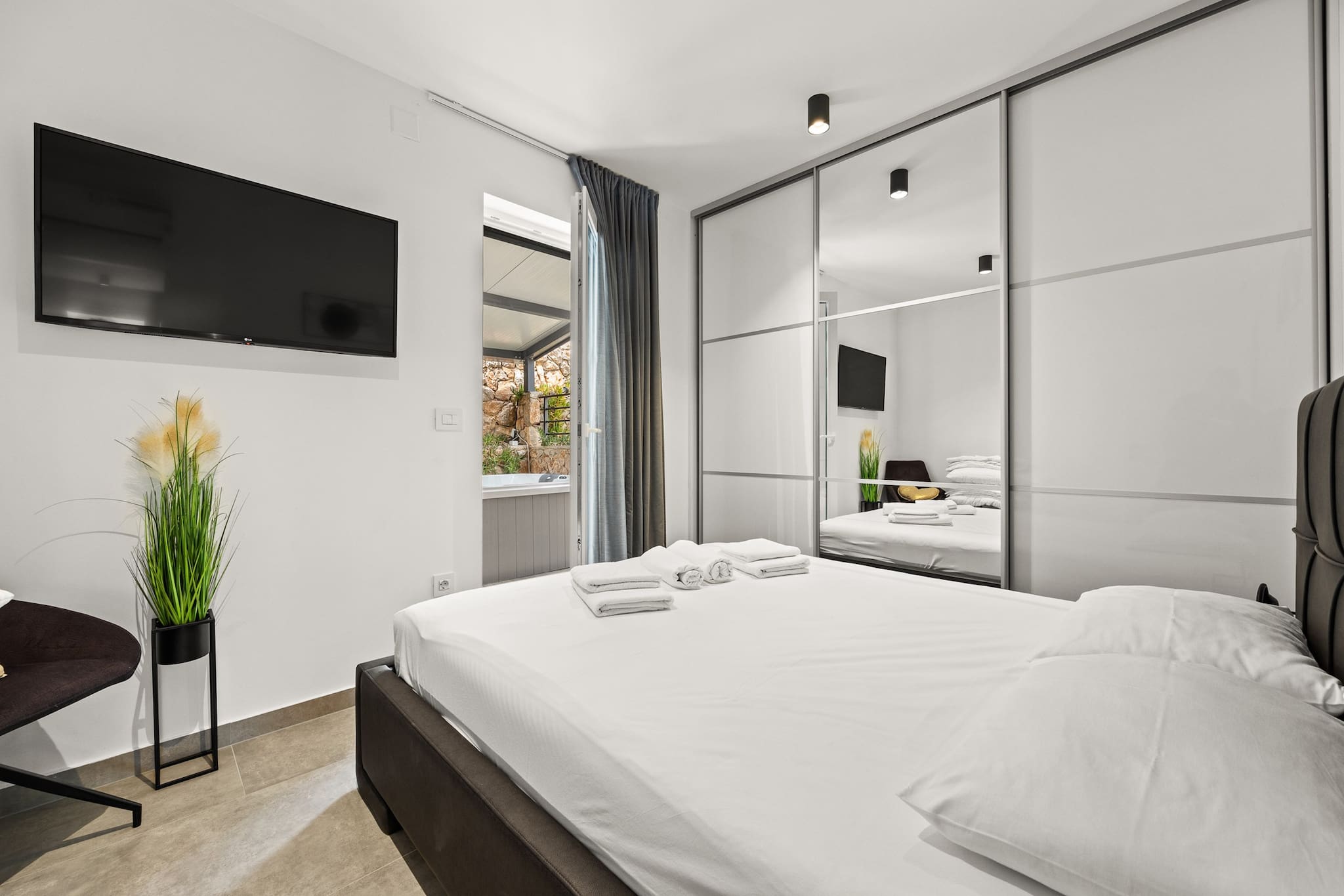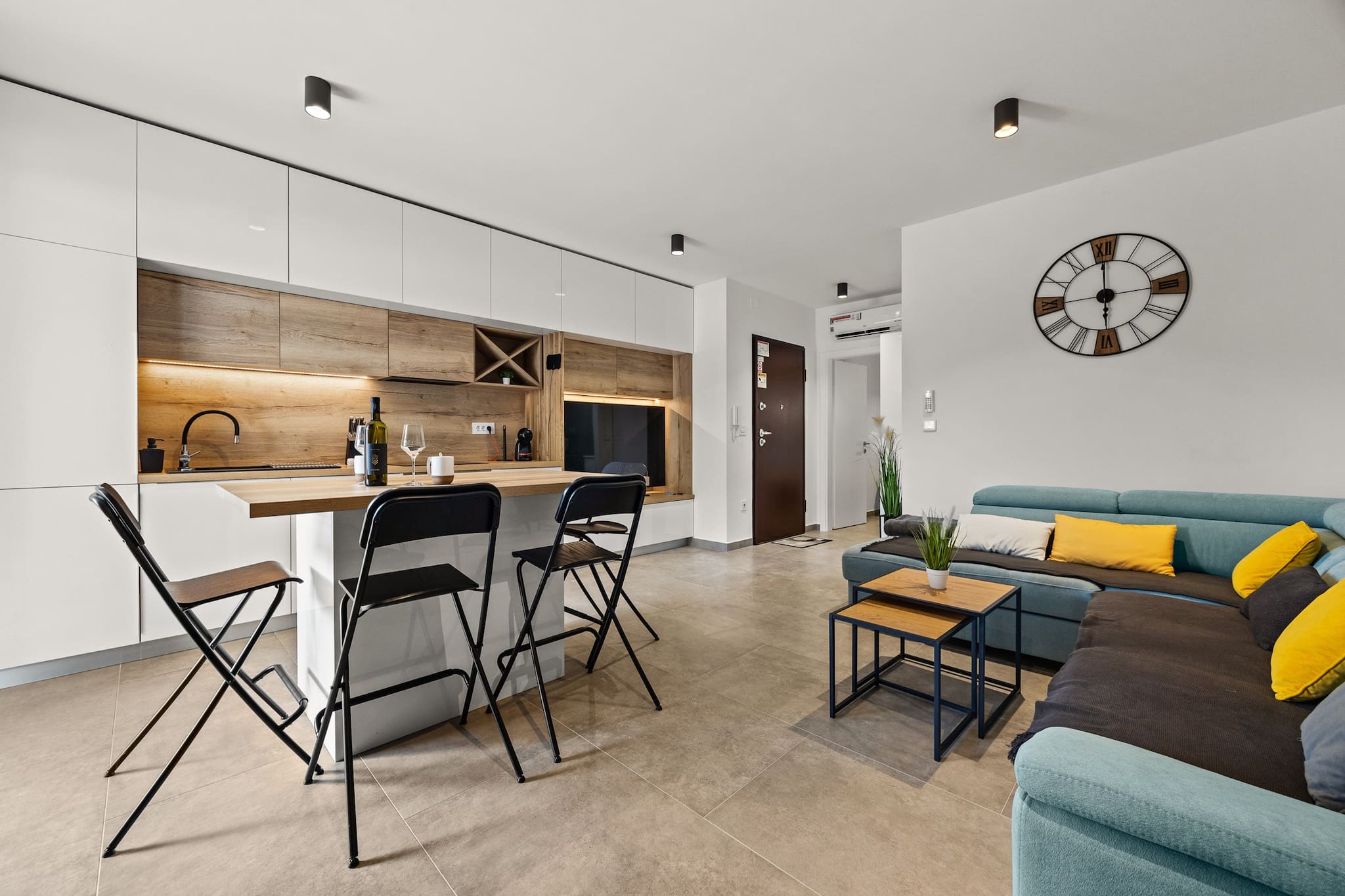 Apartment consists of a modernly decorated open spaced living room with kitchen, one bedroom, one bathroom and a terrace with jacuzzi and lounge area.