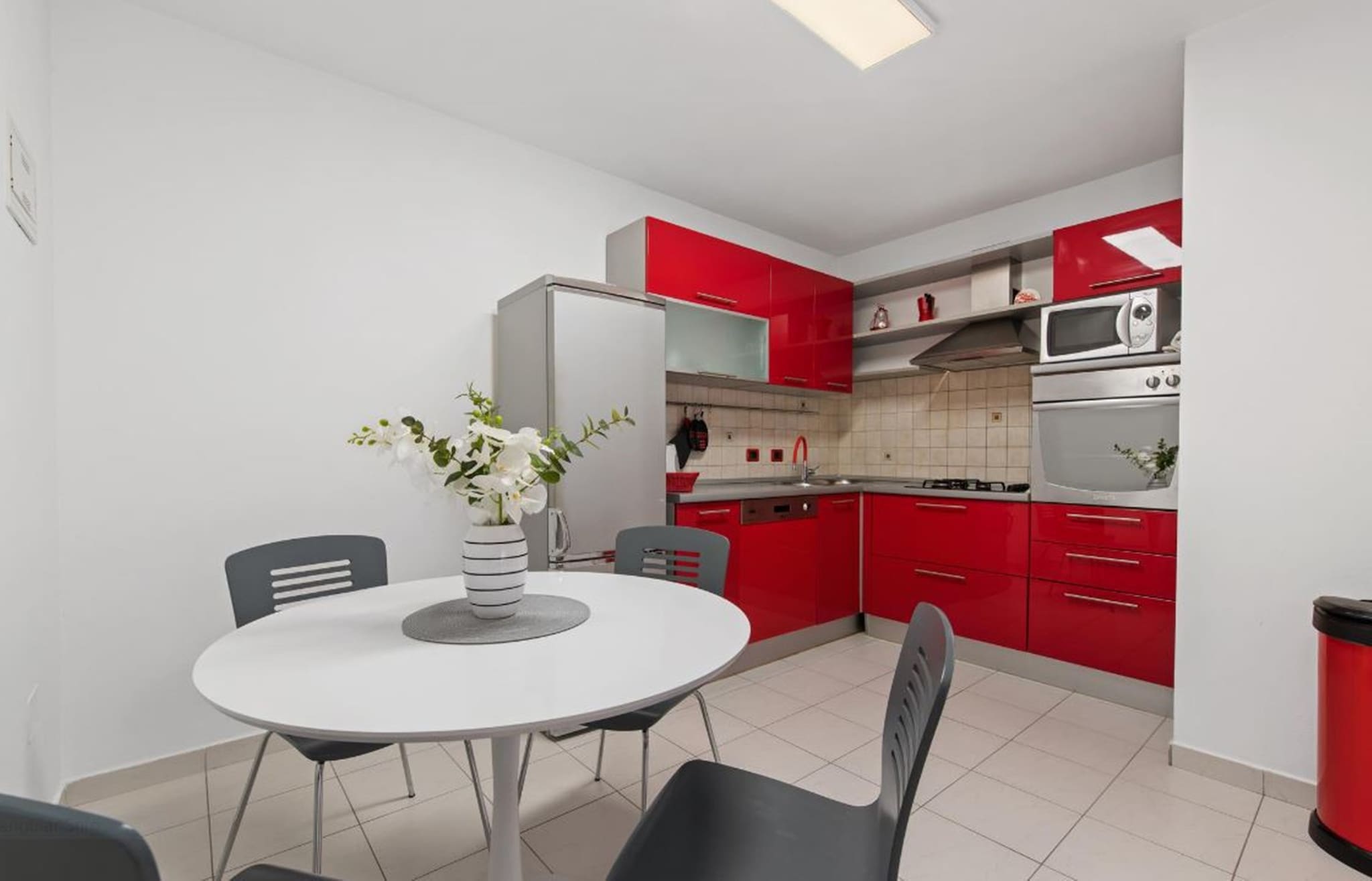 This two bedroom apartment is perfect for a family with two children. It has two bedrooms, living room connected with a fully equipped kitchen, and one bathroom.