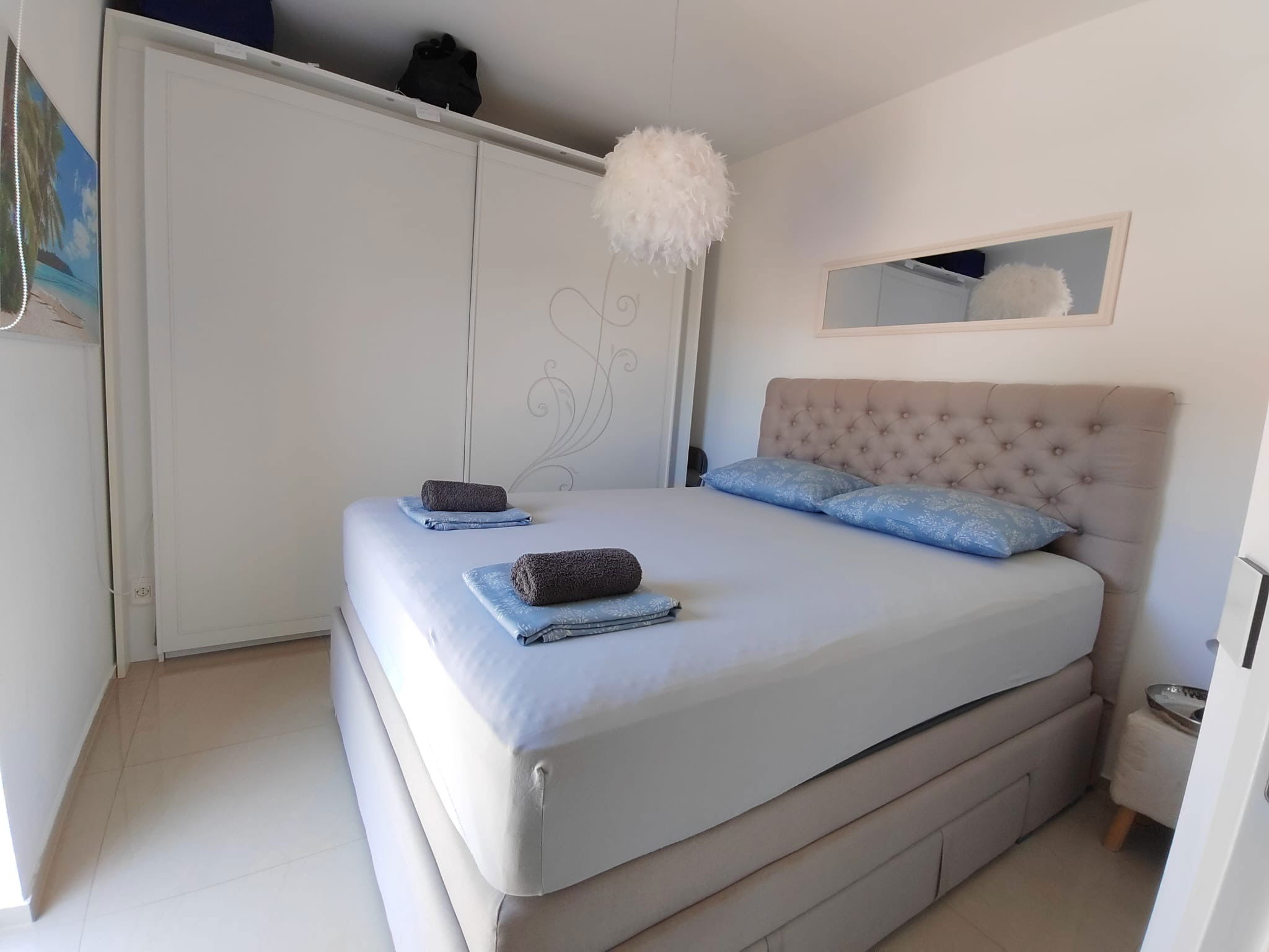 It consists of a lovely balcony with sea view, living room/kitchen, two bedrooms and a bathroom. Both bedrooms have double beds, and addiitional fans for cooling.