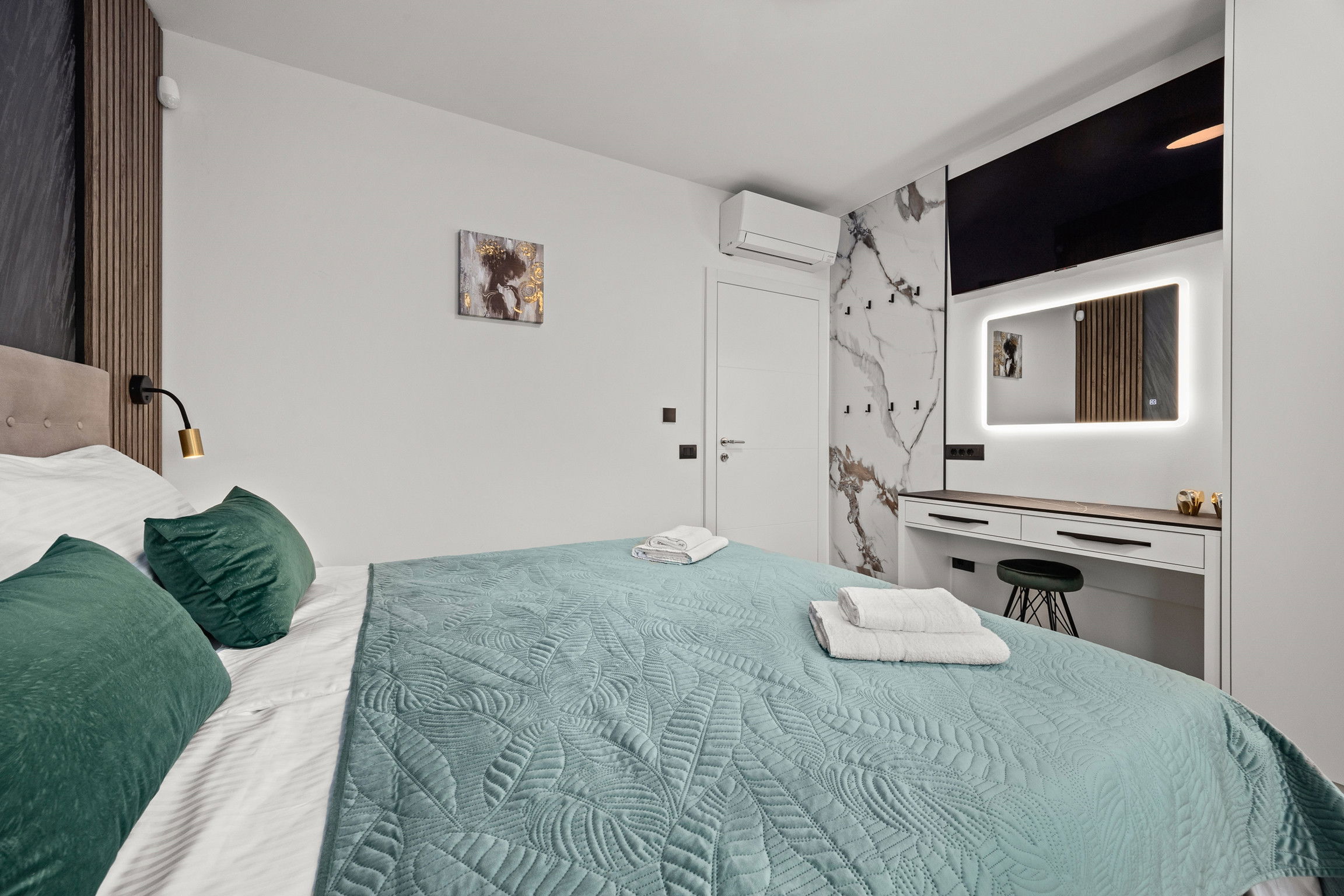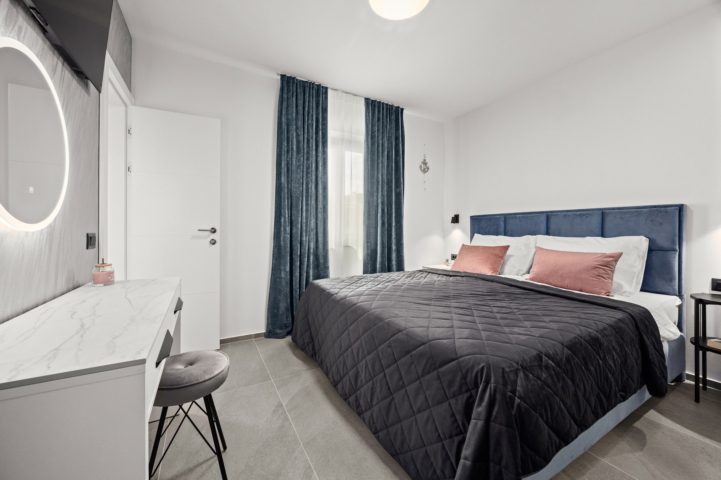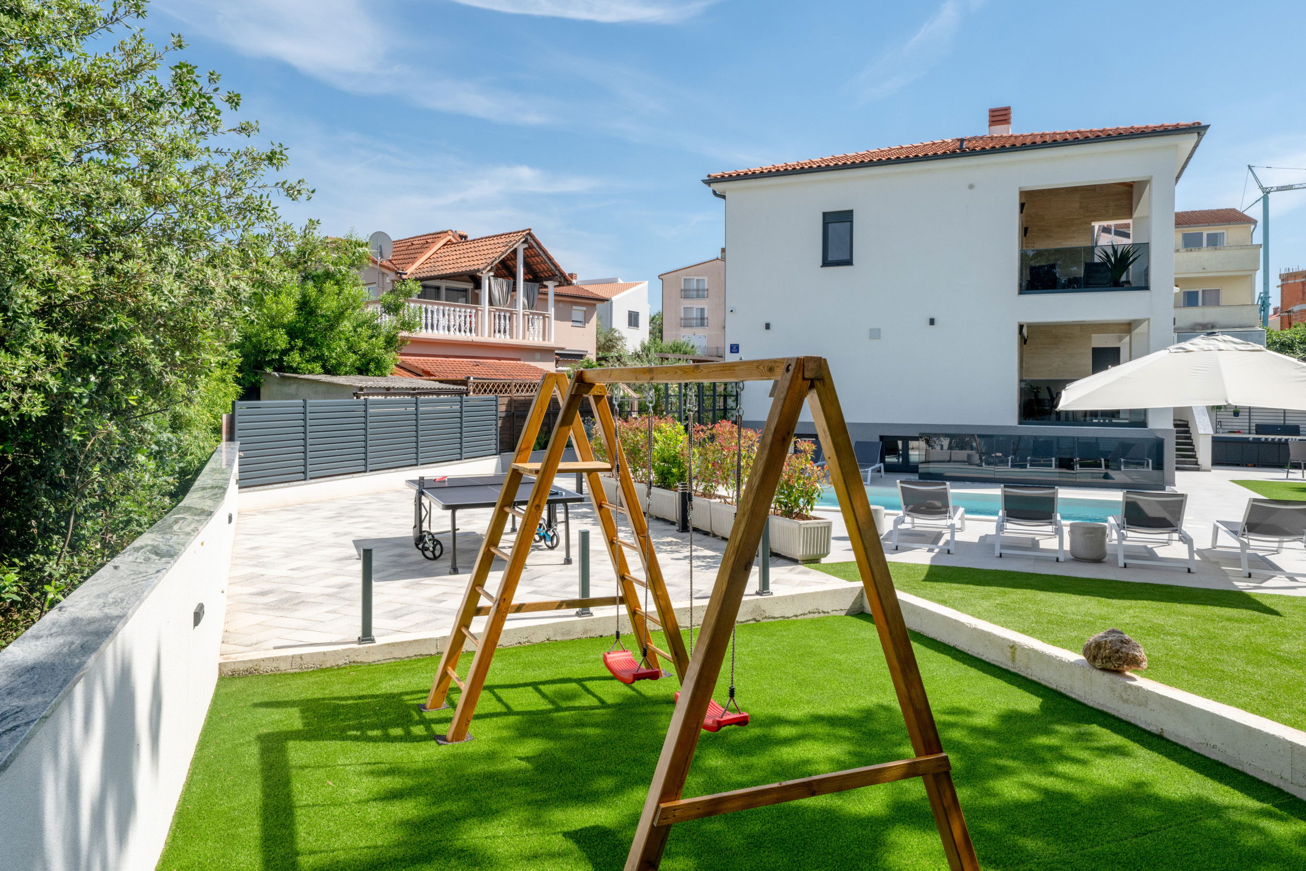 The beautiful Villa Antares is surrounded by a calming garden with a swimming pool and a children's playground. Ground floor of the house consists of a luxuriously decorated living room and kitchen with access to the terrace overlooking the garden. You can dine on the terrace, enjoying the fresh sea breeze. One bedroom with a desk and make-up mirror is also located on the ground floor, as well as a beautifully decorated bathroom.