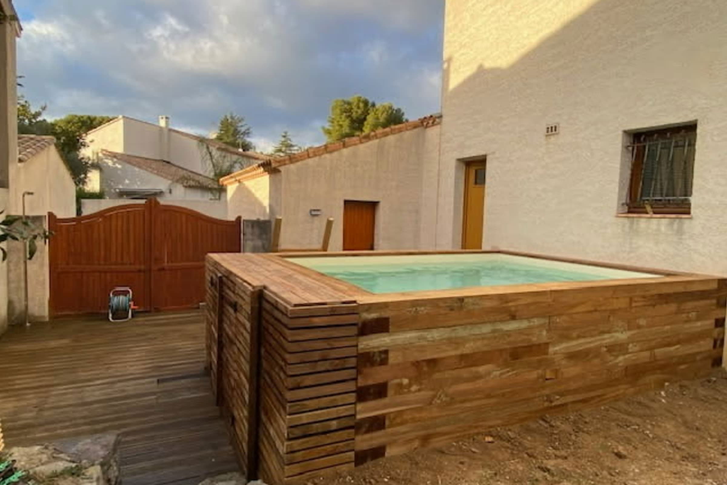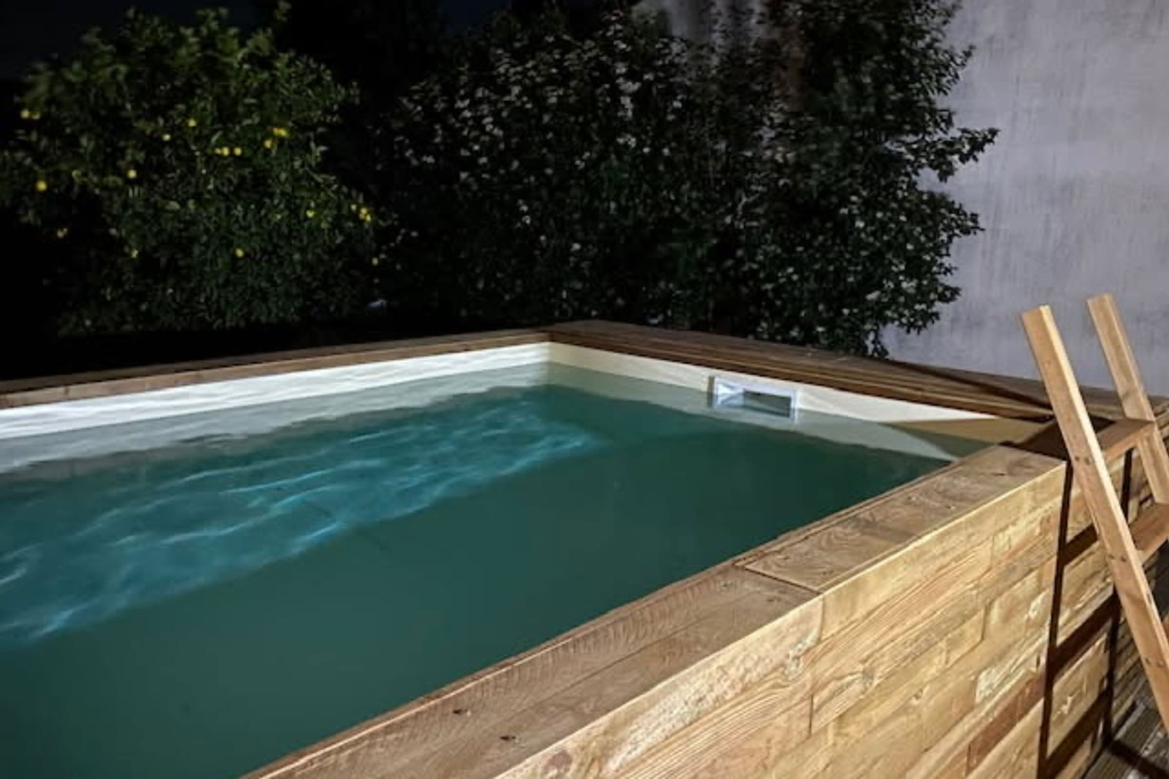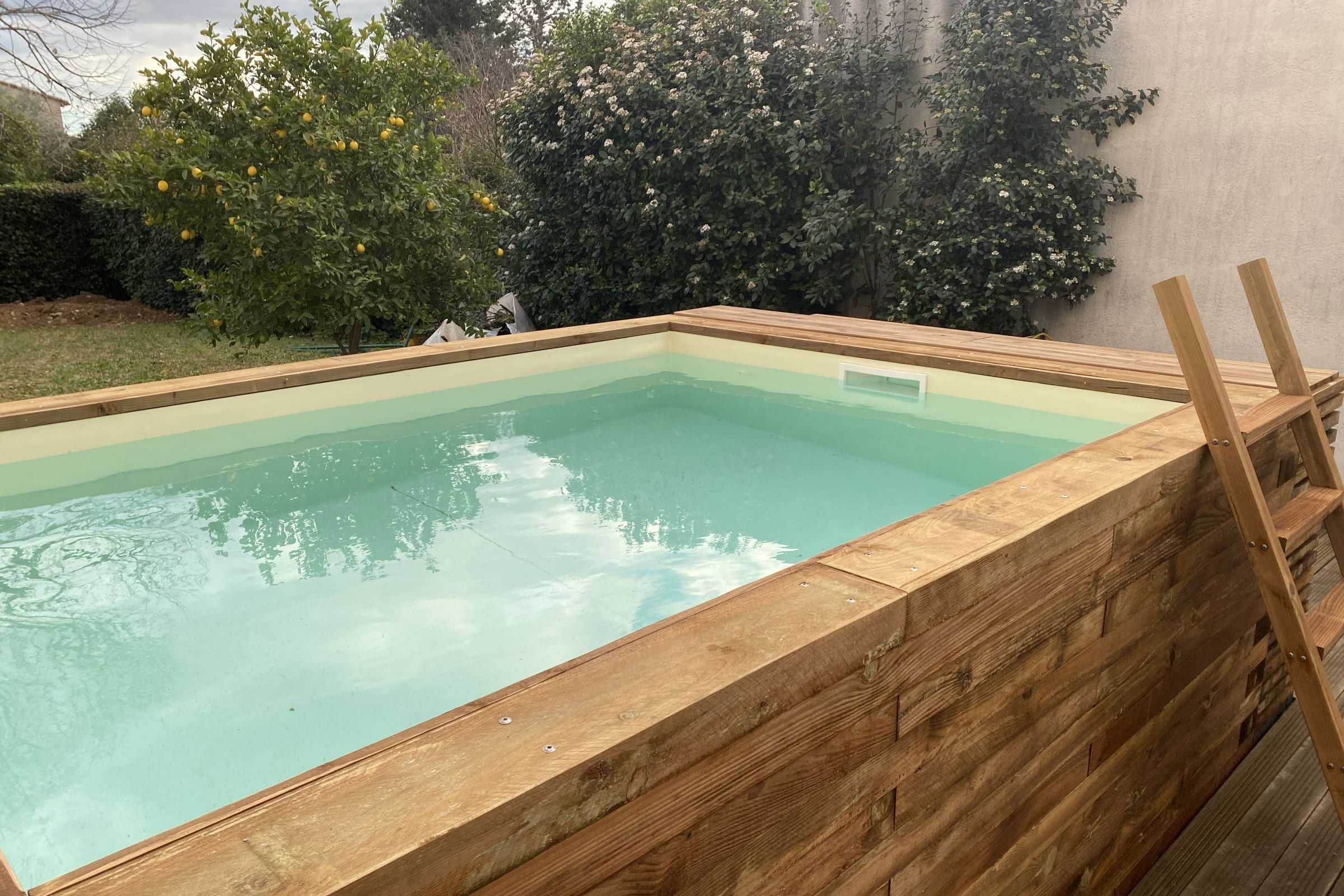 - a chlorine swimming pool, above ground, with wooden cladding and adapted ladder.