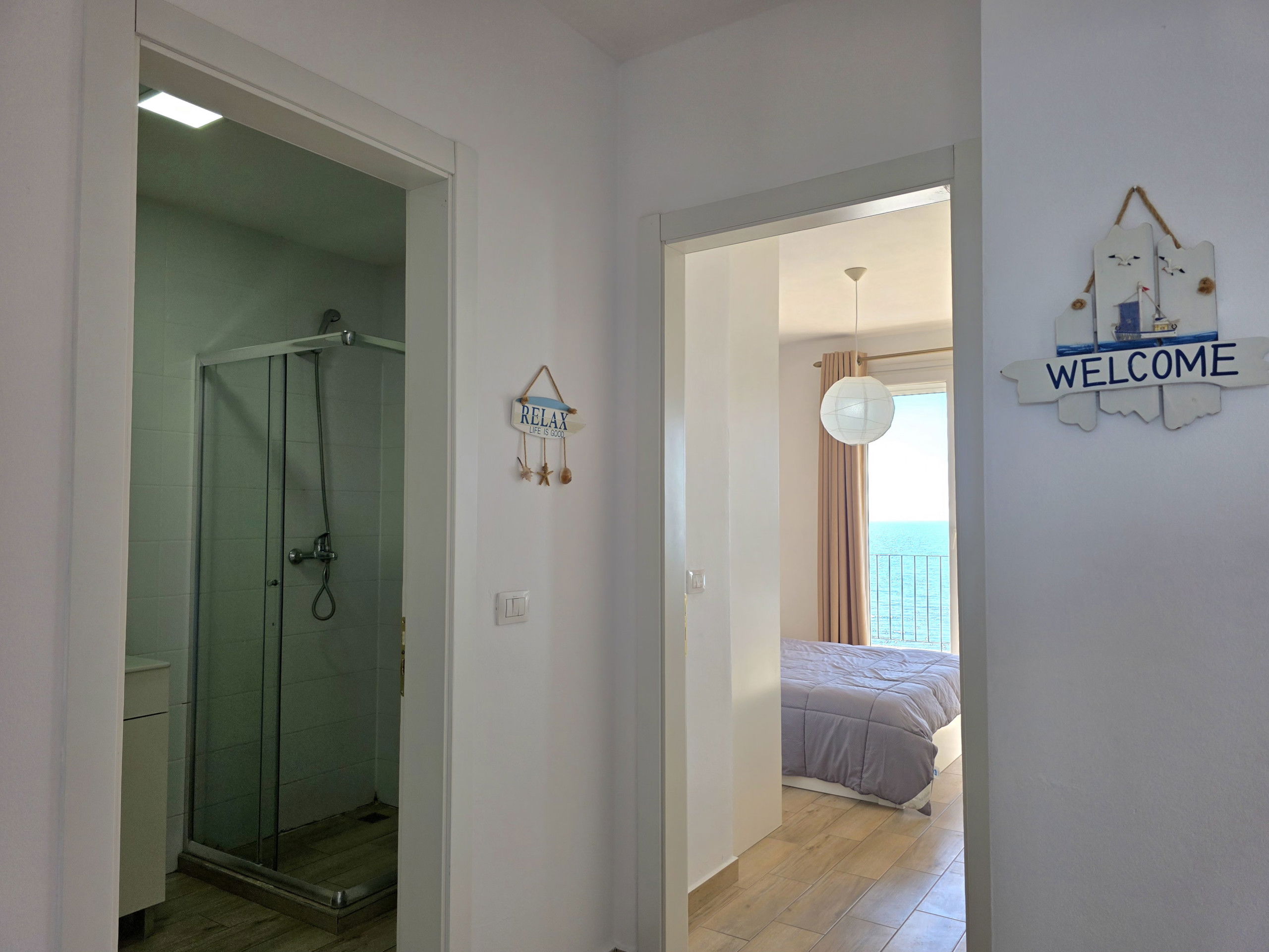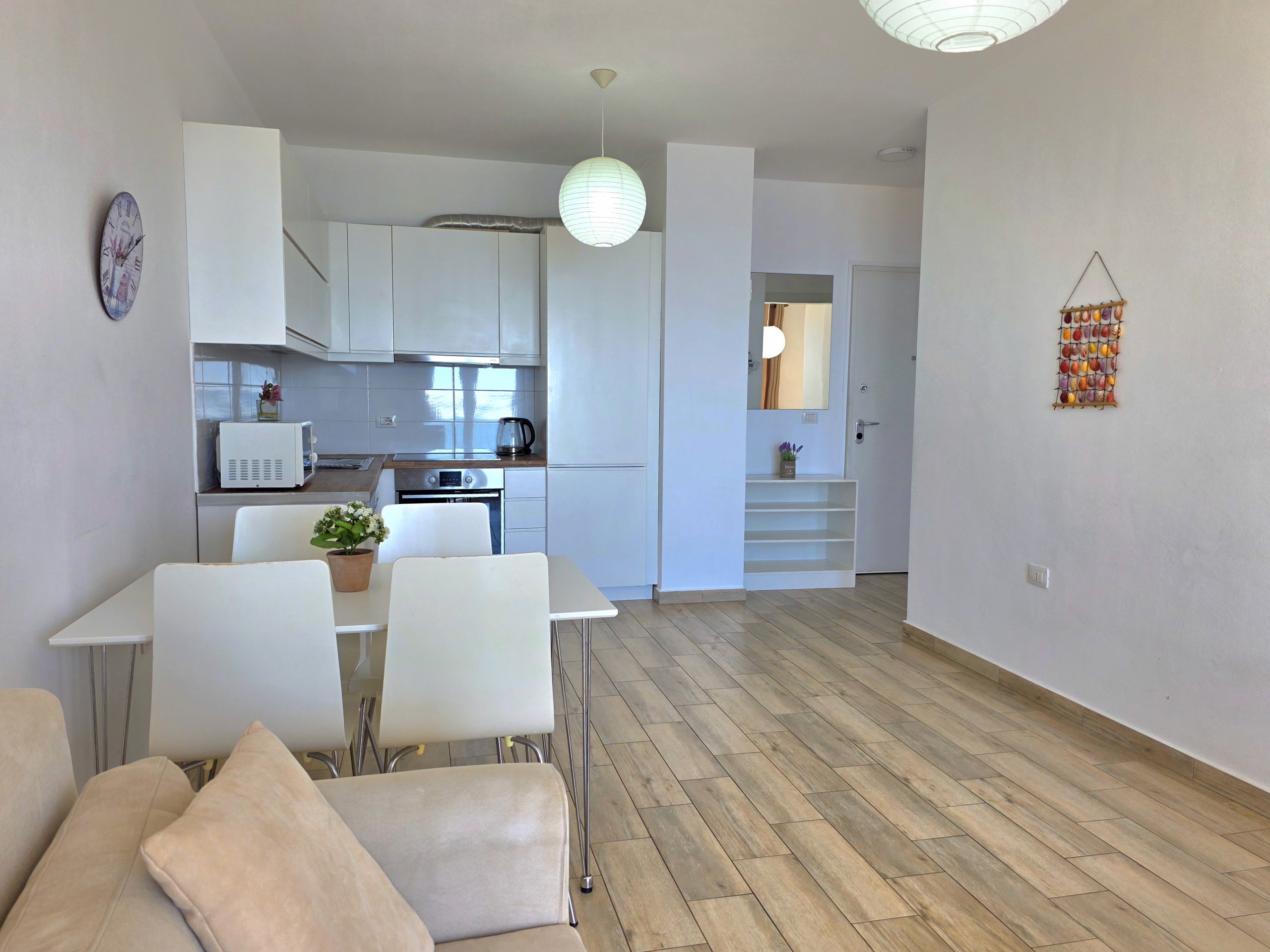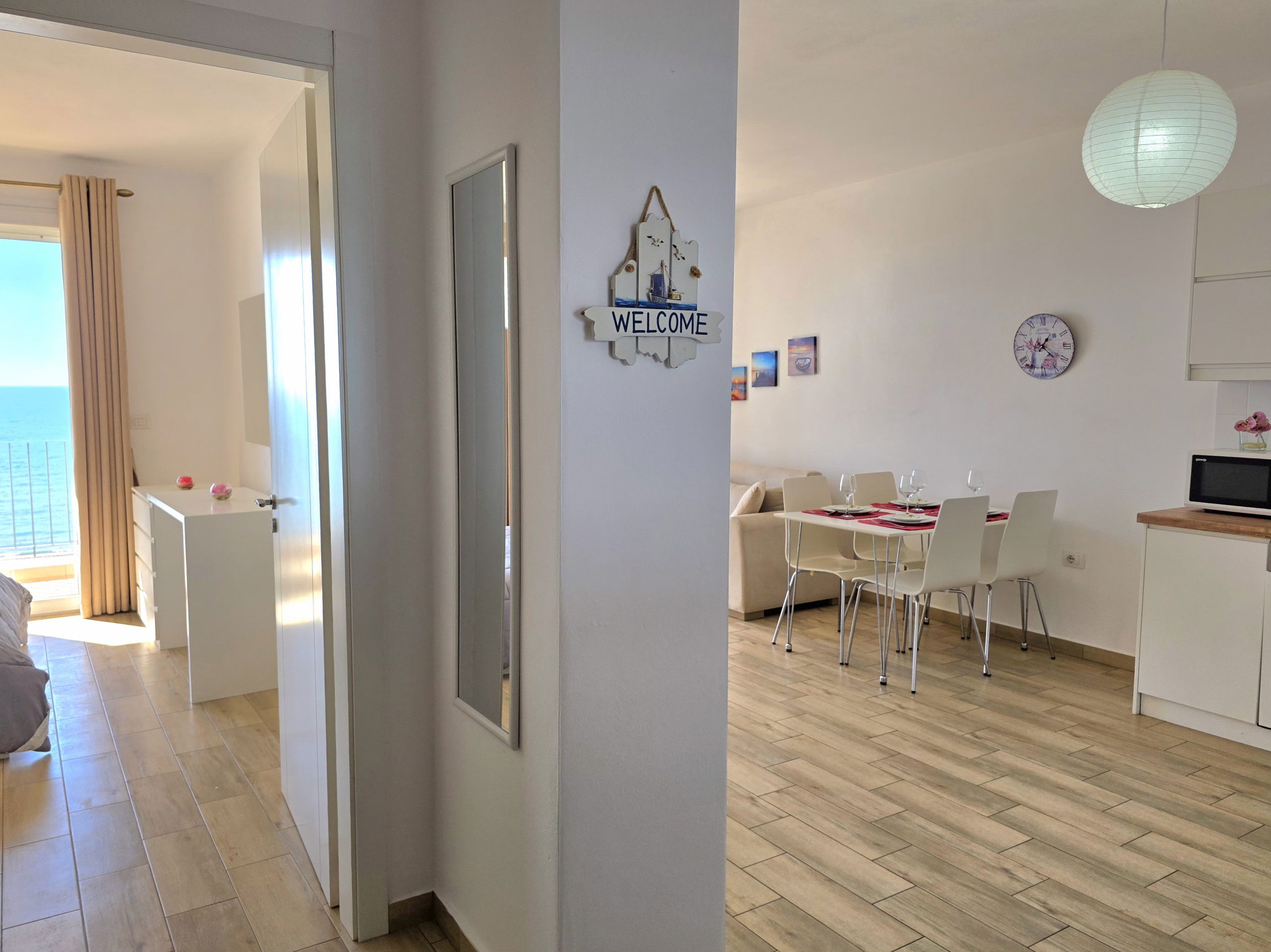 Enjoy the sea breeze and stunning views from the private balcony, which is furnished with an outdoor dining area. Other amenities include Wi-Fi, TV, essential items, and a wardrobe closet. The apartment also provides access to the beach, just 20 meters away.
