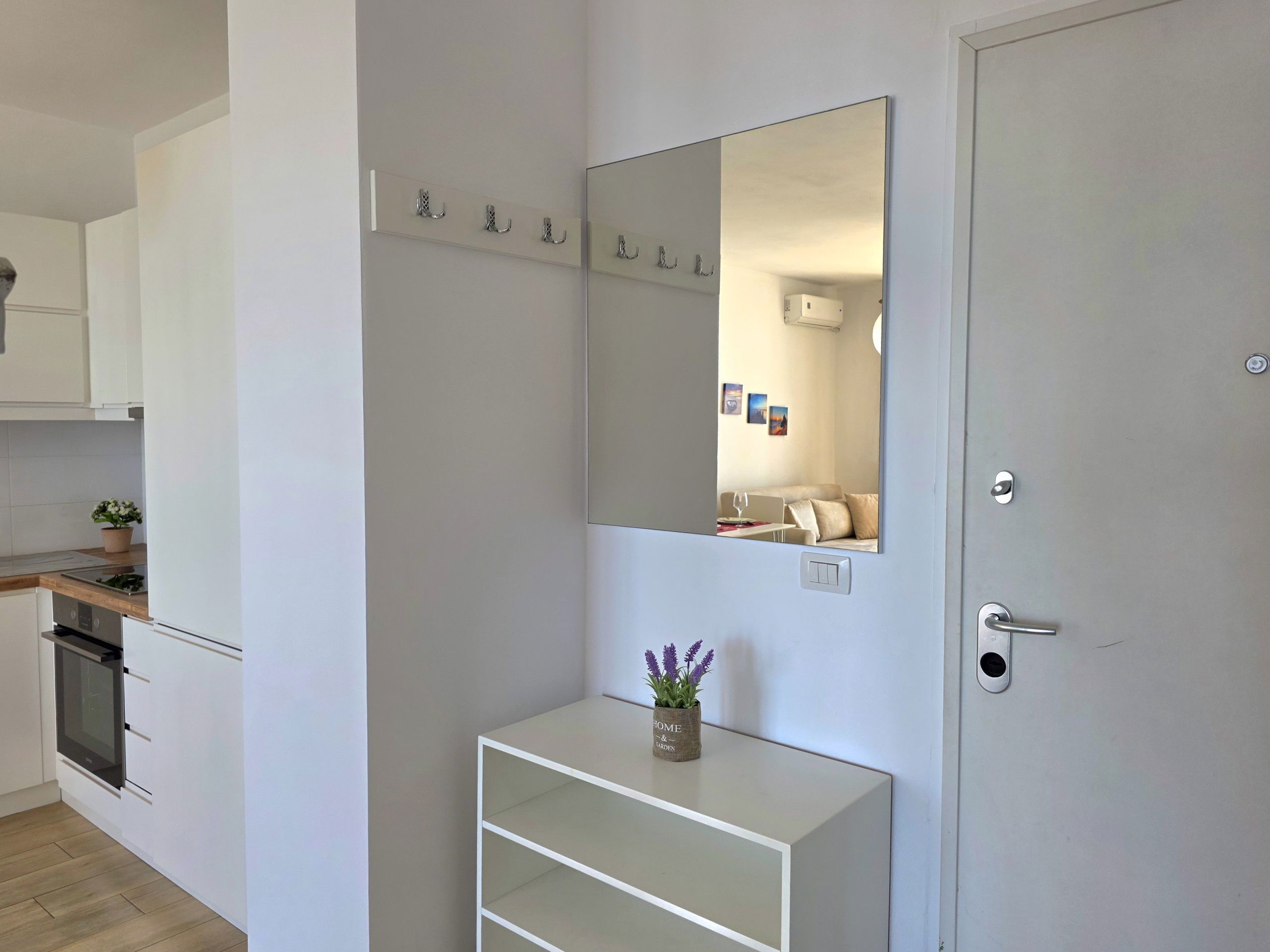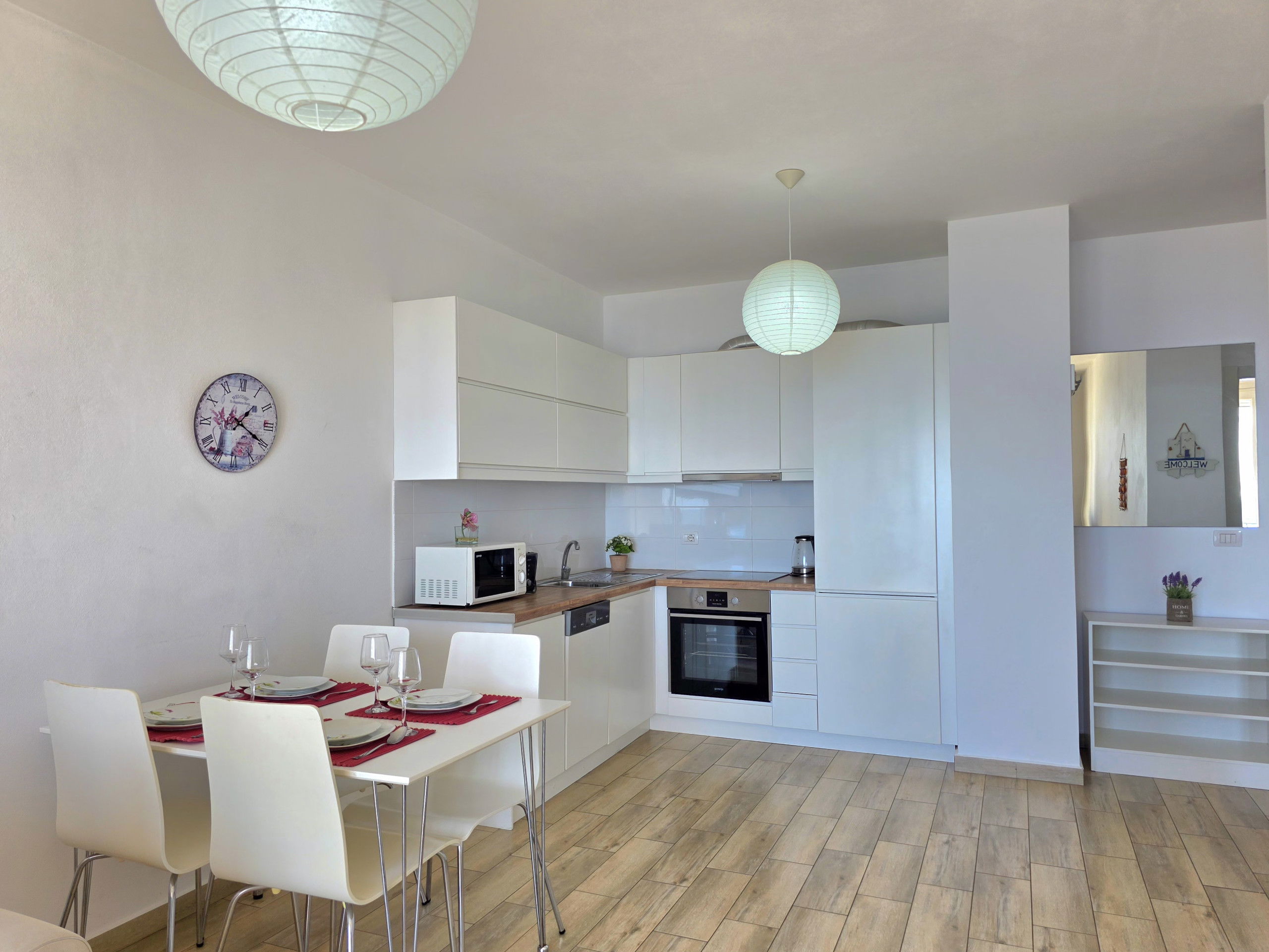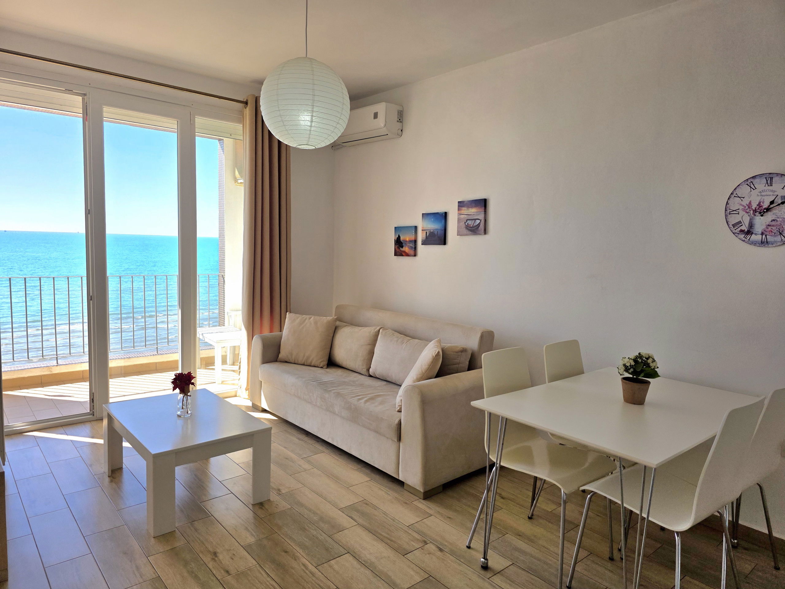 Enjoy the sea breeze and stunning views from the private balcony, which is furnished with an outdoor dining area. Other amenities include Wi-Fi, TV, essential items, and a wardrobe closet. The apartment also provides access to the beach, just 20 meters away.