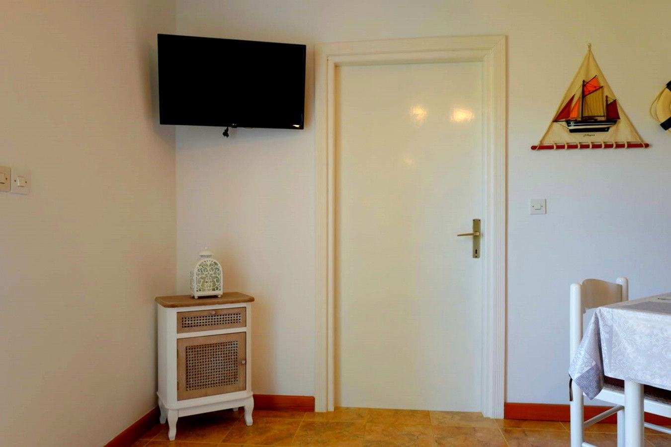 The apartment boasts a modern, open-plan American kitchen fully equipped with essential appliances including a dishwasher, microwave, coffee machine, and kettle. Enjoy the convenience of a flat-screen TV with satellite channels and complimentary WiFi throughout the space. The air conditioning ensures a comfortable stay during warmer months.