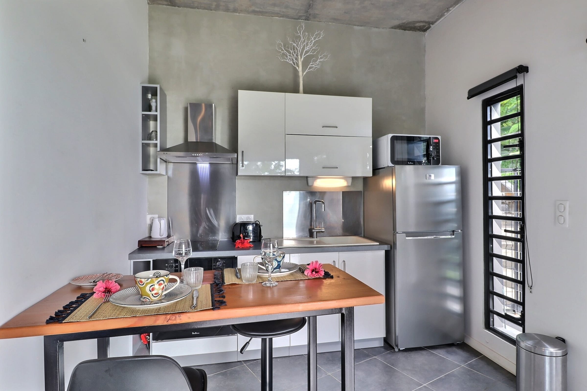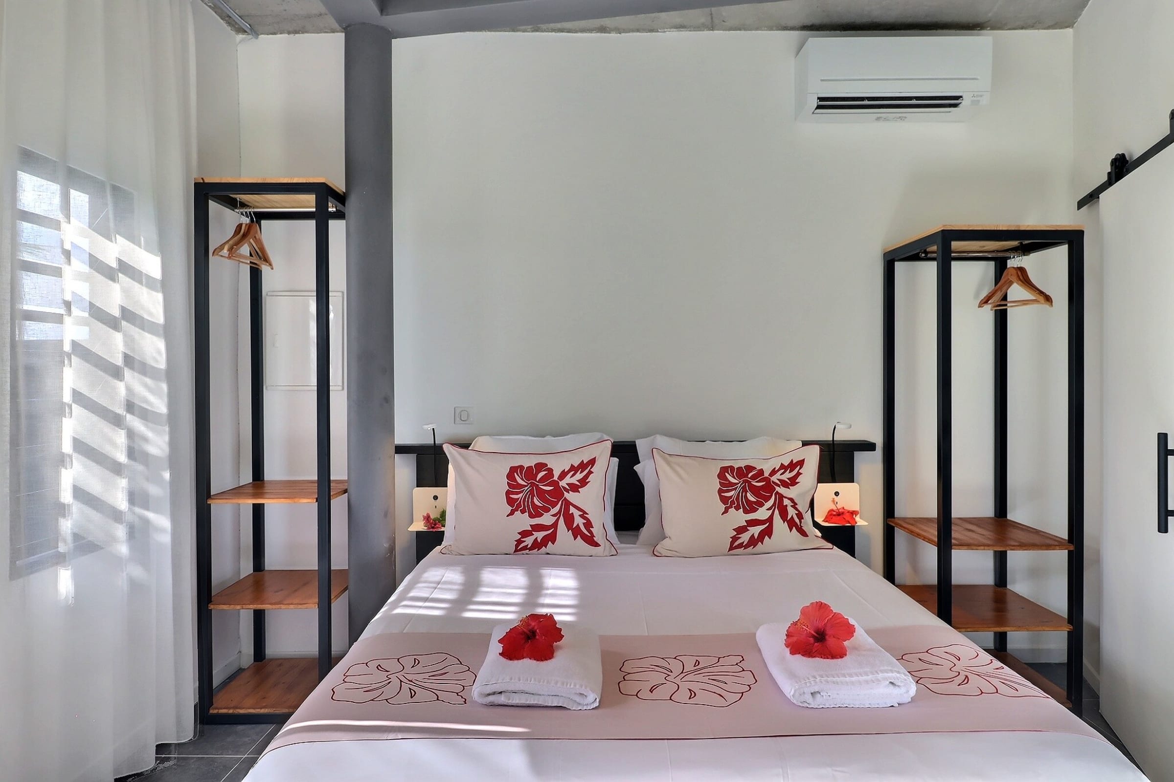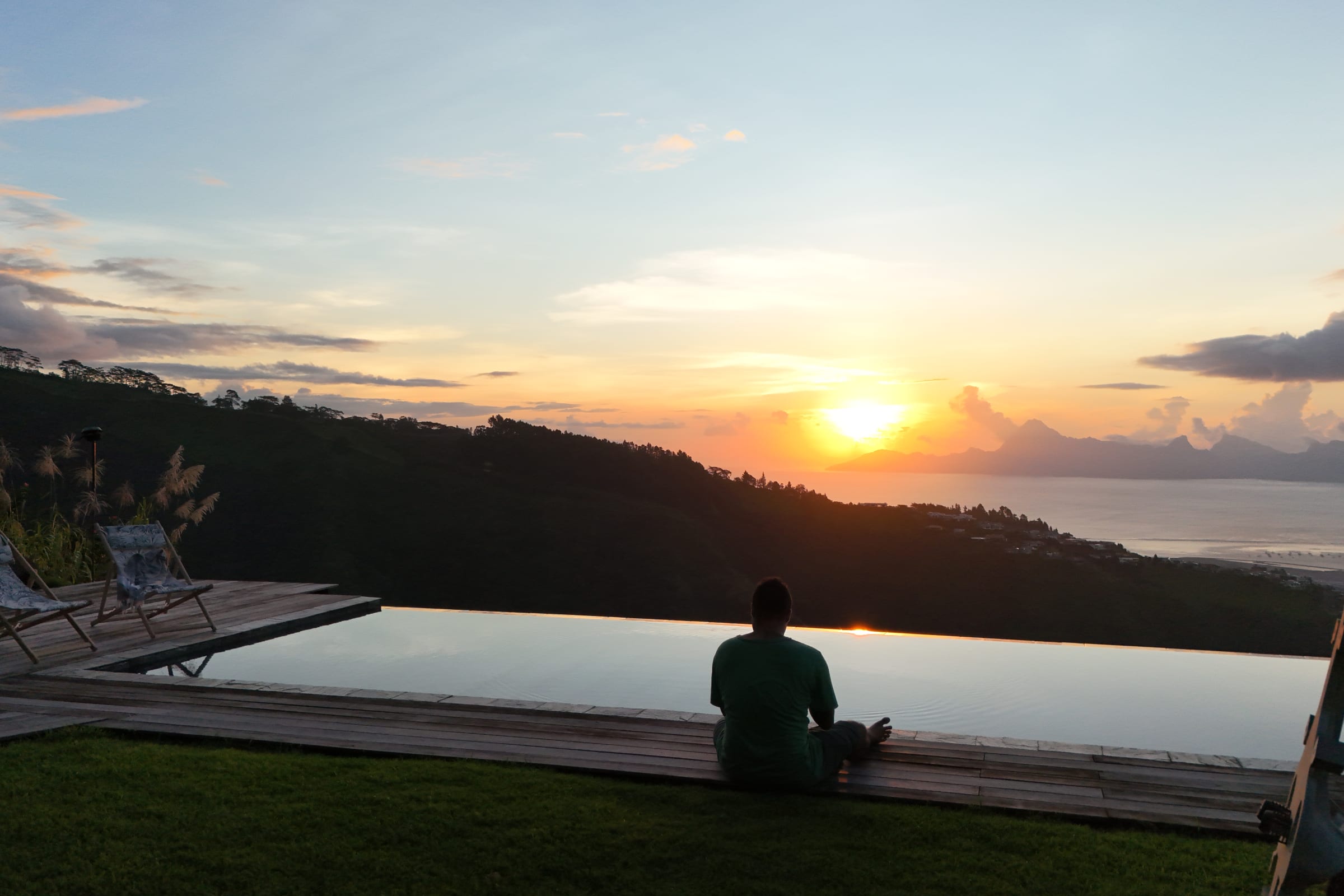The approximately 27 m² annex features a king-size bed, a fully equipped kitchen, a modern bathroom with shower, vanity unit, and toilet, as well as direct access to the infinity pool. From its terrace, you can enjoy breathtaking views of Moorea Island and the ocean.