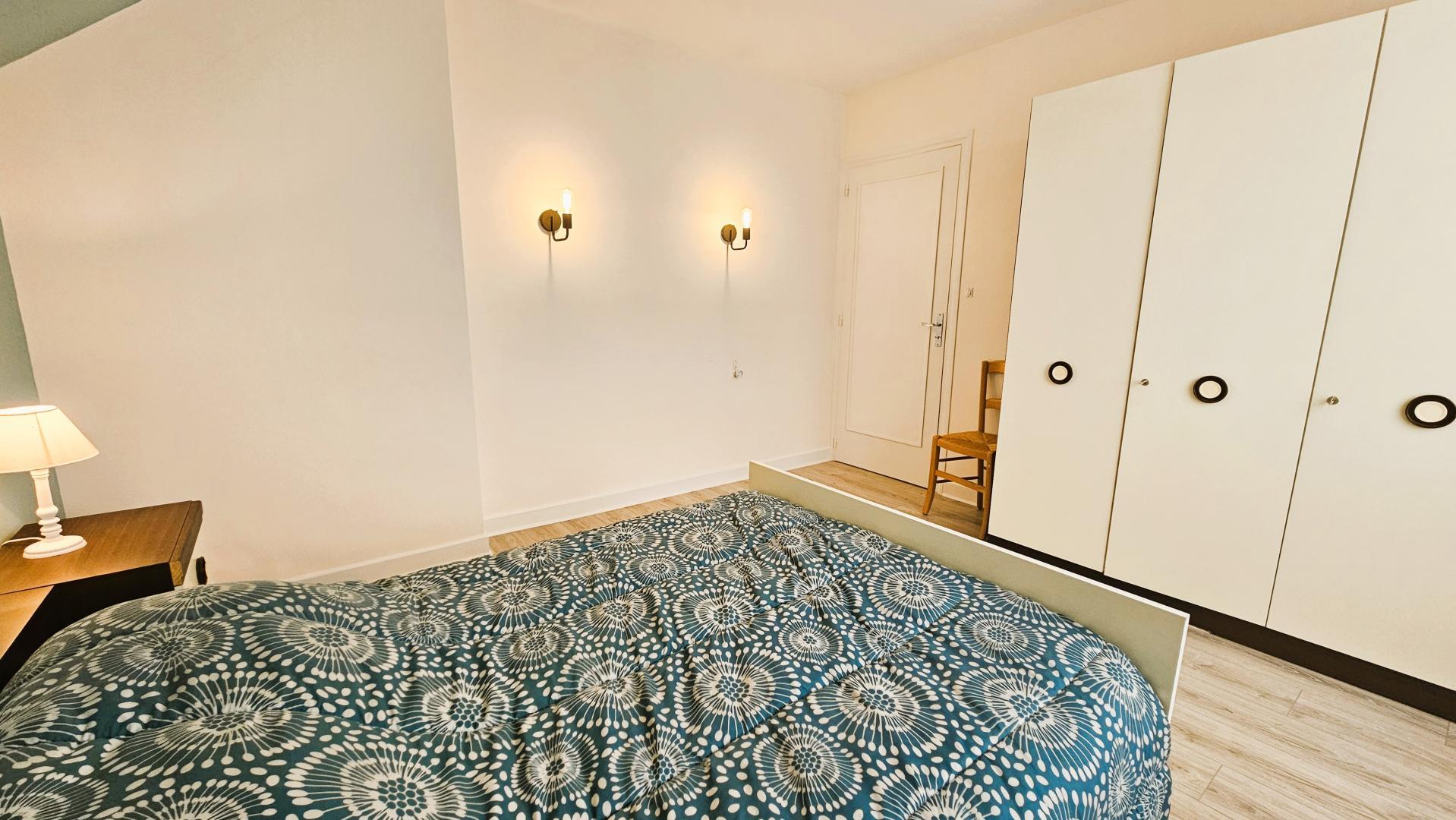 Across the hall, you'll discover a spacious kitchen, complete with a laundry room, fully equipped to prepare delicious meals during your stay. Opposite, a bathroom and separate toilet ensure your comfort.